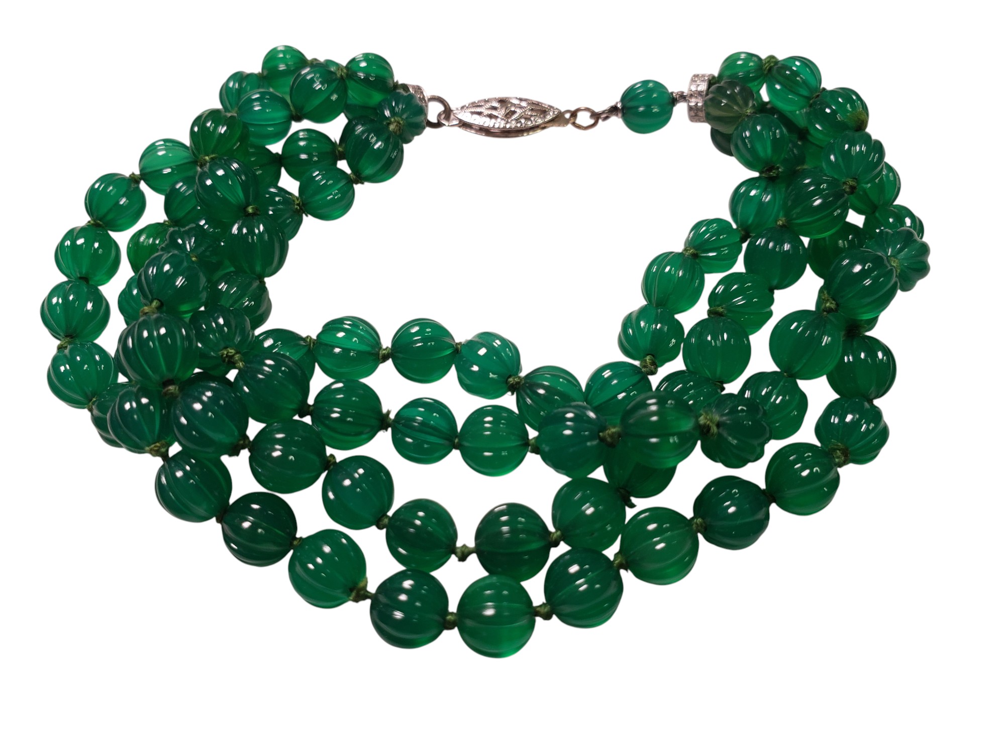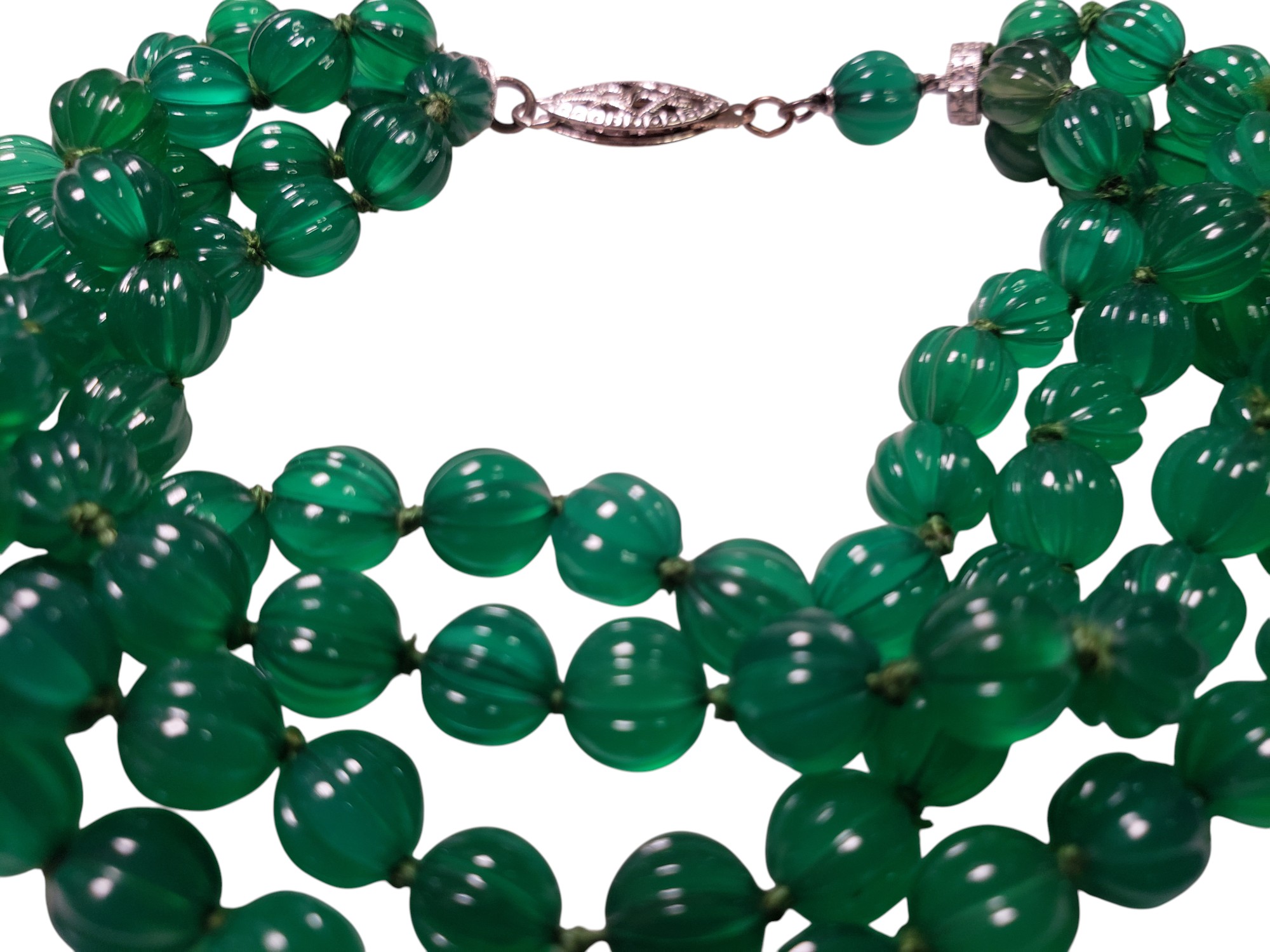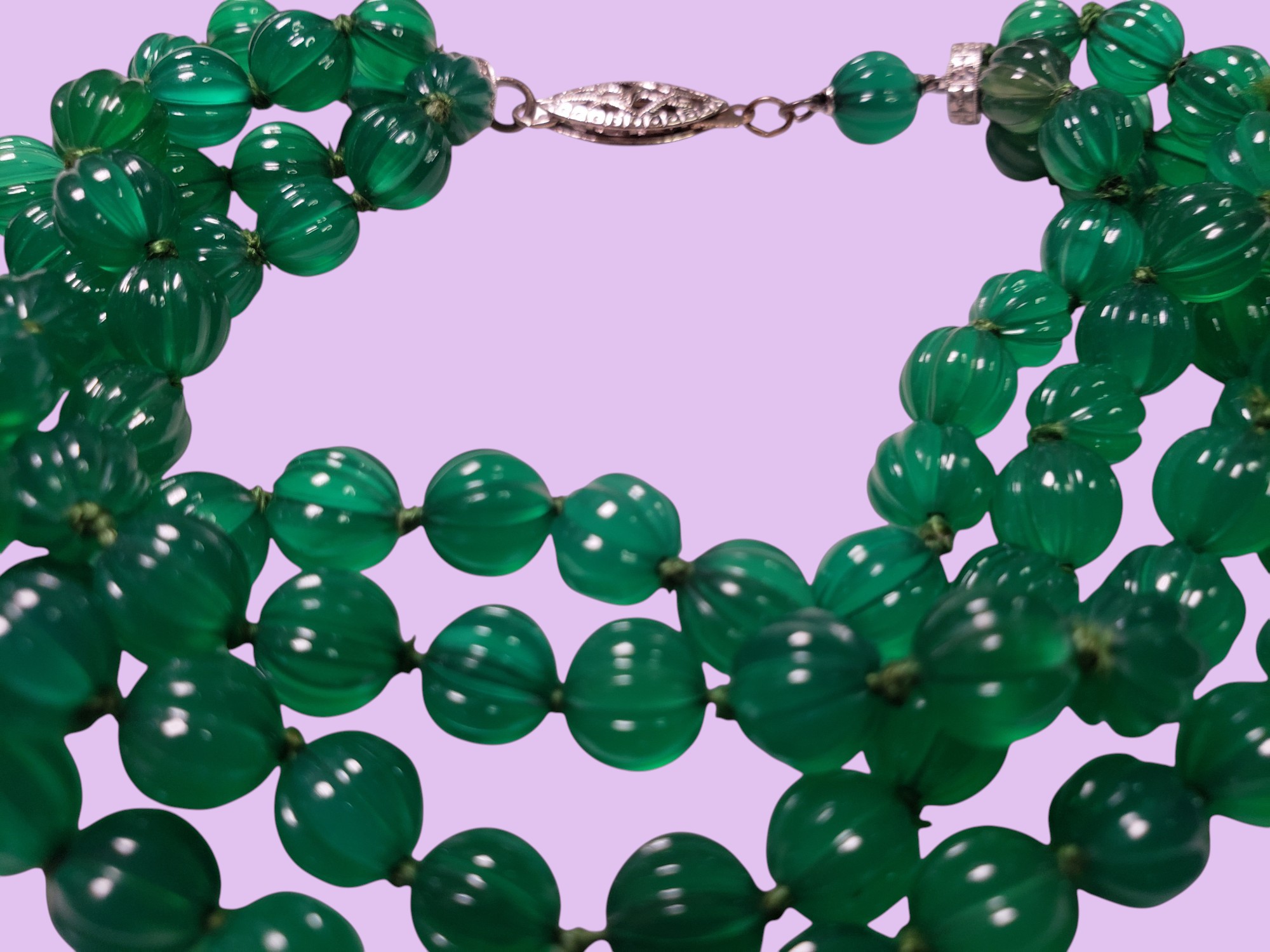 Stunning FRENCH Art Deco Faux Emerald Bracelet with Melon Shaped Beads. Four strands of gorgeous melon shaped faux emerald glass beads. Rhodium setting, clear rhinestone rondelles at both ends, delicate clasp. Measures 8.25″ long. The beads are about 0.25″ in diameter. Very well made. Unmarked. Excellent condition.