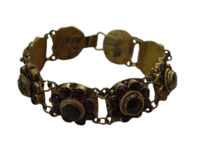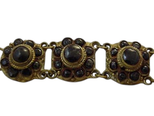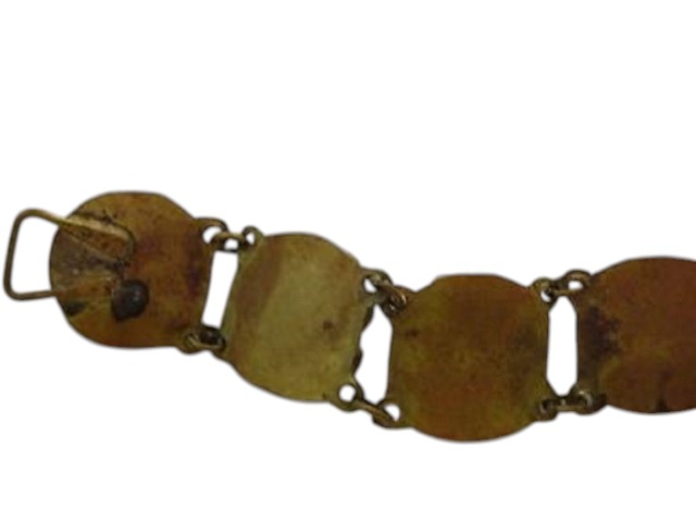 Beautiful most likely Czech brass bracelet. The brass setting is decorated by black stones. Unsigned. Somewhat crudely made. Measures 7″ long and 5/8″ wide. Condition is good, but a couple of the stones have chips (price is adjusted for it).