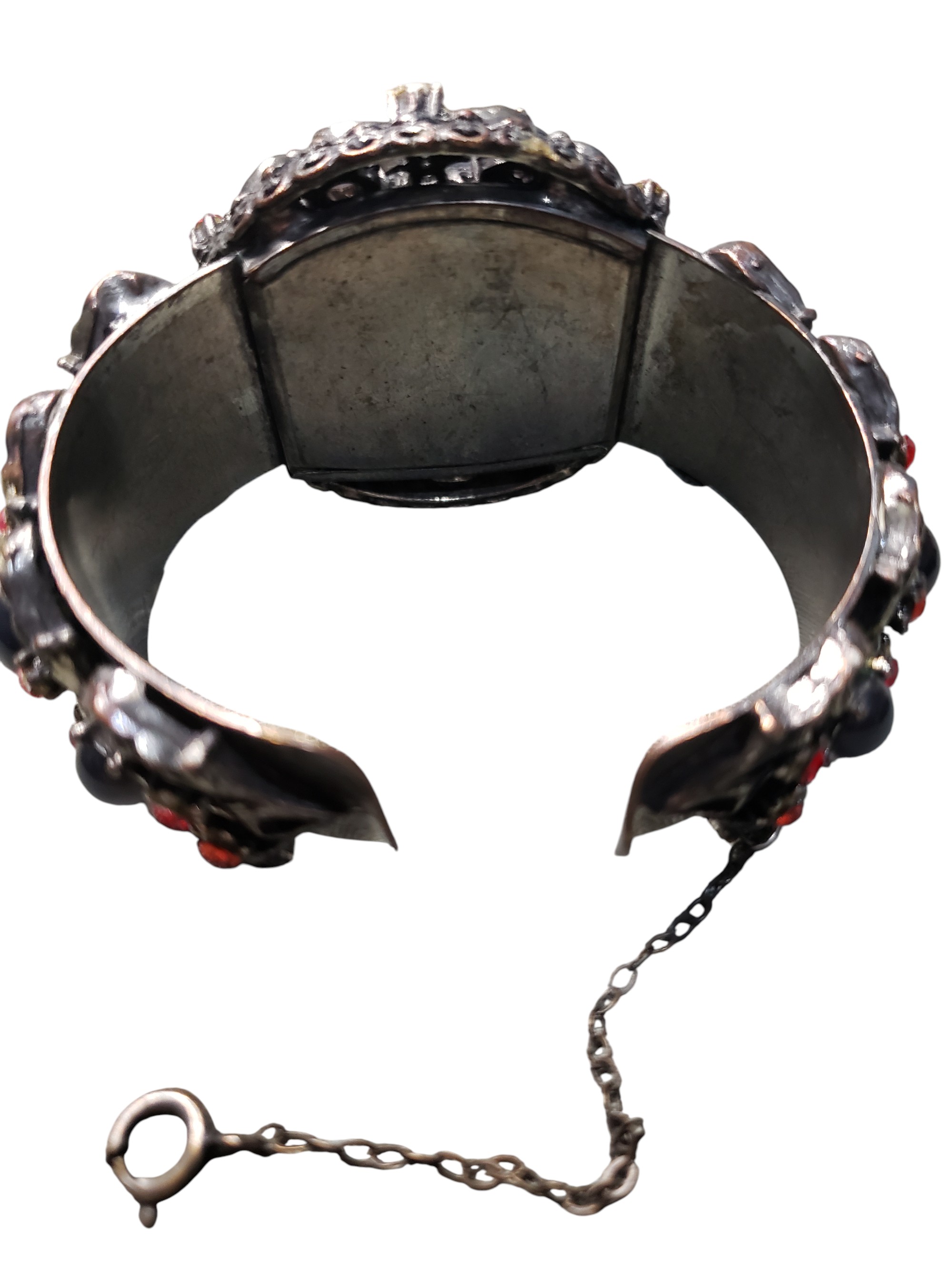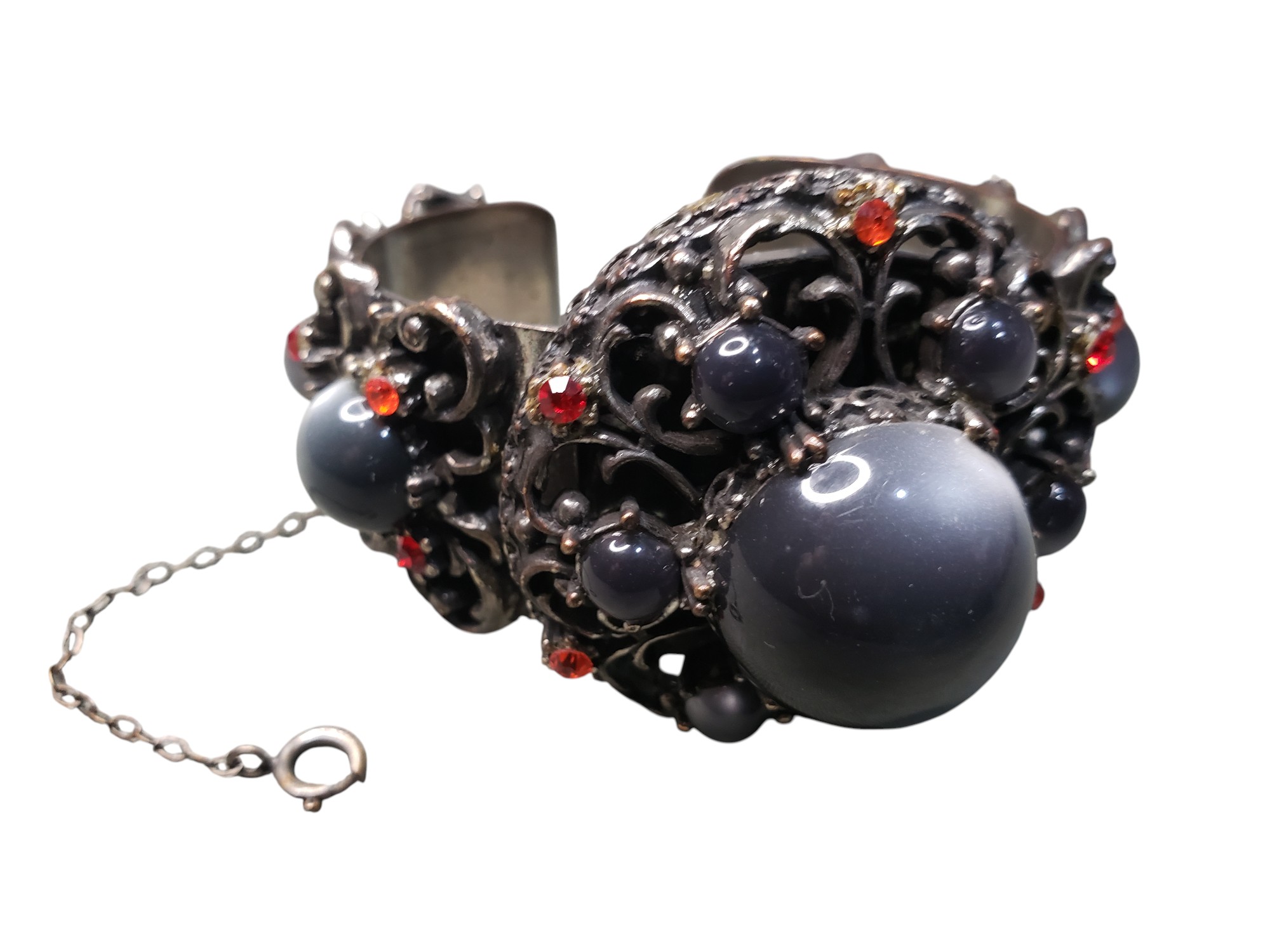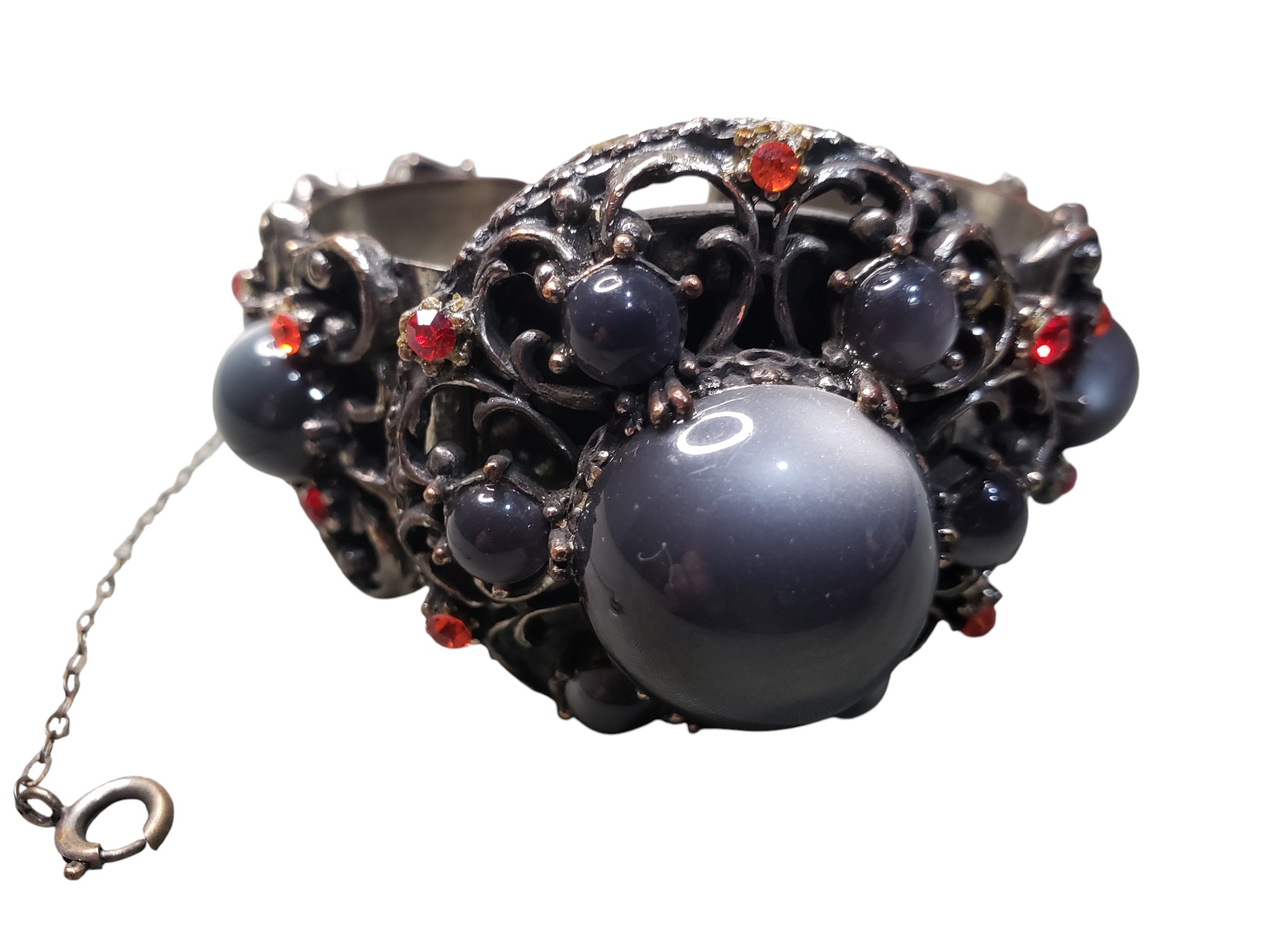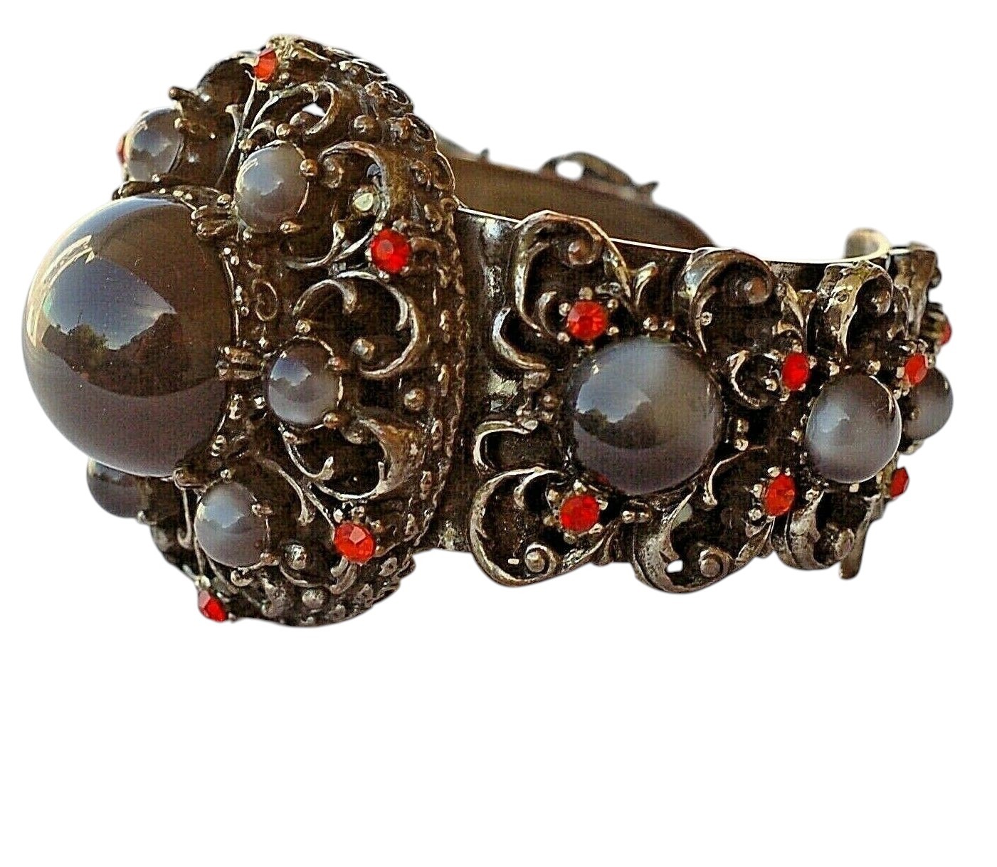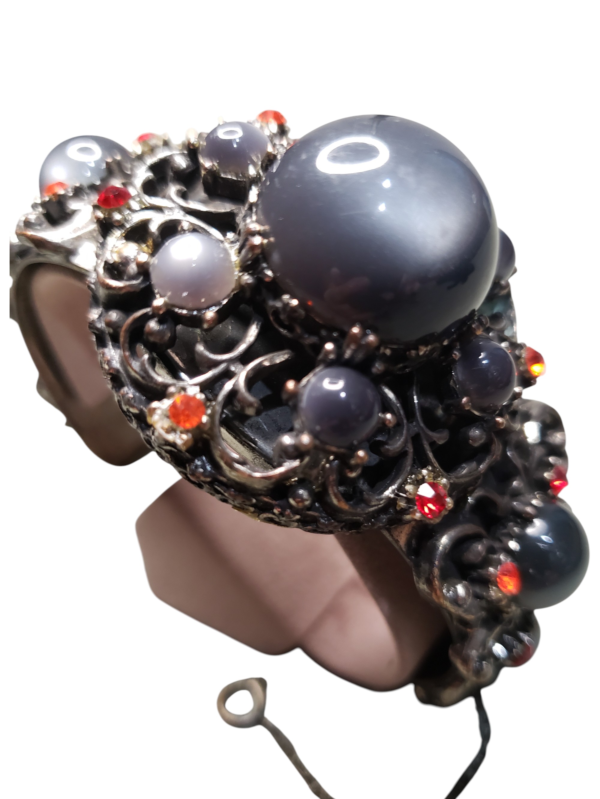 Chunky Gray Moonglow Double Hinged Cuff Bracelet. Gun metal setting with safety chain. Decorated by red/orange rhinestones. Beautiful detailing and raised scrollwork make this double hinged cuff bracelet a real show stopper! Huge raised centerpiece measures almost 2″ in diameter. Bracelet expands up to 7 1/2″ and has original chain guard. Unsigned. Excellent condition