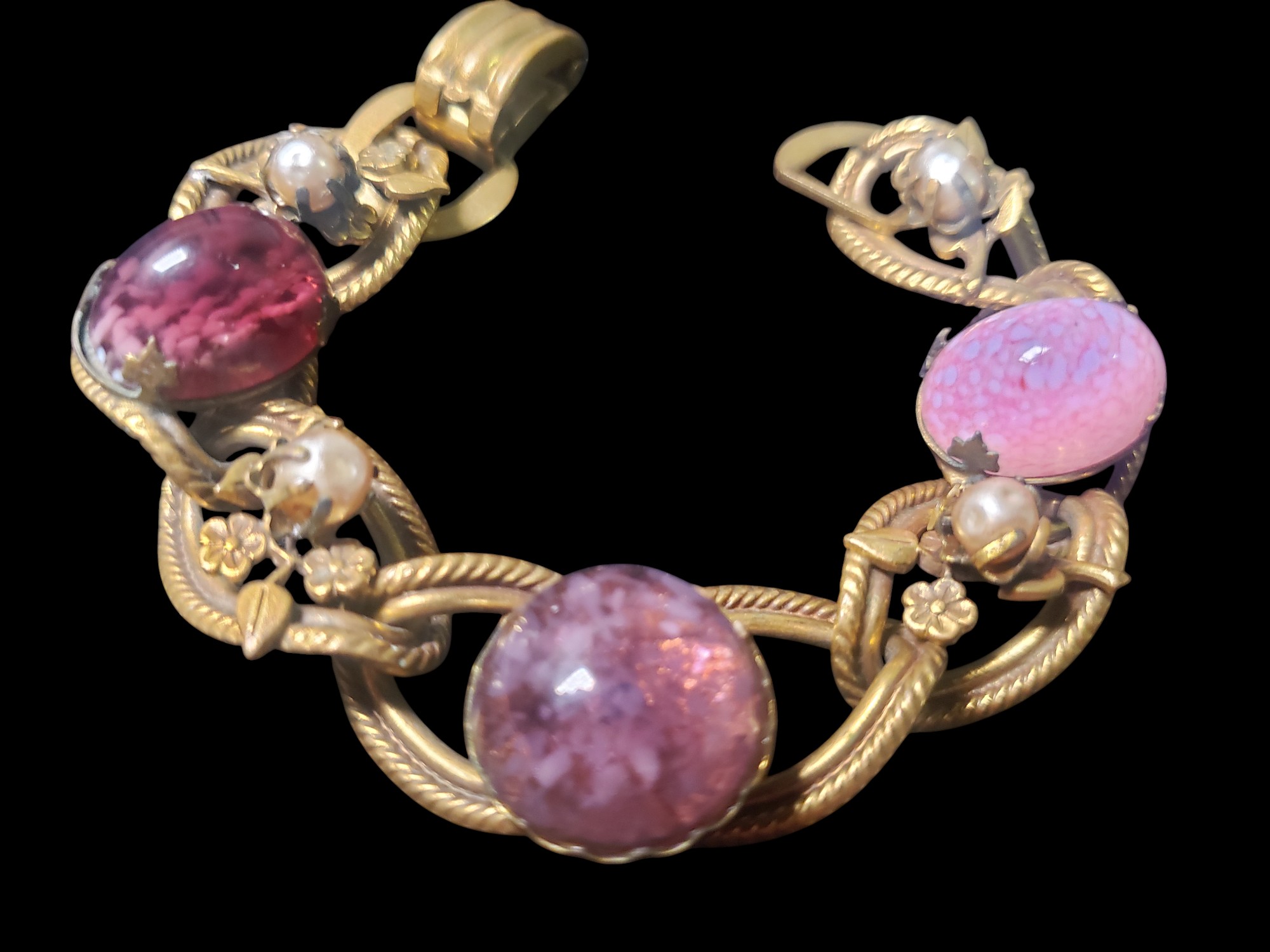 Gorgeous most likely German Purple /Pink Speckled Glass Cabochons Bracelet. Circa 1950. It is in great demand and sought out by the collectors. Ornate gilded brass setting with large purple and pink speckled glass cabochons and are adorned by small faux baroque pearls. The bracelet measures 7″ long and 0.75″ wide. It is not signed, but sometimes attributed to Henkel and Grosse. Excellent condition.