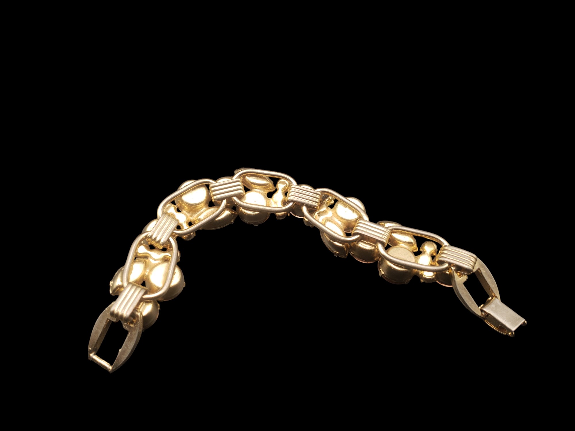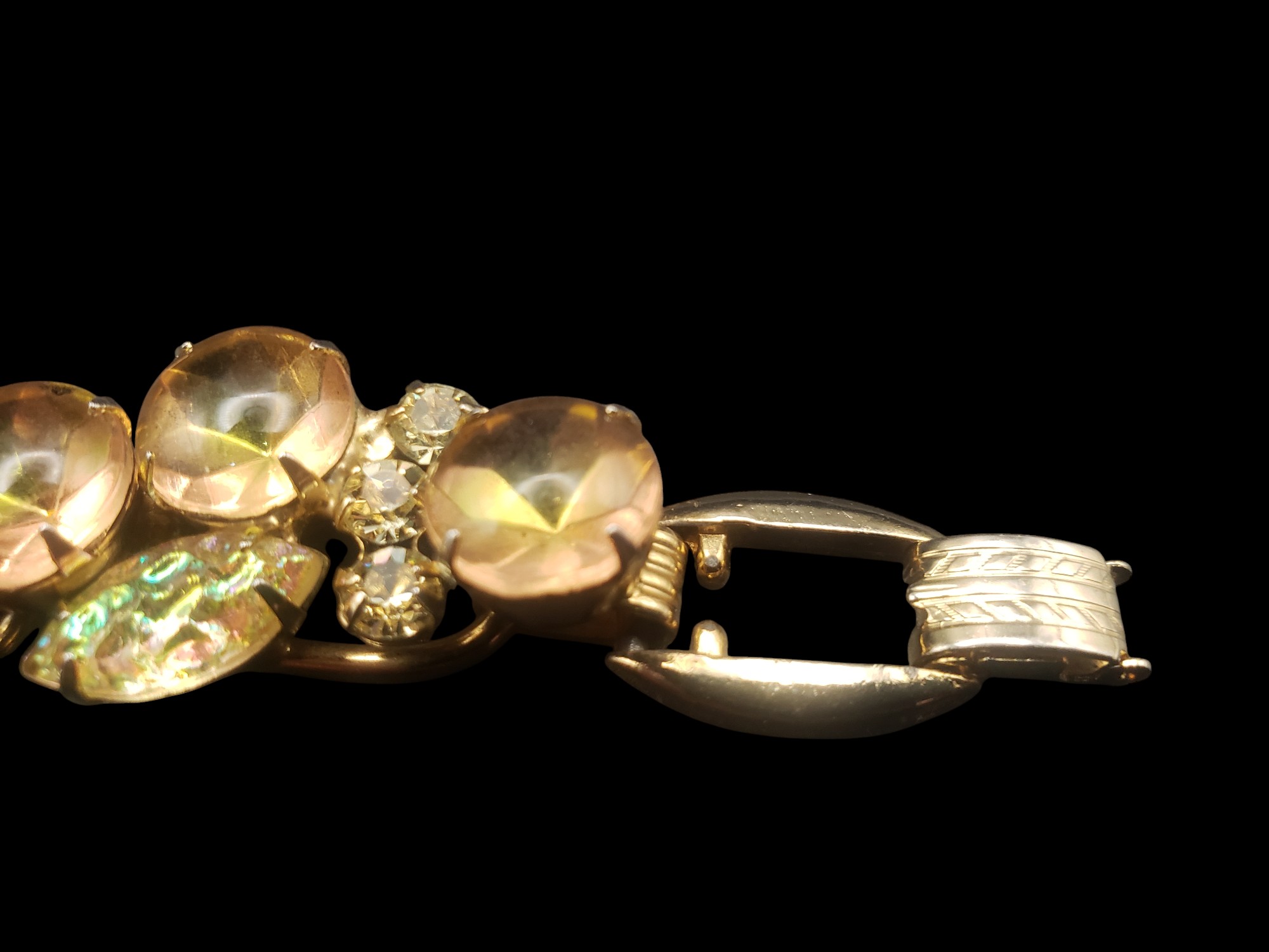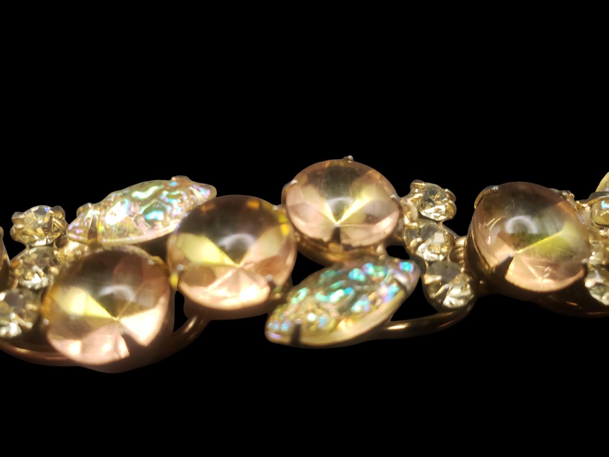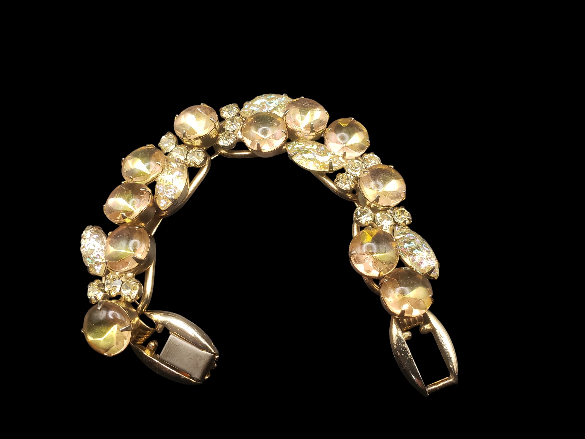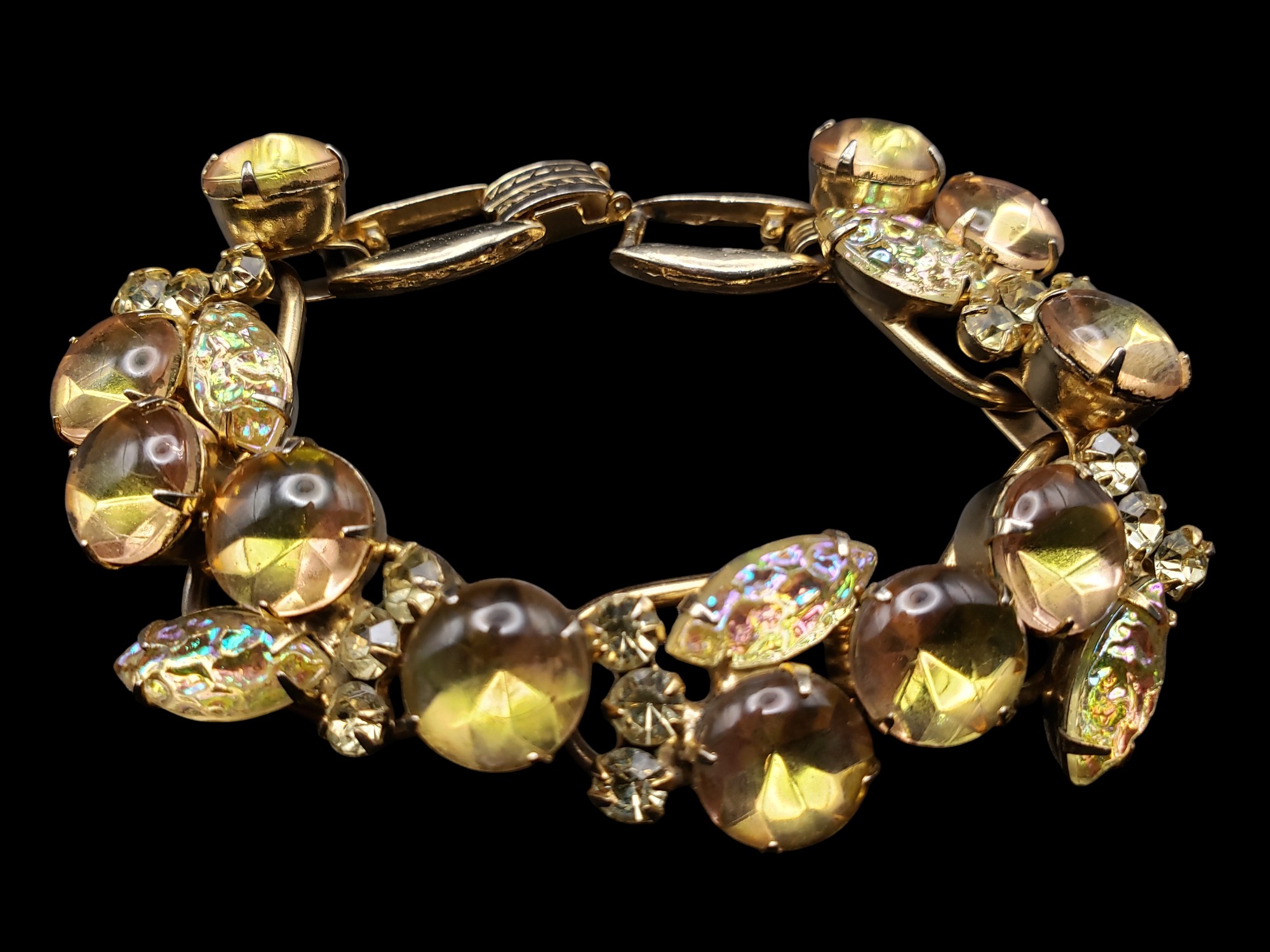 One of the Most Beautiful Juliana (DeLizza and Elster D&E) Rhinestone Bracelets. Gold tone with INCREDIBLE rhinestones – large cabochons with pink and green overtones, textured citrine marquise cut cabochons, accented by citrine rhinestones. Measures about 7.5″ long and 3/4″ wide. Excellent condition.