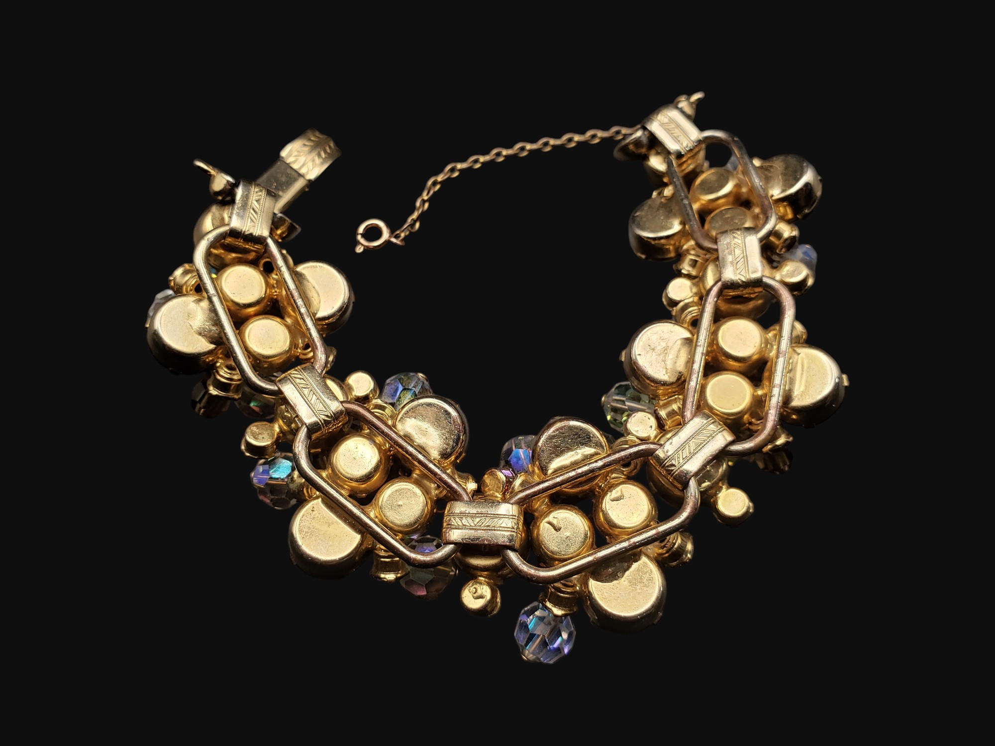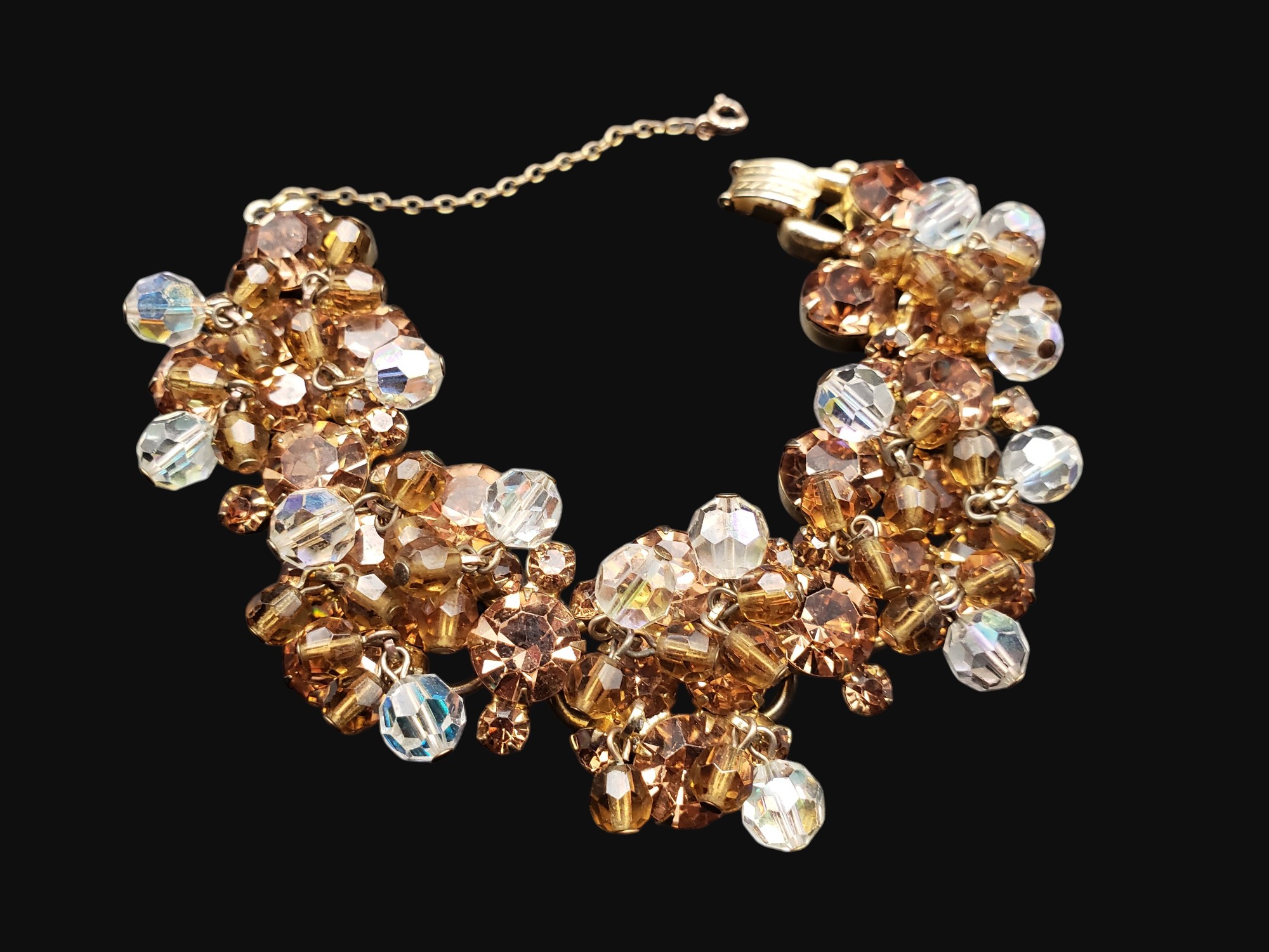 Fabulous Juliana (DeLizza and Elster D&E) Topaz and Aurora Borealis Rhinestone Bracelet. Gold tone setting with the most beautiful topaz rhinestones with Aurora Borealis crystal charms. Has a safety chain for added security. Measures over 7″ long and over 1″ wide. Unsigned. Excellent condition.