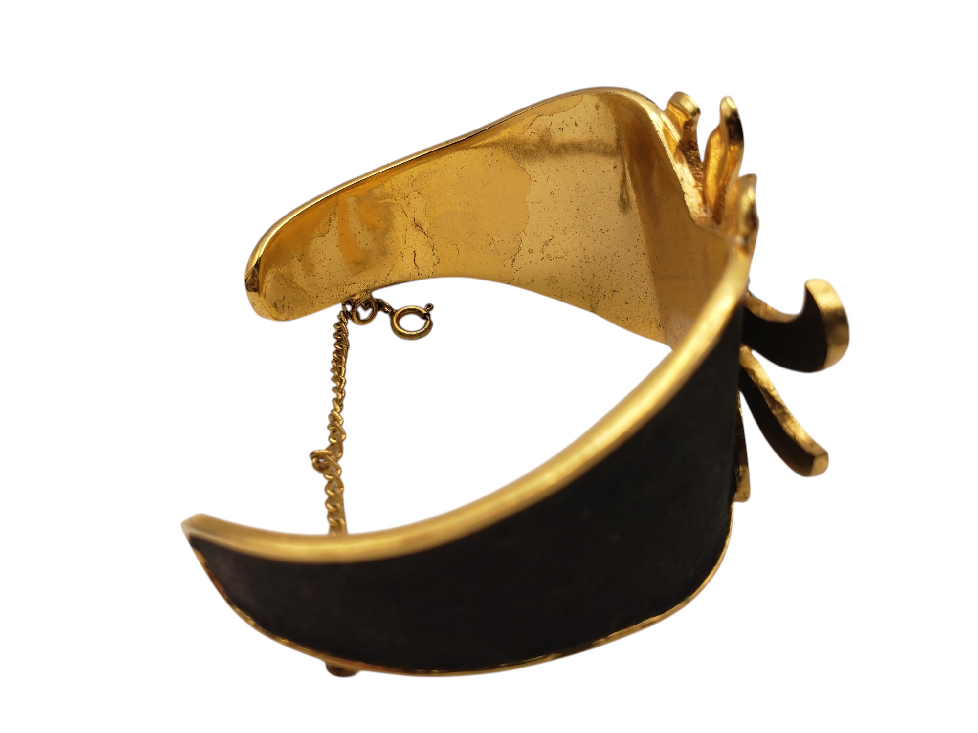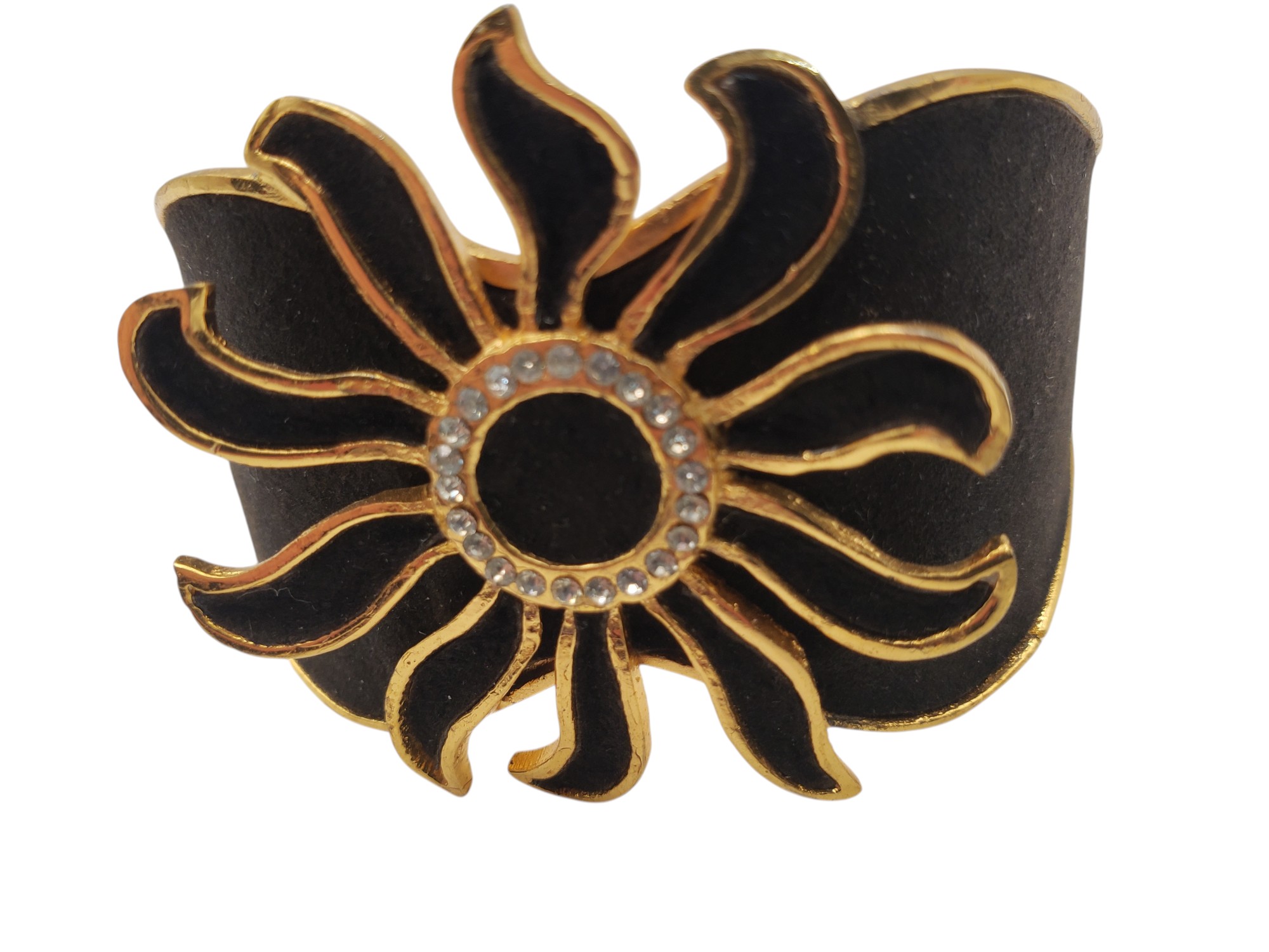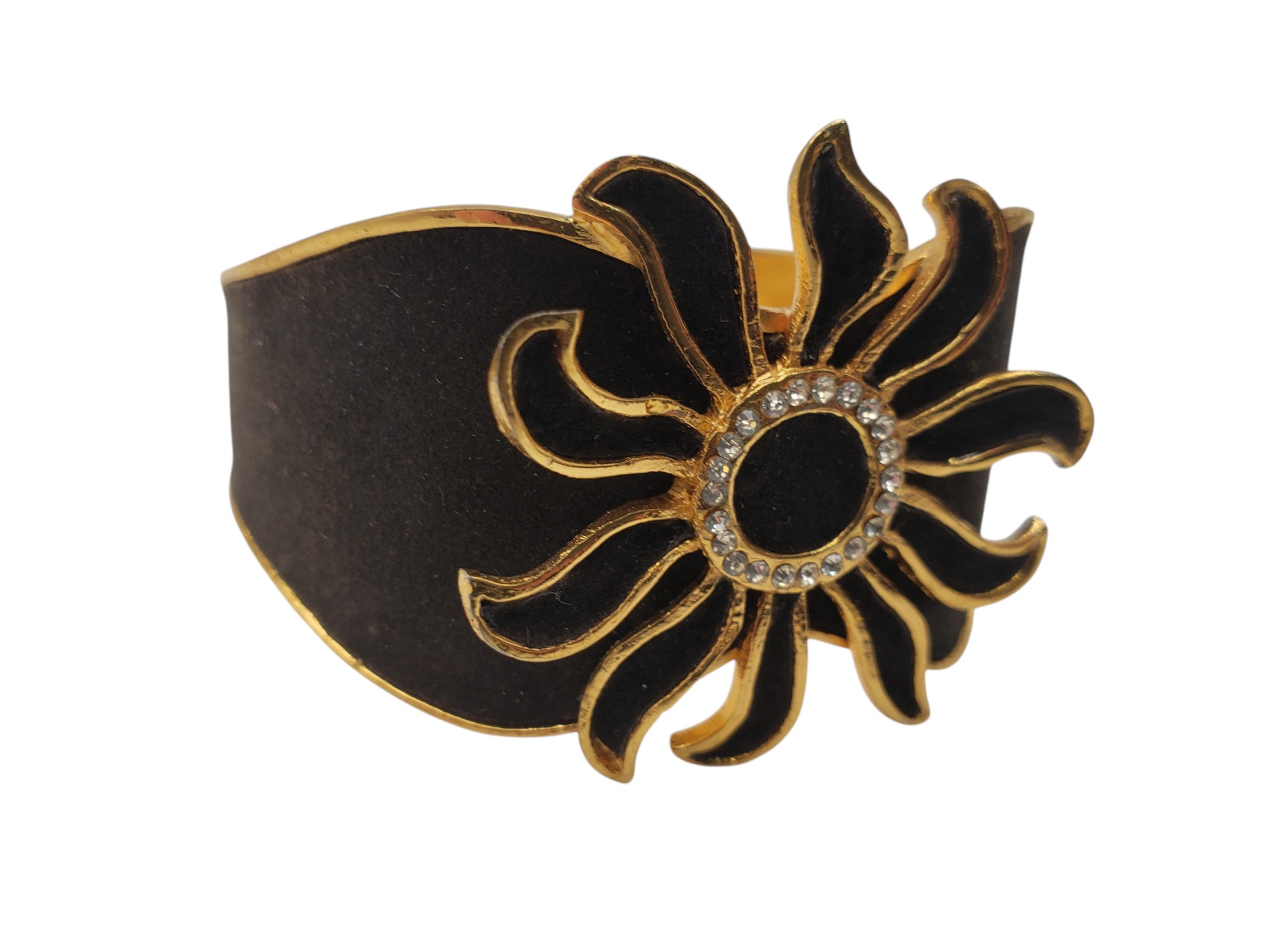 Fantastic haute couture French cuff bracelet. Gold tone setting covered by black suede and decorated by clear rhinestone accents. Measures 1.75″ wide. Has a safety chain. Marked “Made in France”. Attributed to famous French designer Henry à la Pensée. Excellent condition.