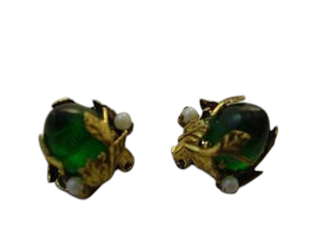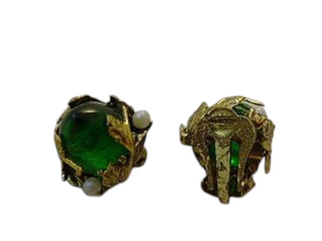 Gorgeous clip on earrings. Very ornate brass setting with HUGE tall pointed green glass cabochons and small faux pearls. Measures 5/8″ in diameter and are 1/2″ tall. Excellent condition.