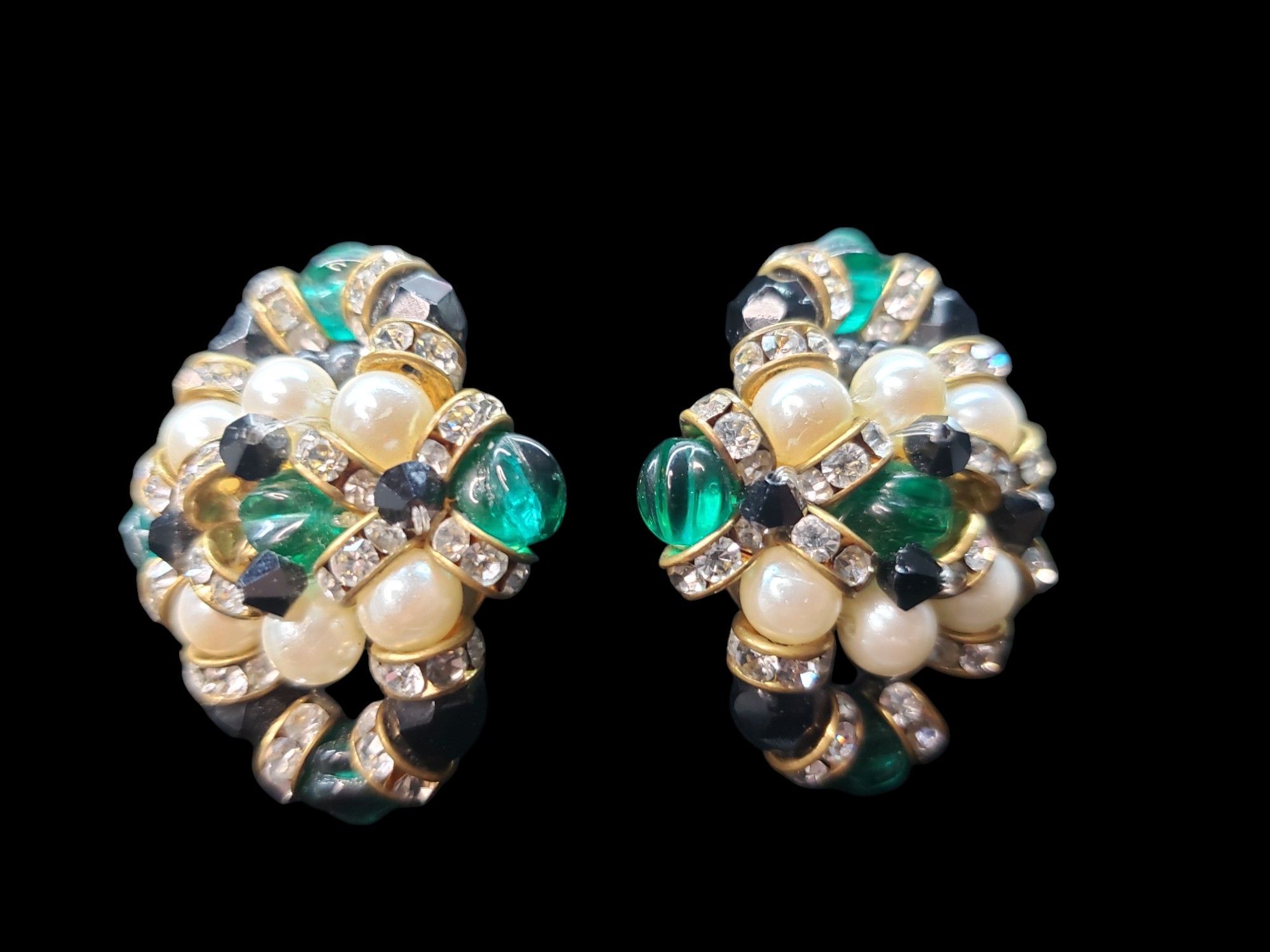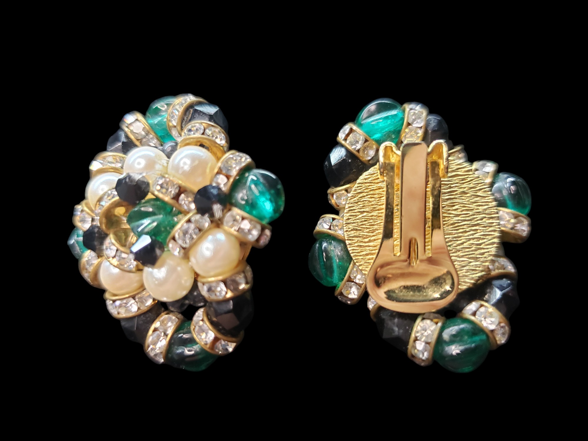 Large Vintage French / FRANCE Francois Montague Clip On Earrings. The earrings are not signed, but attributed by collectors to Francois Montague. A very well made and beautiful pair. Beautiful melon shaped glass emerald beads, together with French, faux pearls and clear rhinestone rondelles set in golden metal. Measure almost 1.5″ by 1.25″. Excellent condition.