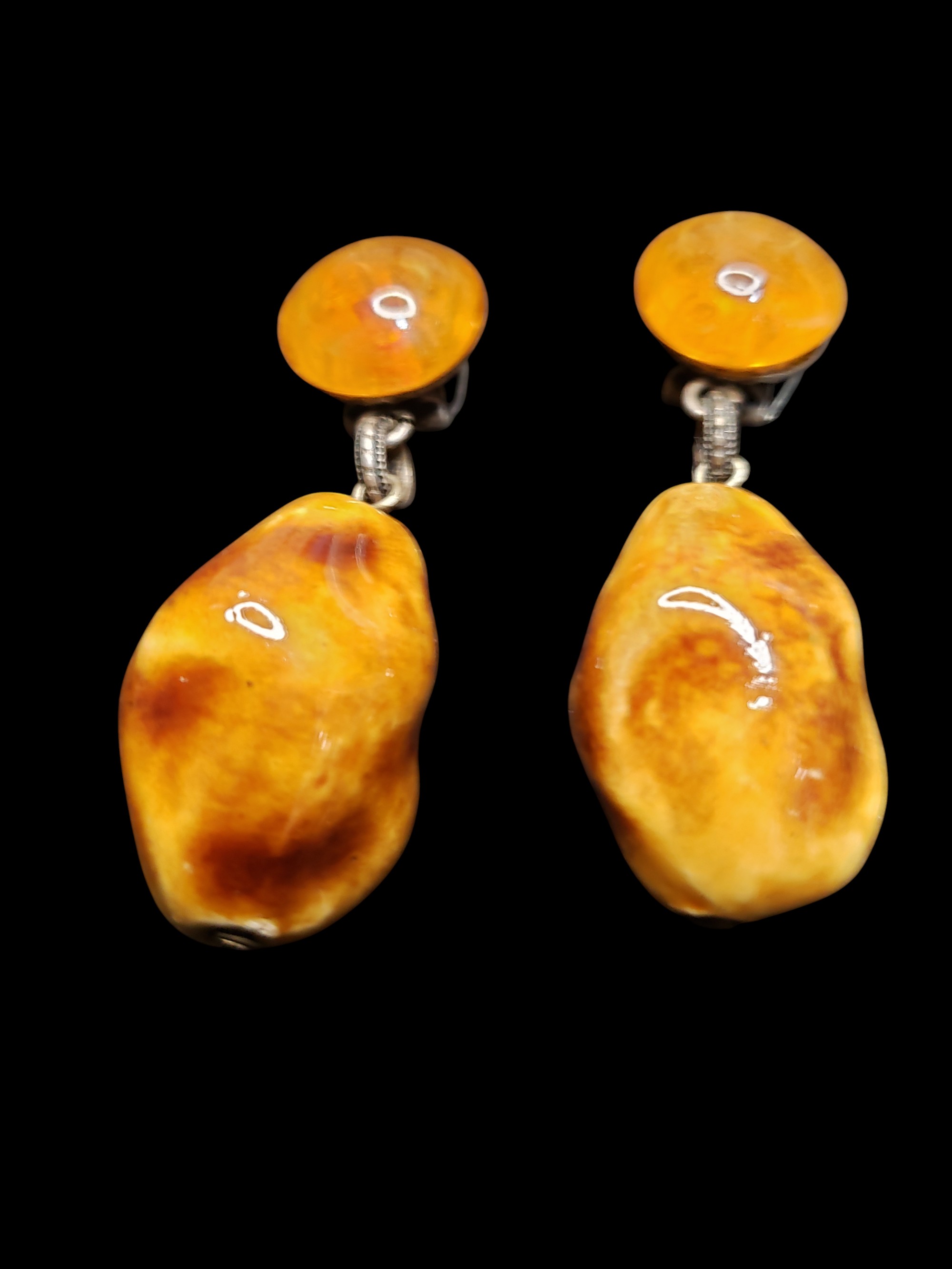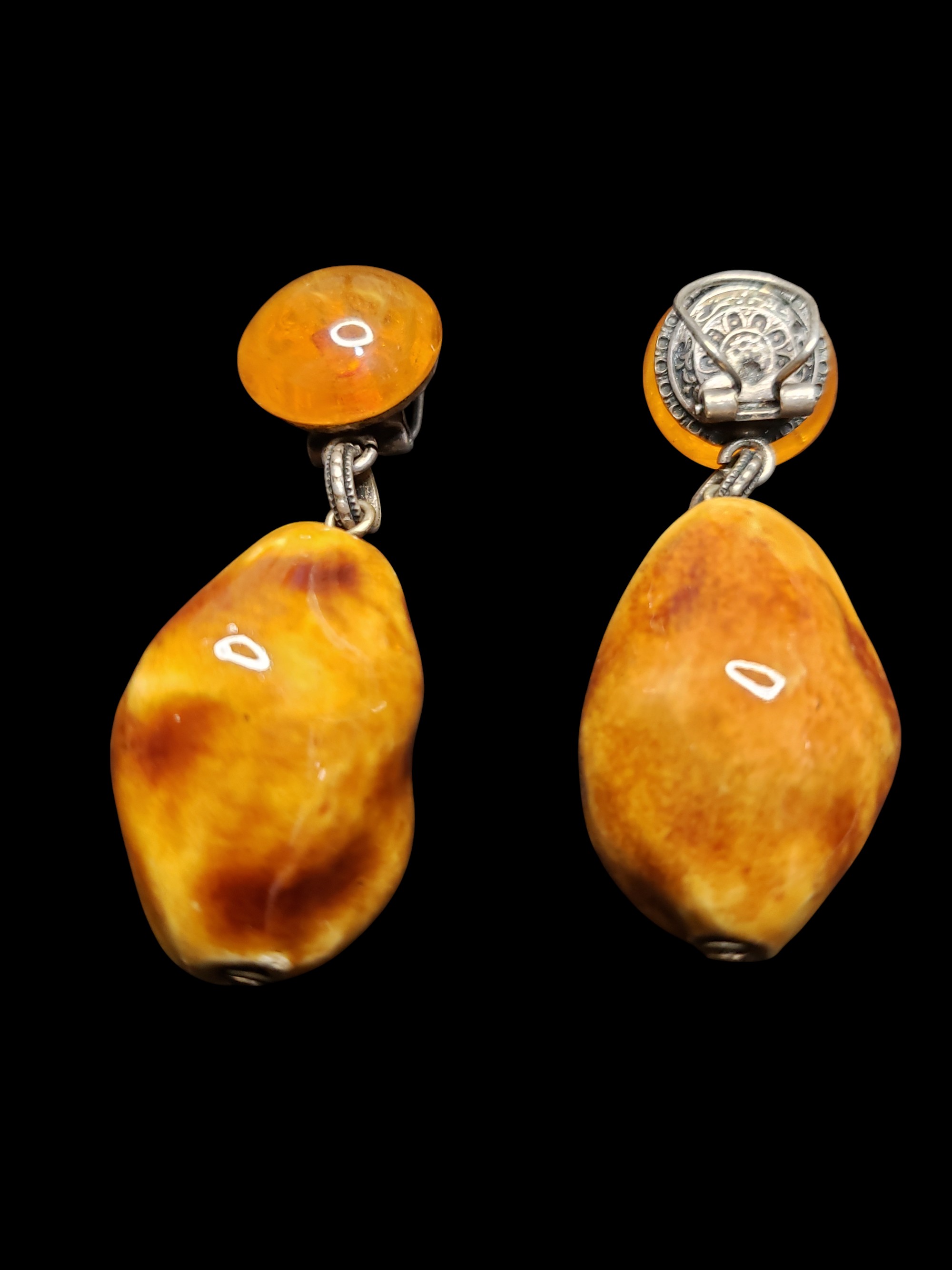Fantastic RARE French Louis Rousselet Amber Colored Pendant Earrings. The top is poured warm amber poured glass. The bottom appears to be ceramic, also in amber colors. Fabulous silver tone filigree setting. Only one of the clip is signed discretely Made in France. Measure 2.25″ by about 0.75″. Excellent condition.