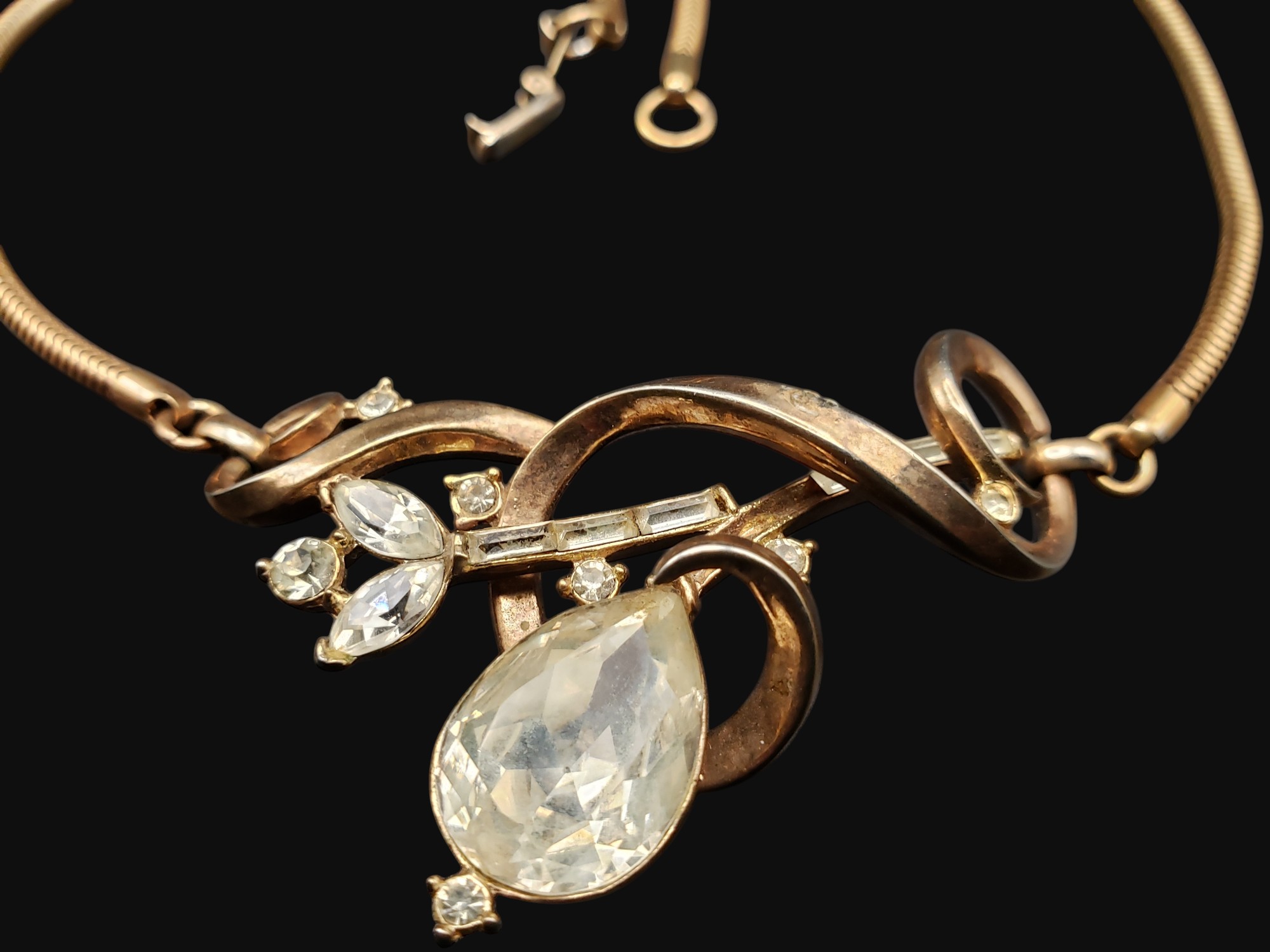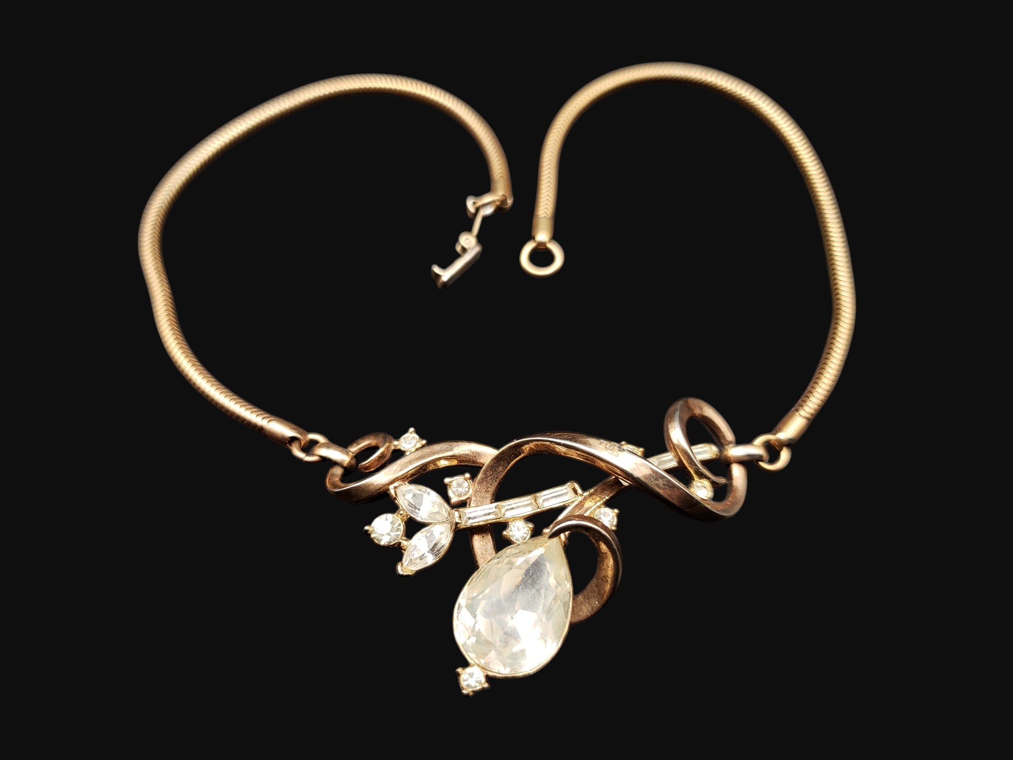 Lovely Signed Trifari Rhinestone Necklace. Golden setting with clear rhinestones. It measures 15.25″ long, the center is 2.5″ by 1.25″. Signed discretely on the clasp “Trifari”. Great condition with just slight yellowing of the large stone.