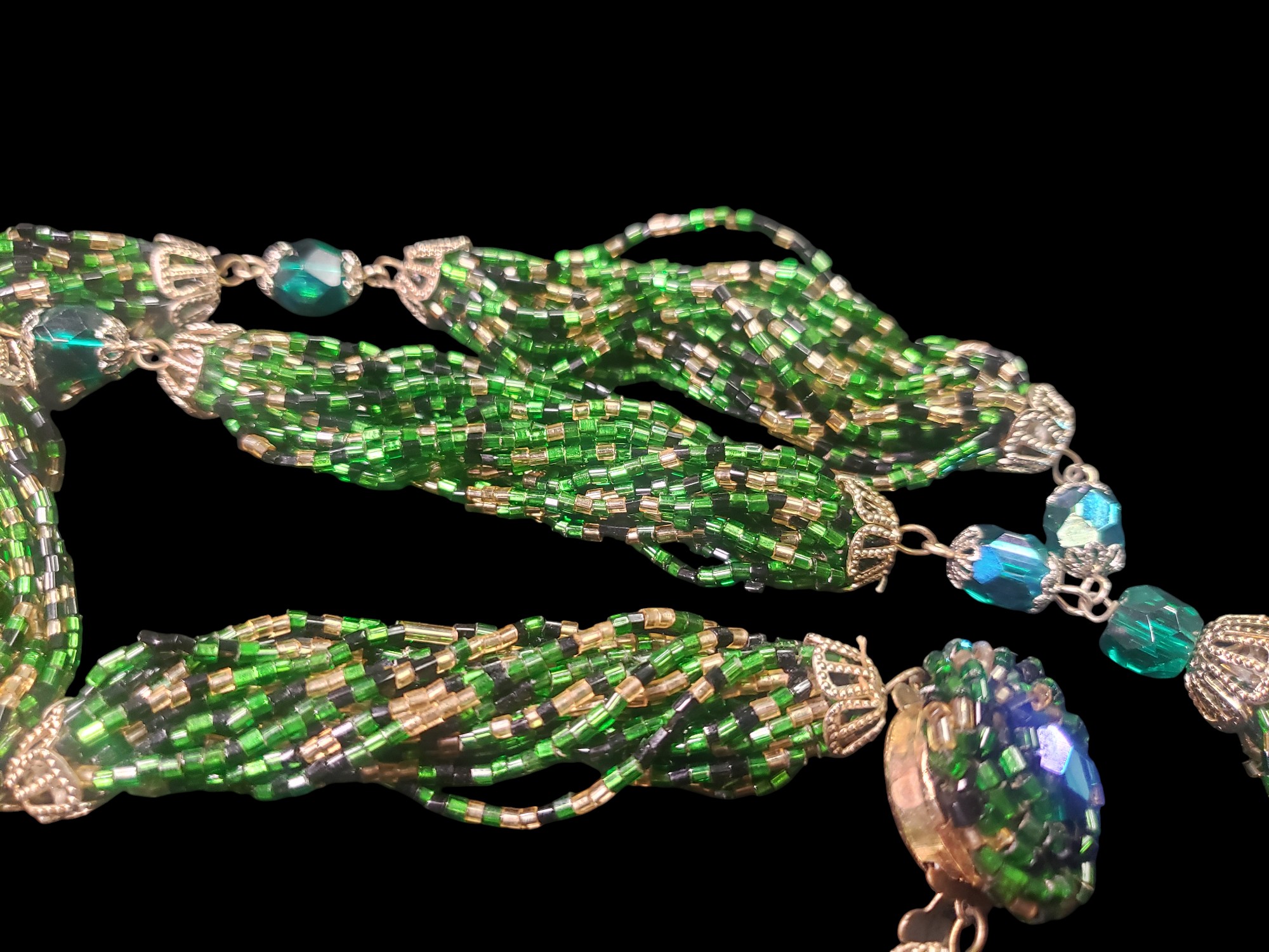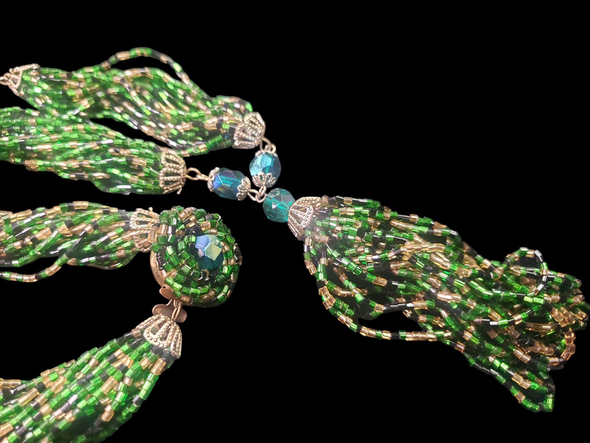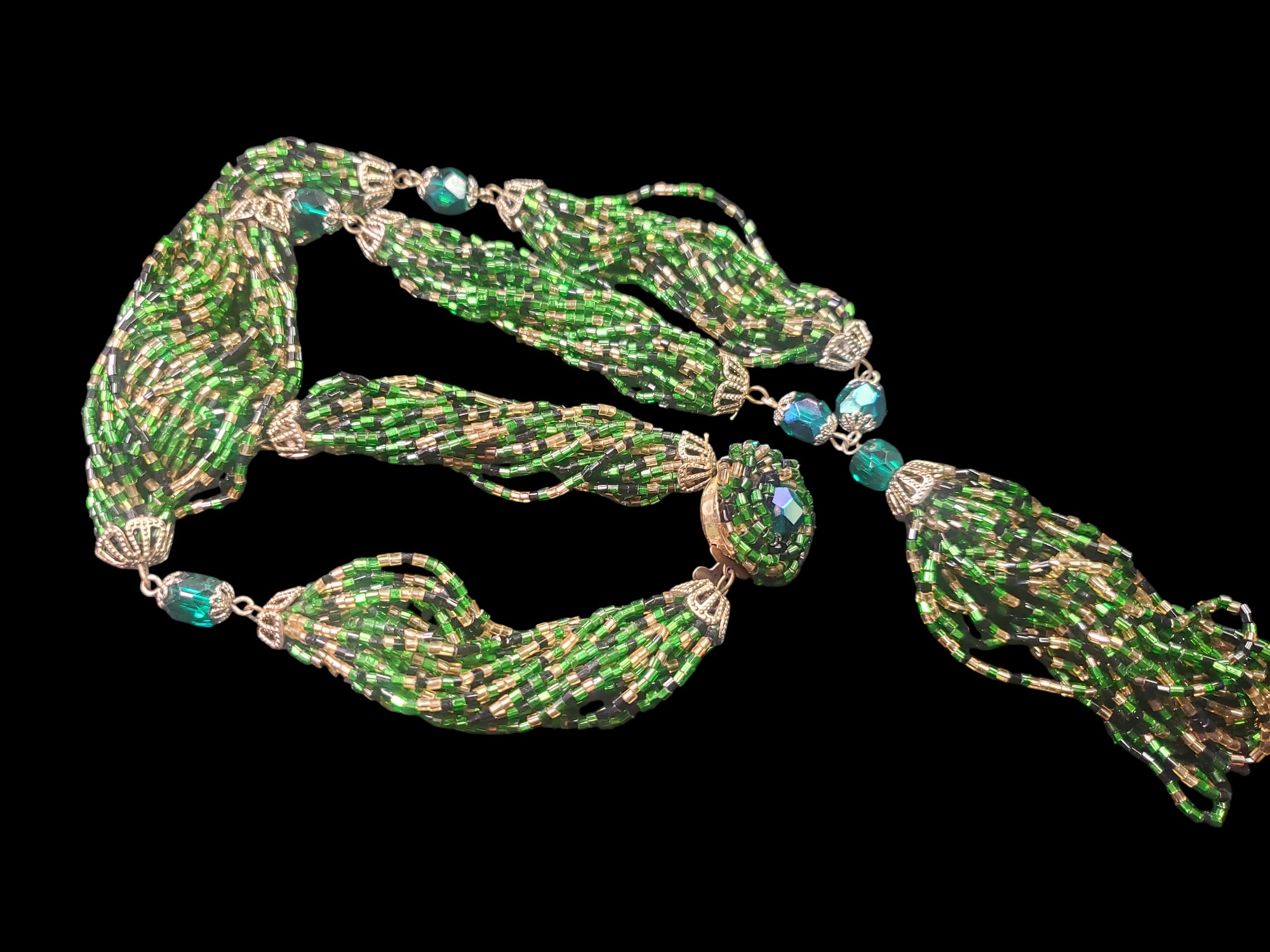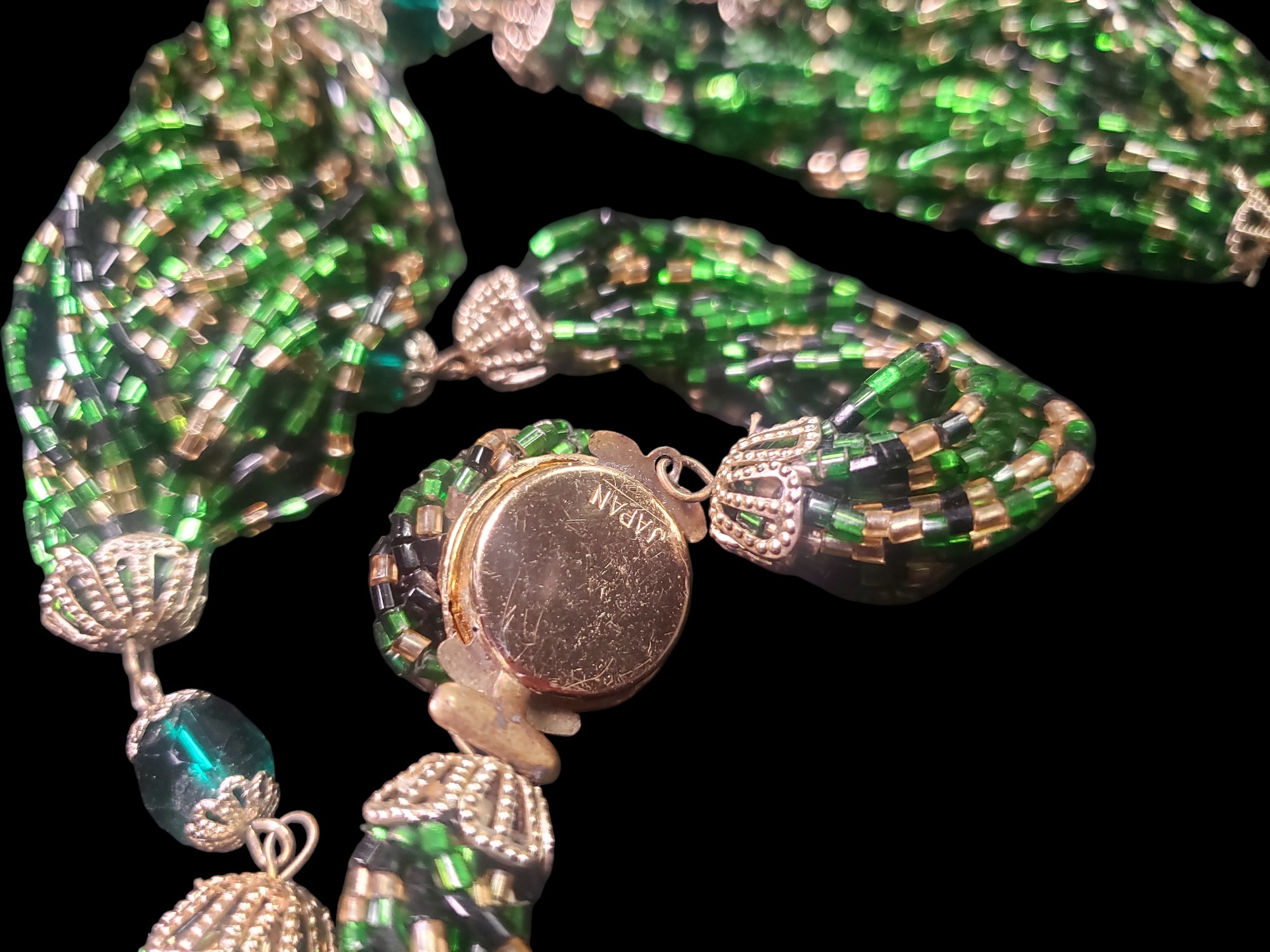 Beautiful necklace. Made of sections of multi strands of green and gold seed beads and separated by green Aurora Borealis crystals. Gold tone findings. Measures 26″ long with an additional 3.5″ tassel. Beaded clasp is also adorned by an AB crystal in the center. Signed “Japan”. Excellent condition.