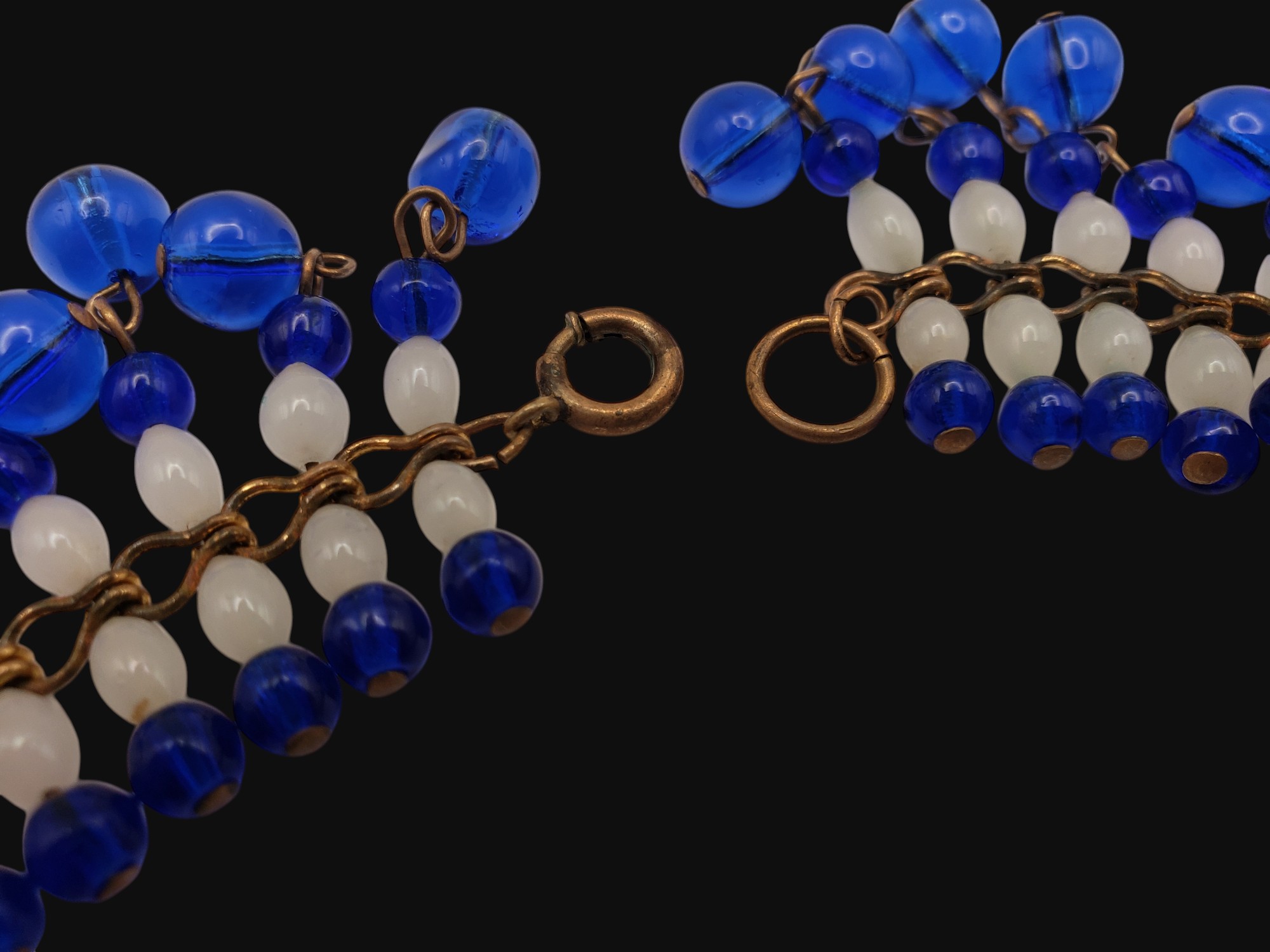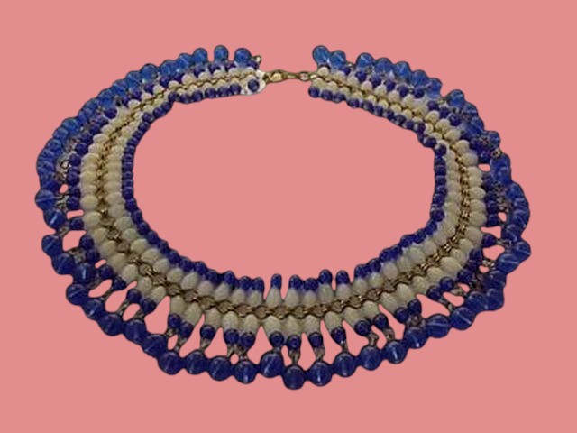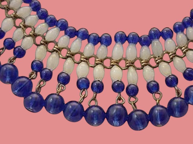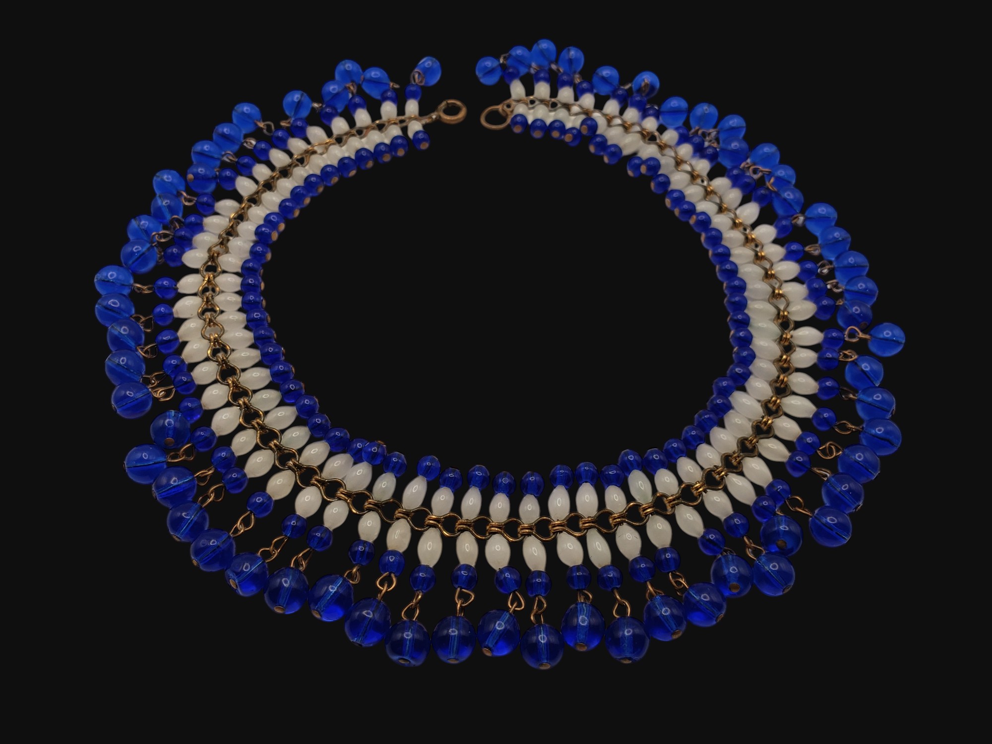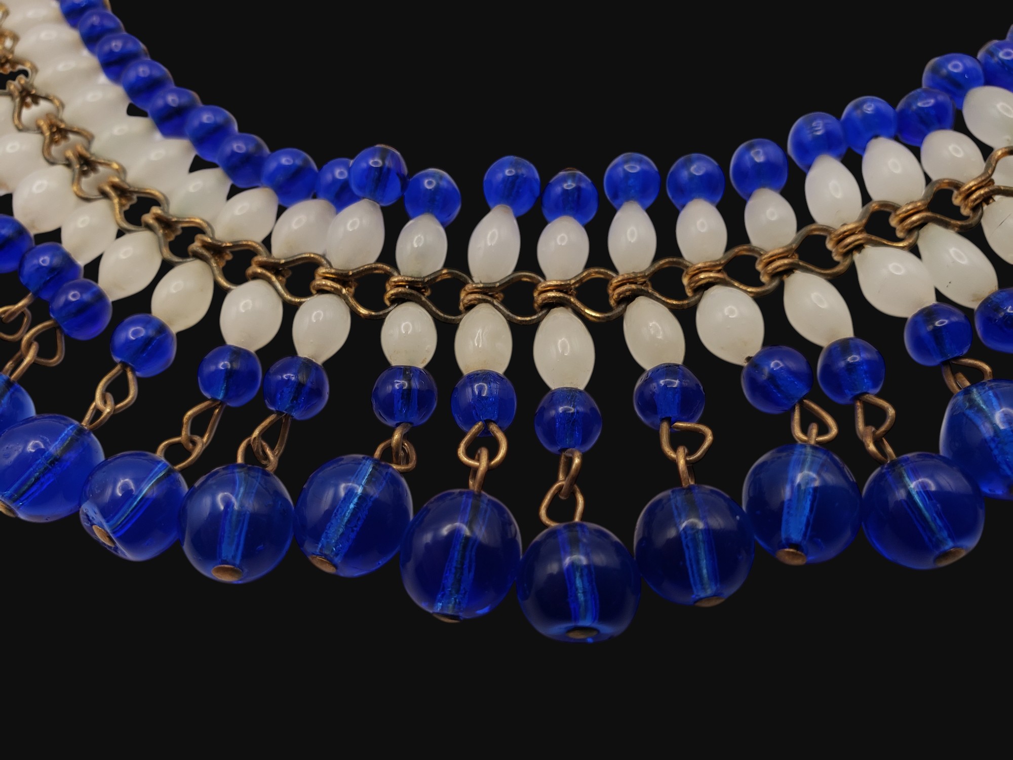 Marvelous Czech collar necklace. Brass chain with royal blue (the color is so intense!) and opaque white beads. Necklace is 16″ long and 1.5″ wide. Excellent condition.