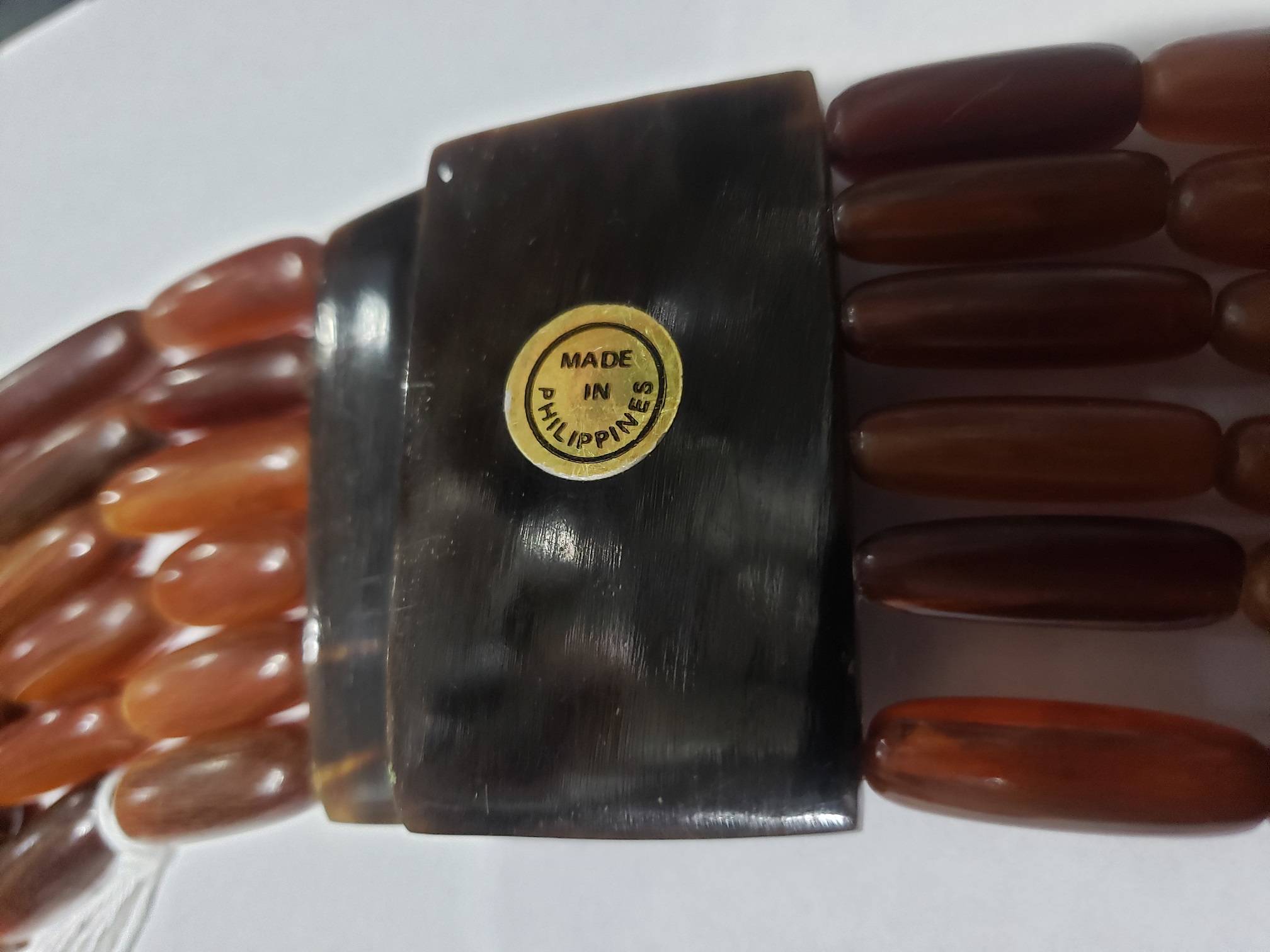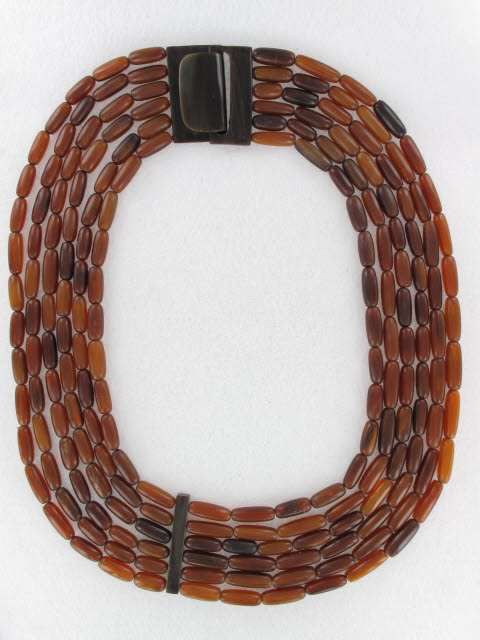 HUGE Outstanding Gerda Lynggaard for MONIES collar necklace. Six strands of horn beads with a fantastic large horn clasp clasp and bar. Very chic! Measures 26″ long and 2″ wide. The golden paper tag on the back reads “Made in Philippines”, but we know it’s the fabulous Gerda Lynggaard for MONIES. Excellent condition.