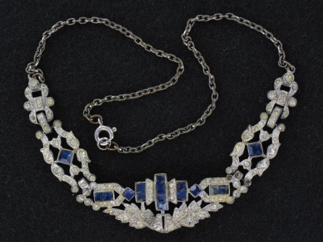 Beautiful Art Deco Bib Necklace. Pot metal setting with faux sapphires and clear crystal rhinestones. The center is suspended on silver tone chains. Measures 16″ long. The center is 5″ by 0.75″. Very good condition.