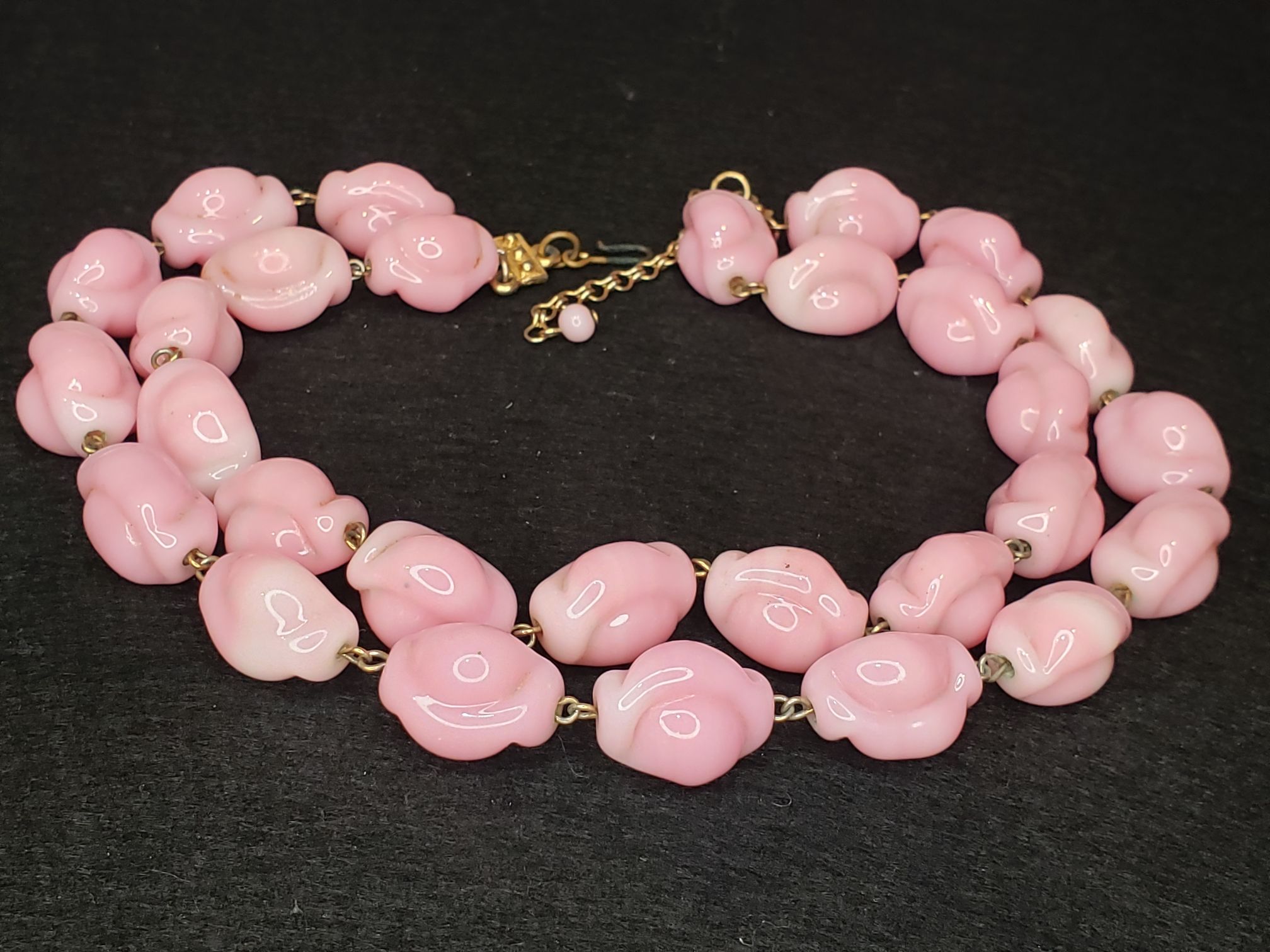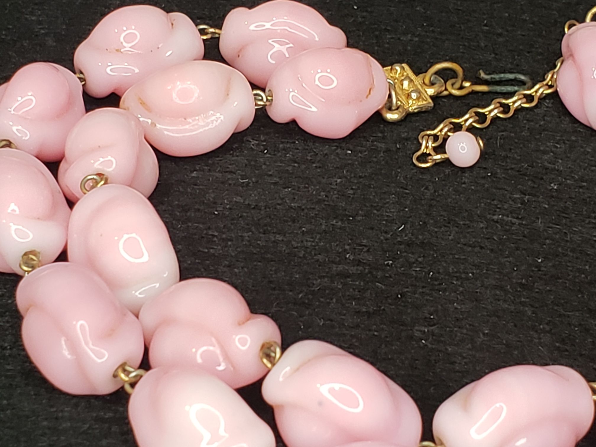 Heavy pink art glass double strand necklace. The beads are large heavy and absolutely gorgeous. Measures 16.5″ long (on the shorter strand). Each bead is over 3/4″ long. Excellent condition.