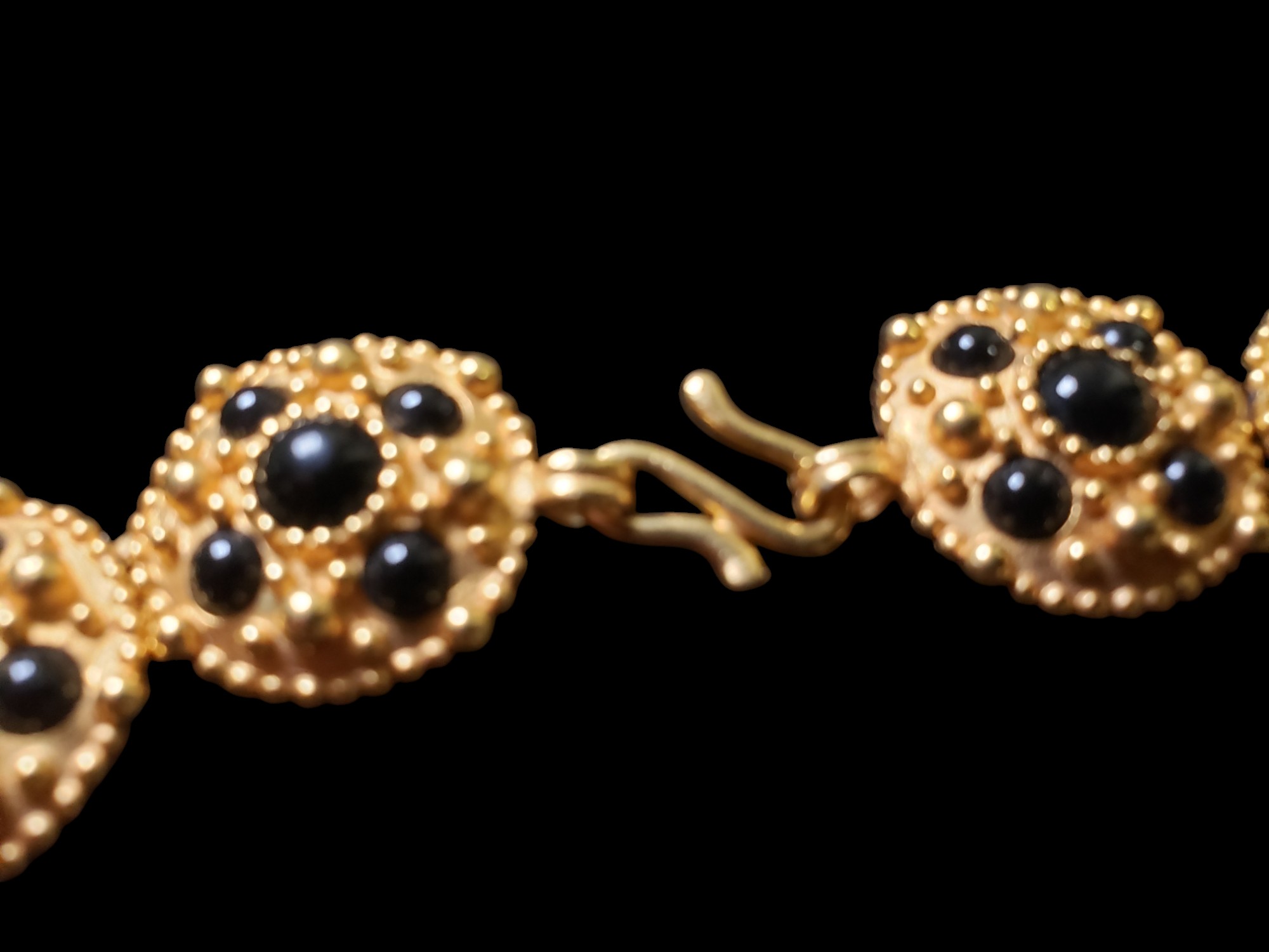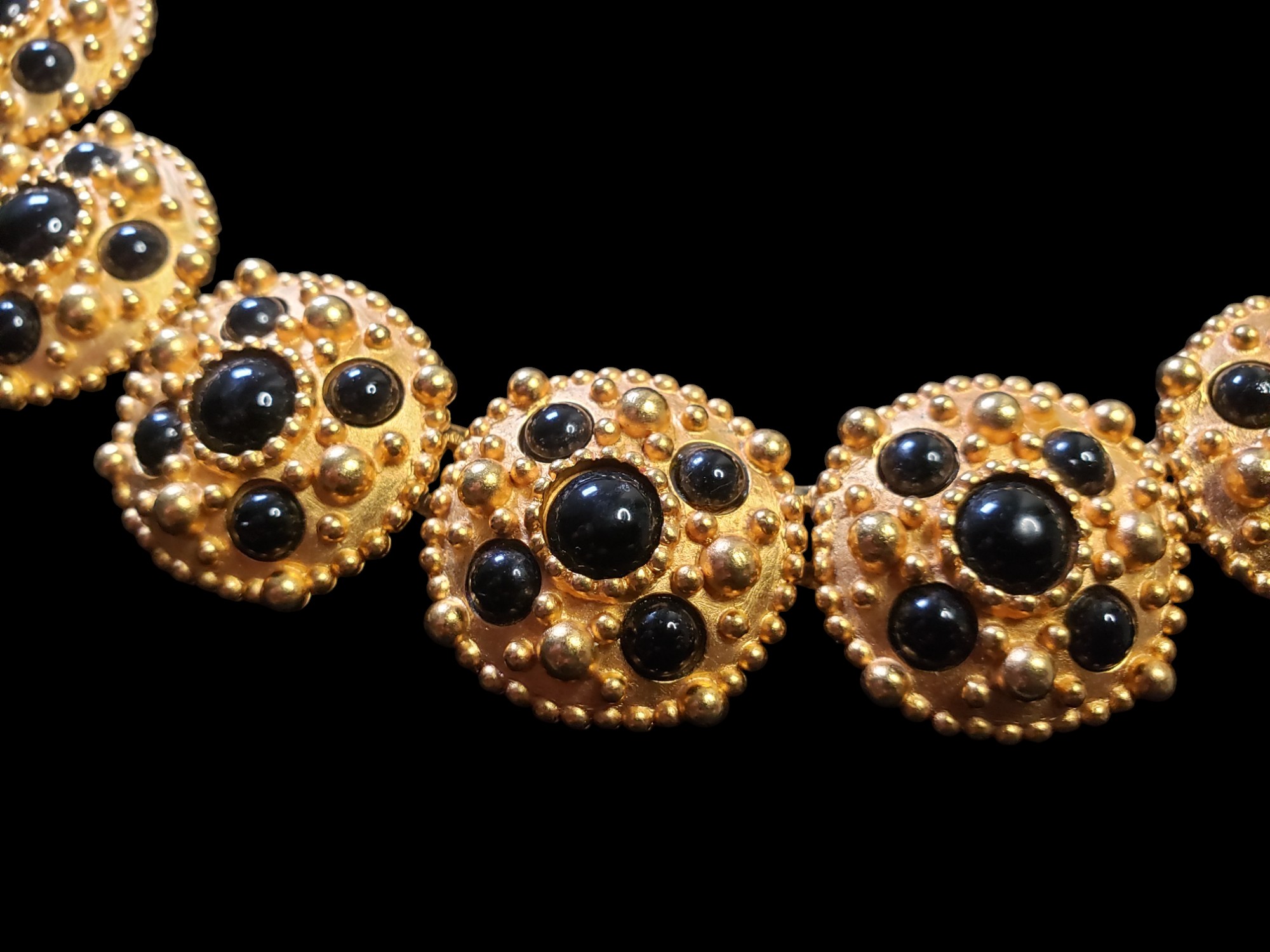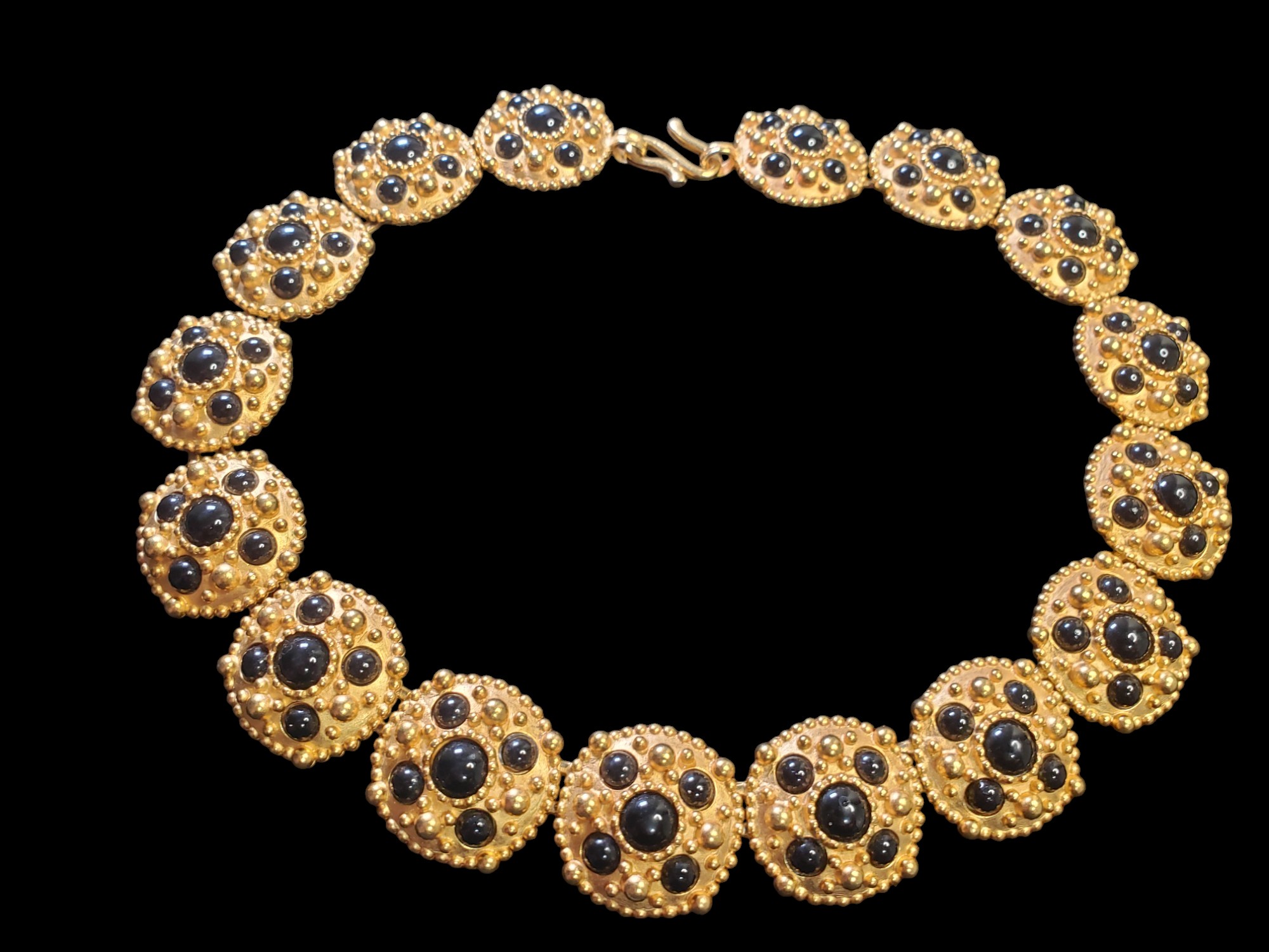 Runway Statement Haute Couture Collar Necklace. Exquisite brushed gold tone metal setting with French Jet cabochons. Measures about 17″ long and about 1″ wide. Unsigned, but certainly a designer piece – looks like Anne Klein jewelry. Excellent condition.
