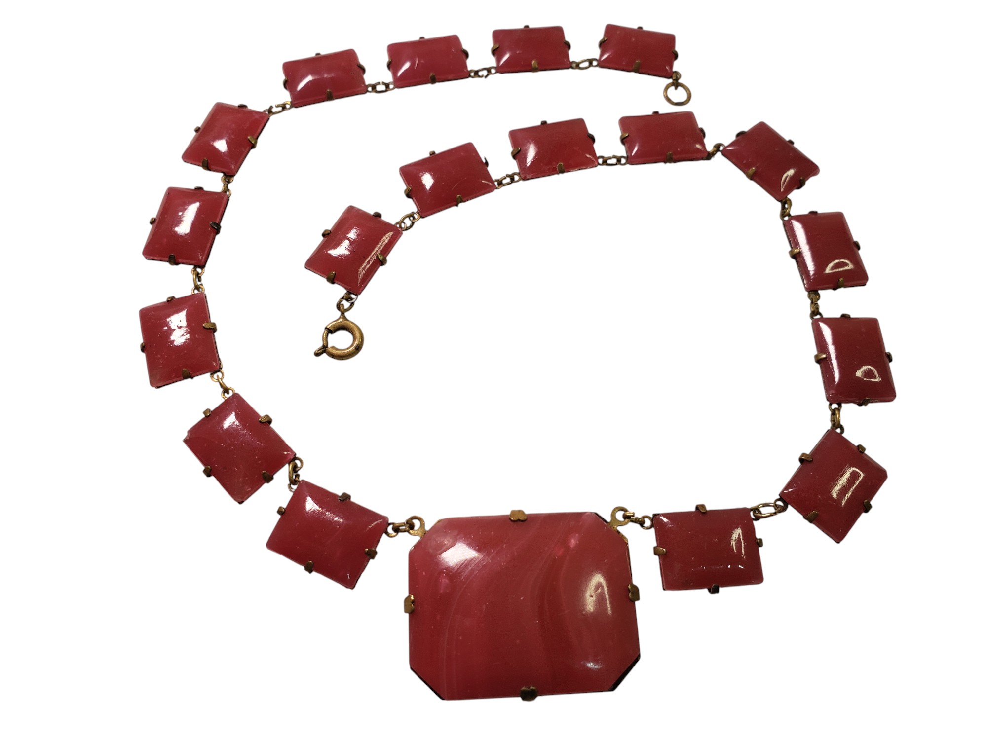 Gorgeous Czech Art Deco Carnelian Collar Necklace. Beautiful carnelian art glass square cabochons in brass setting. Huge glass centerpiece in brass setting measures 1.25″ by 1″. The necklace measures 16″ long and about 0.25″ wide. Excellent condition.