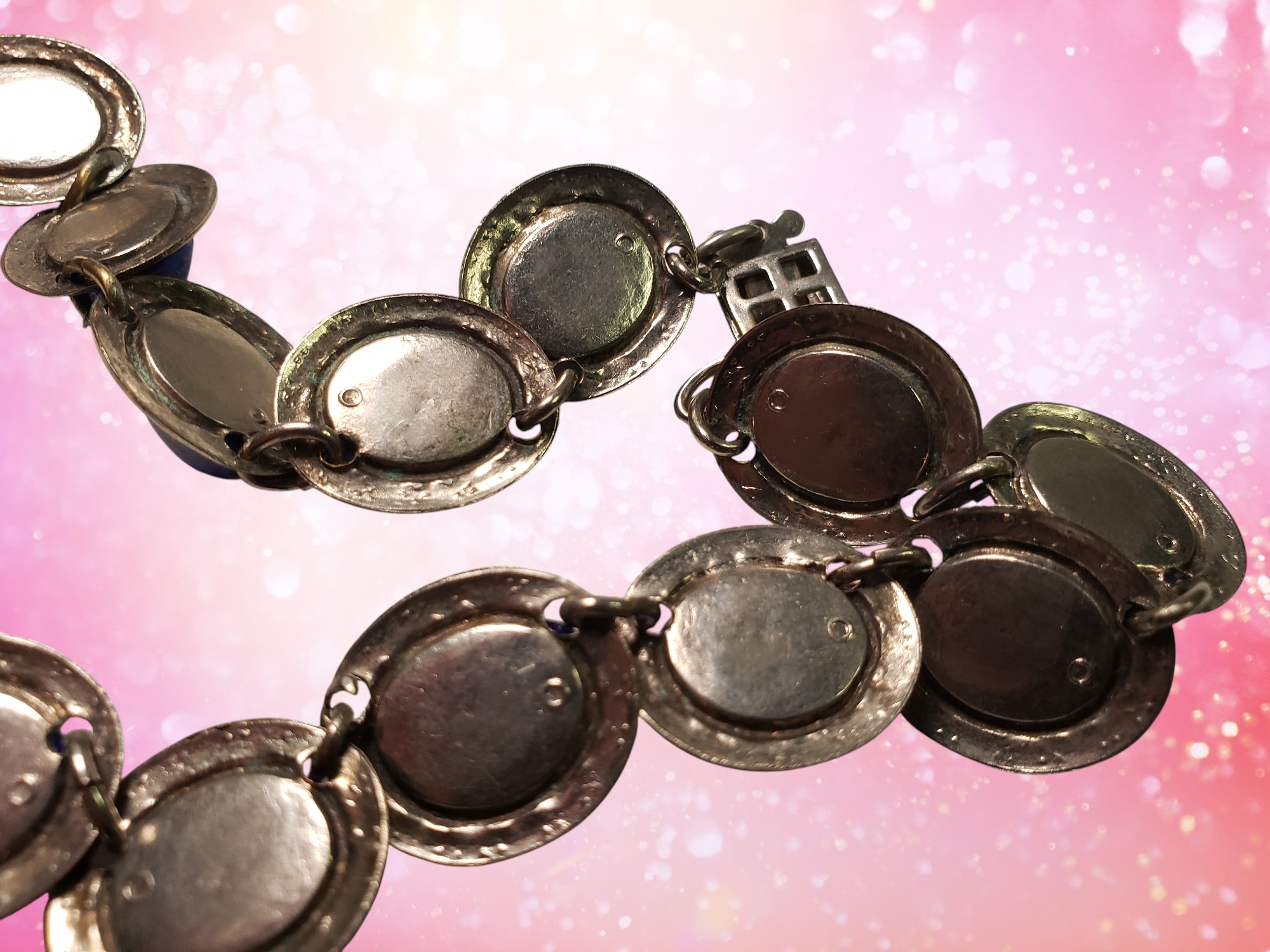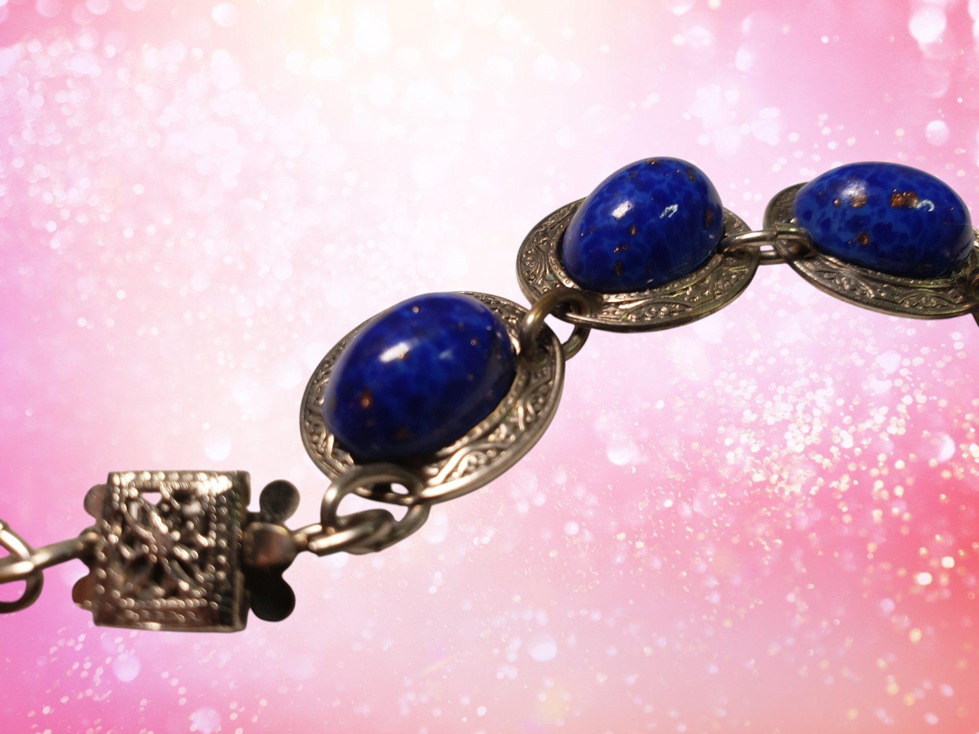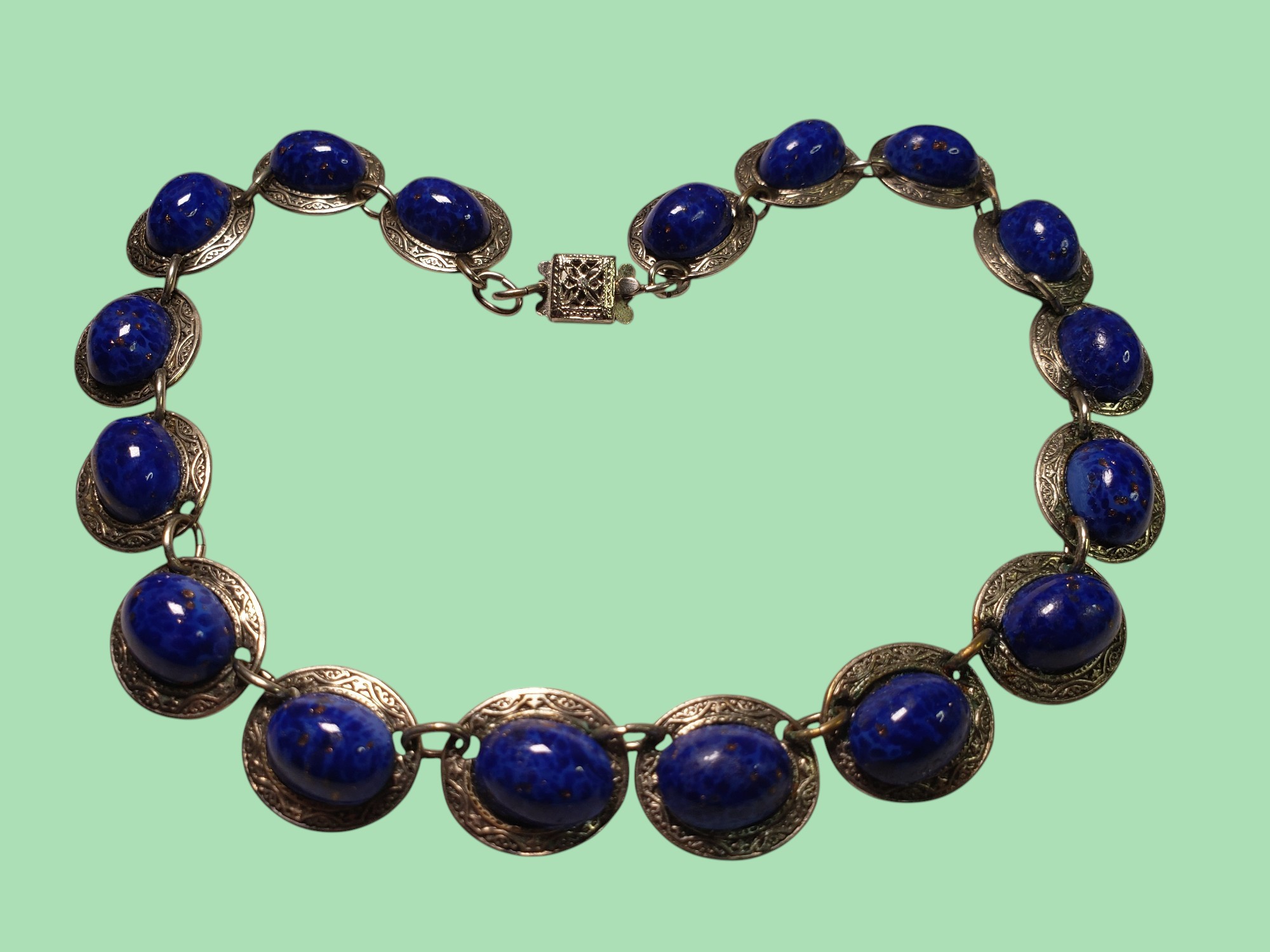 Gorgeous Czech Art Deco Lapis Lazuli Collar Necklace. Ornate silver tone setting with Lapis Lazuli glass oval cabochons. Measures 14.75″ long and 5/8″ wide. Push in clasp. Excellent condition.