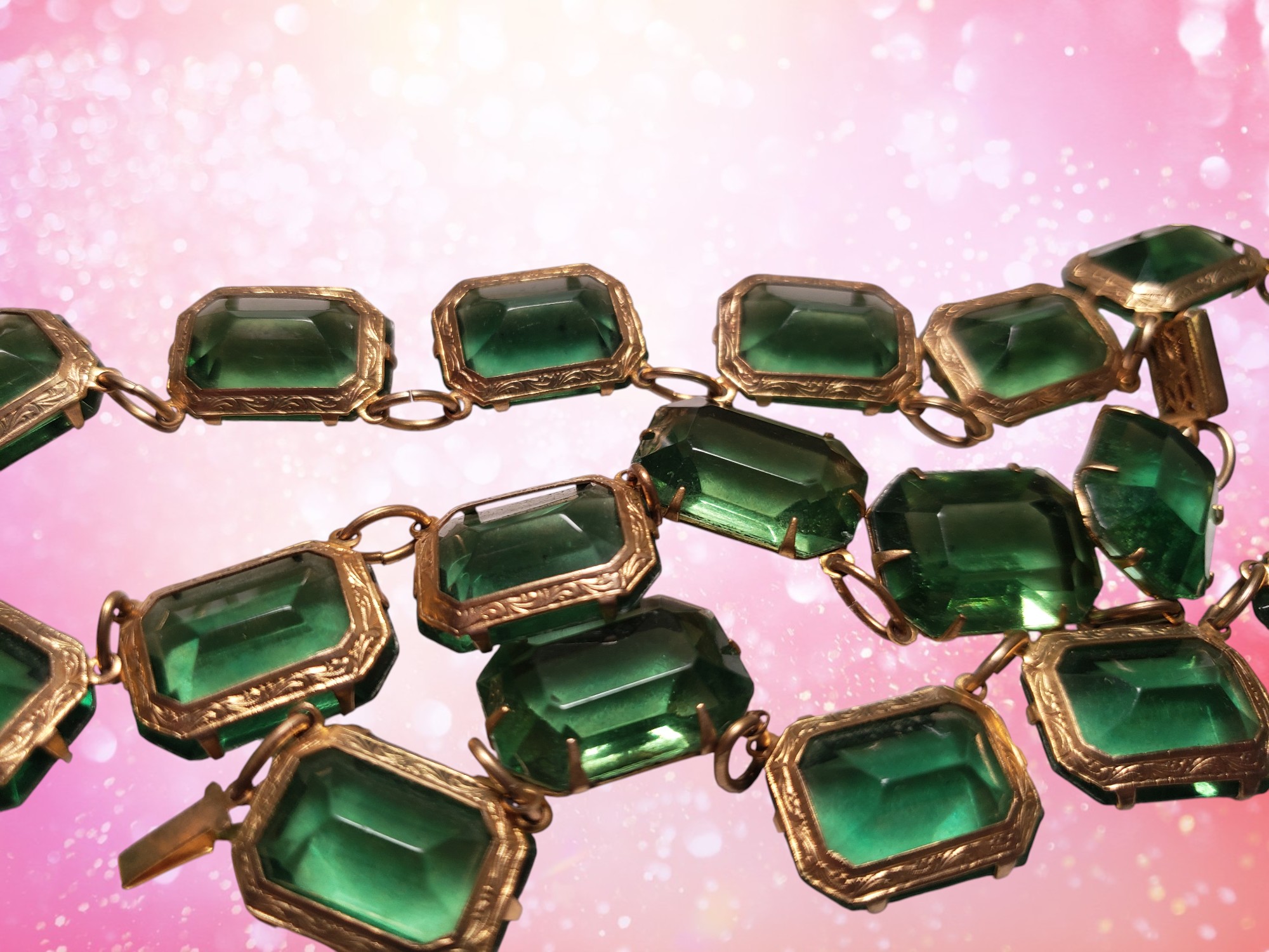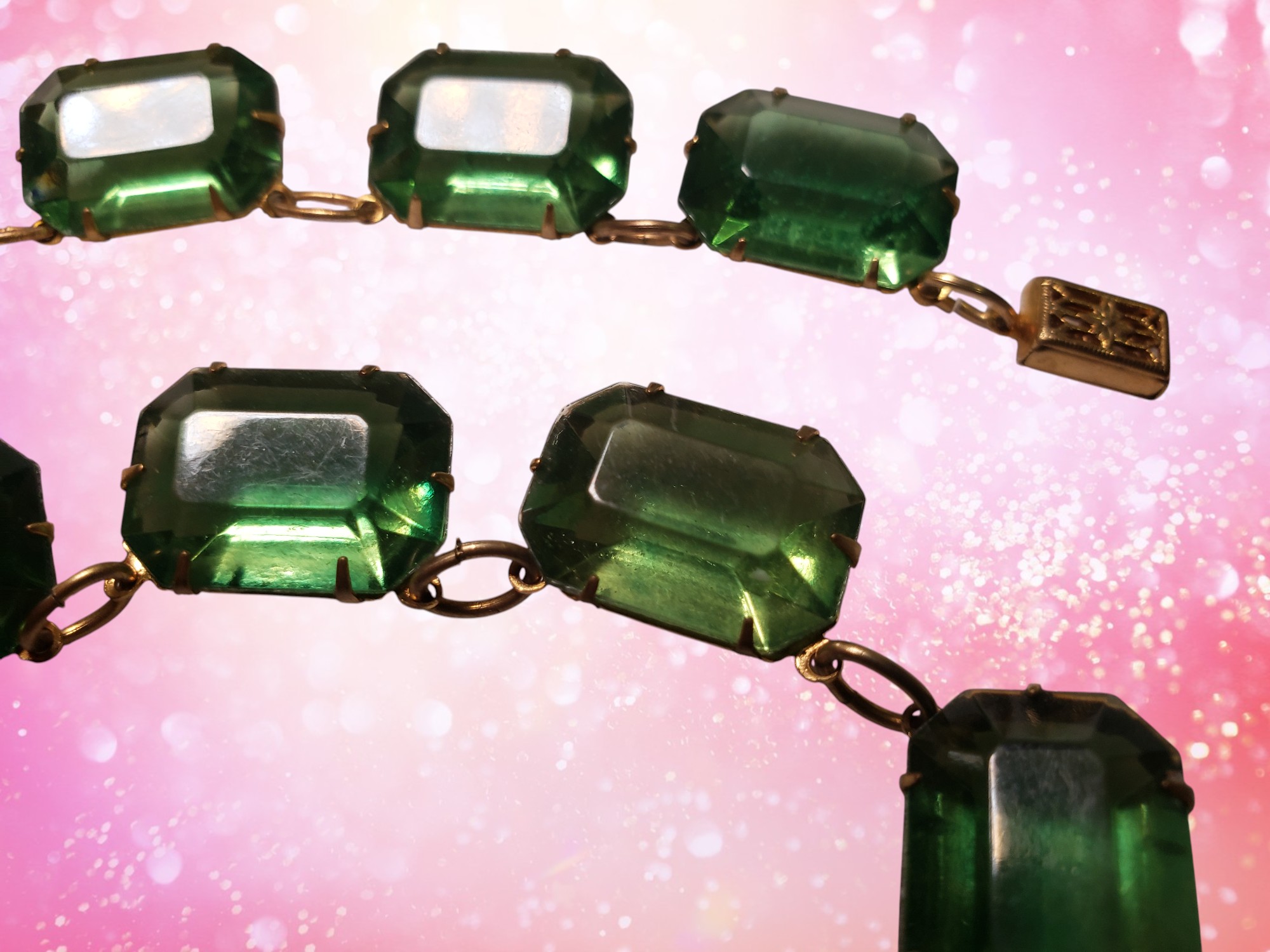 Wonderful Czech Art Deco Faux Emerald Chicklet Collar Necklace. Brass setting with large faux emerald. Measures 17″ long and 1/2″ wide. Push in clasp. Excellent condition.