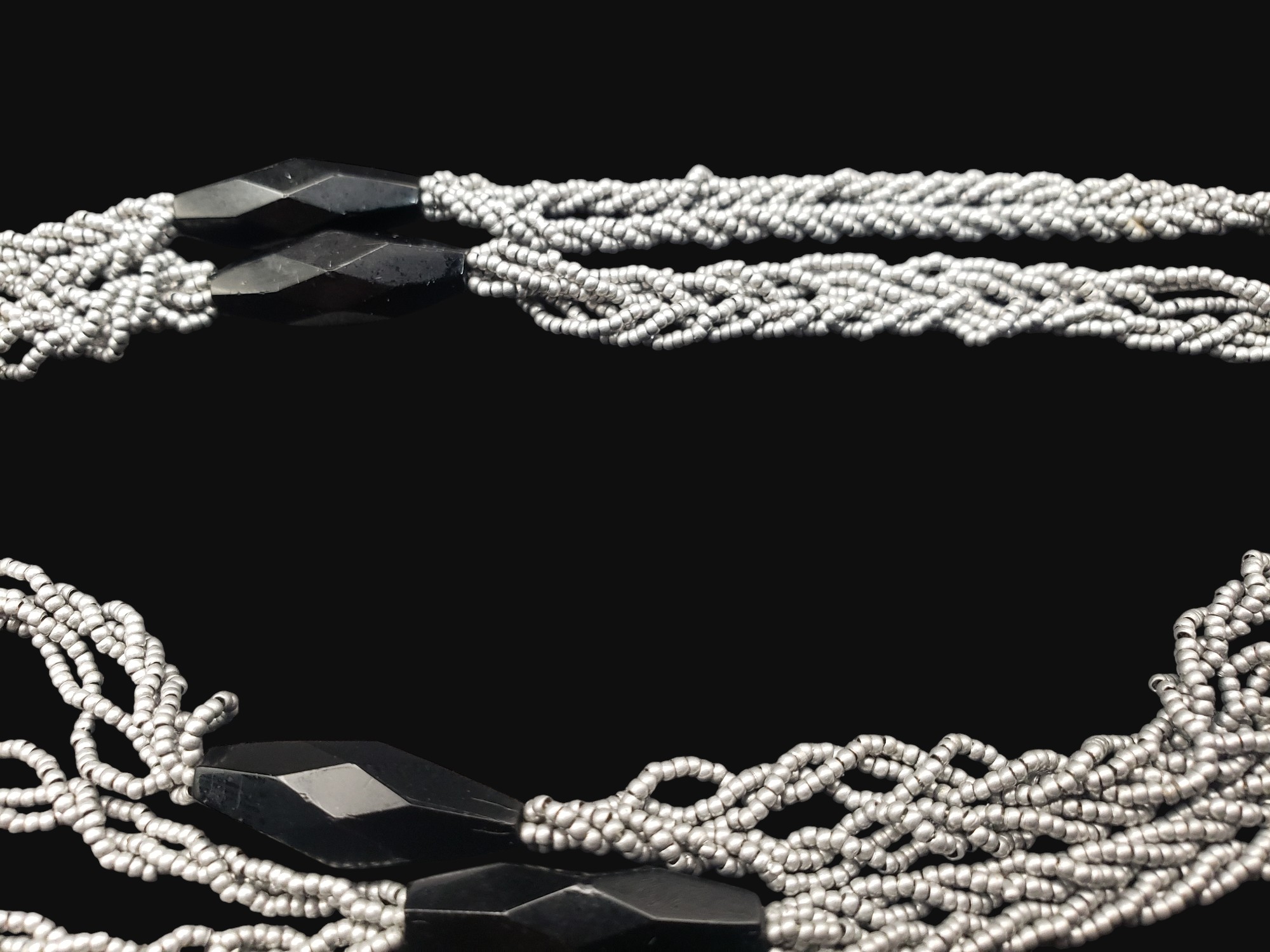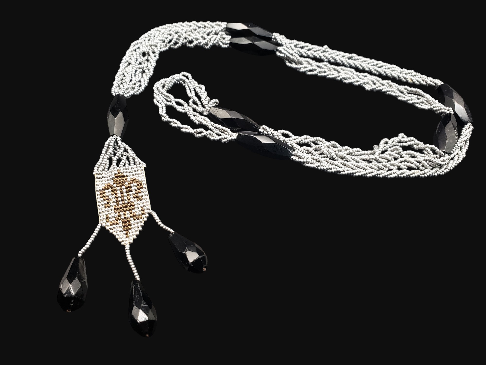 Elegant beaded Art Deco flapper sautoir necklace. Beautiful geometric patterns are created with tiny seed beads in silver gray, beige, and accented by large French jet beads. Dates back to the 1920s. Measures about 30″ long plus the center part which is another 4″ long. Centerpiece with tassels is 4″ by 3/4″. Excellent condition.