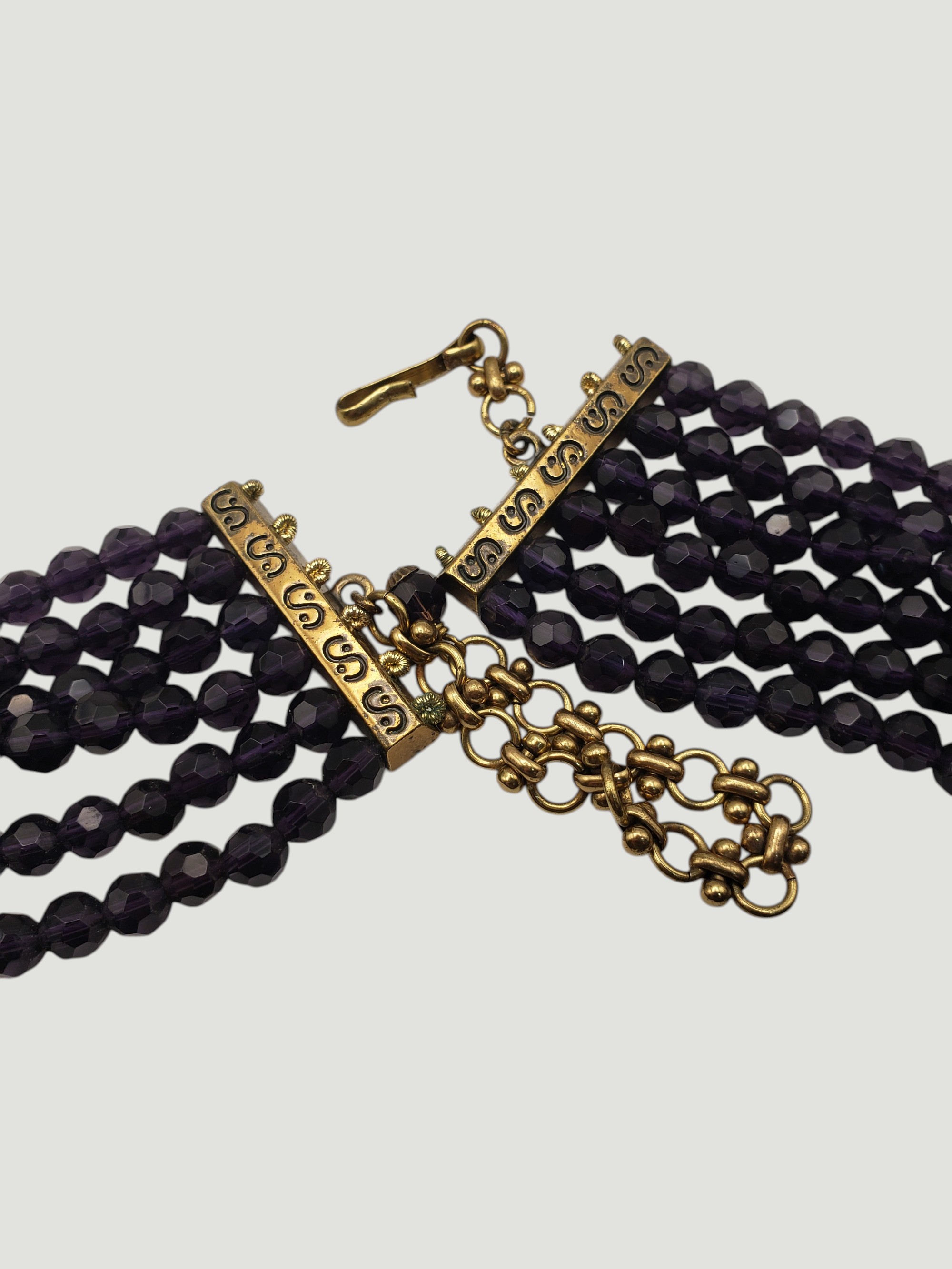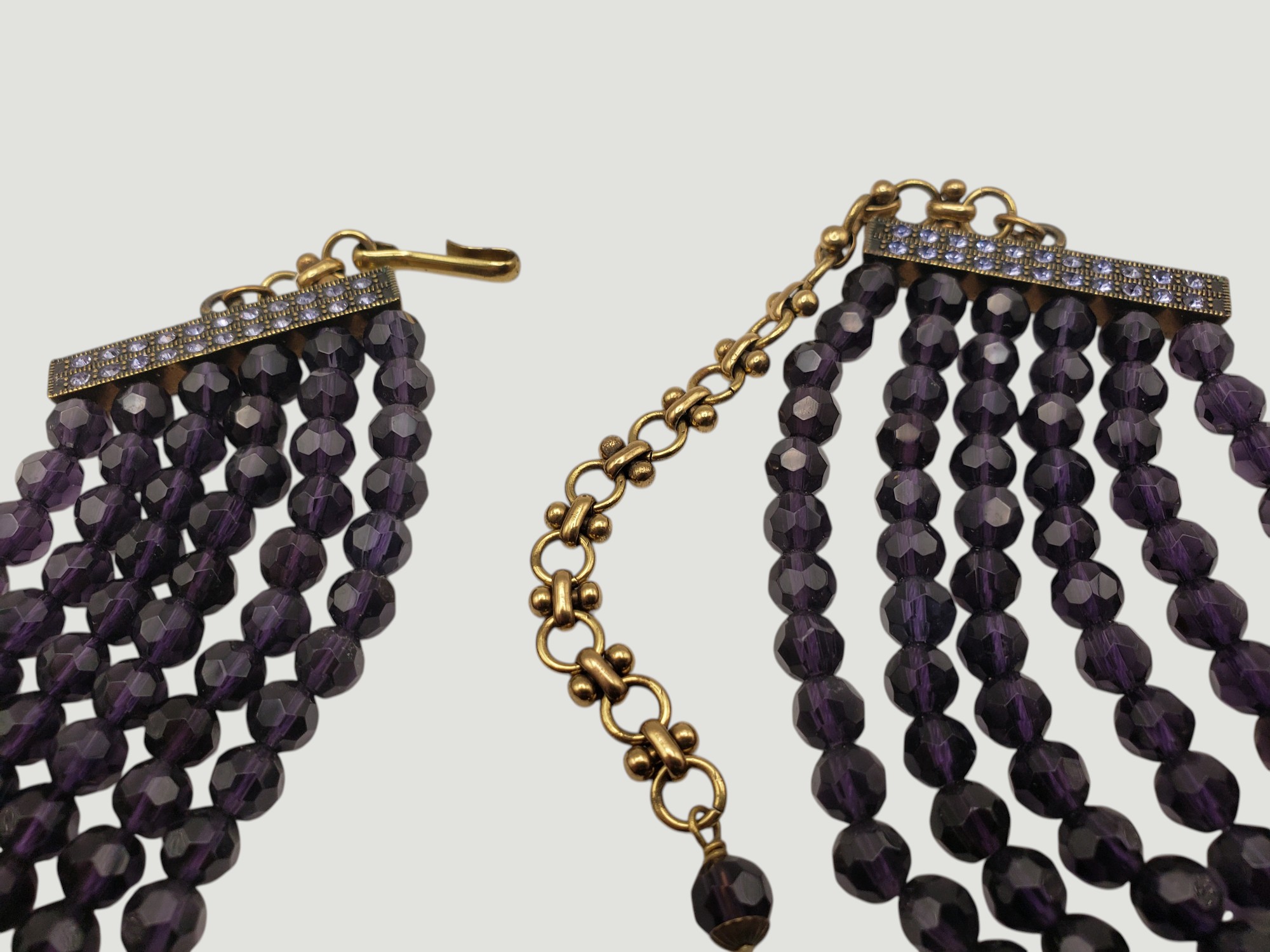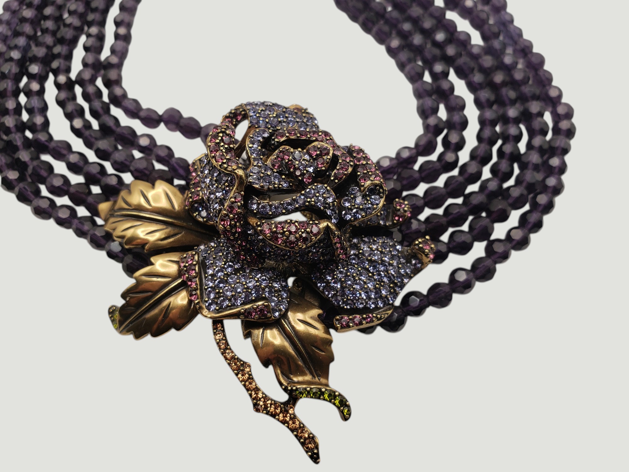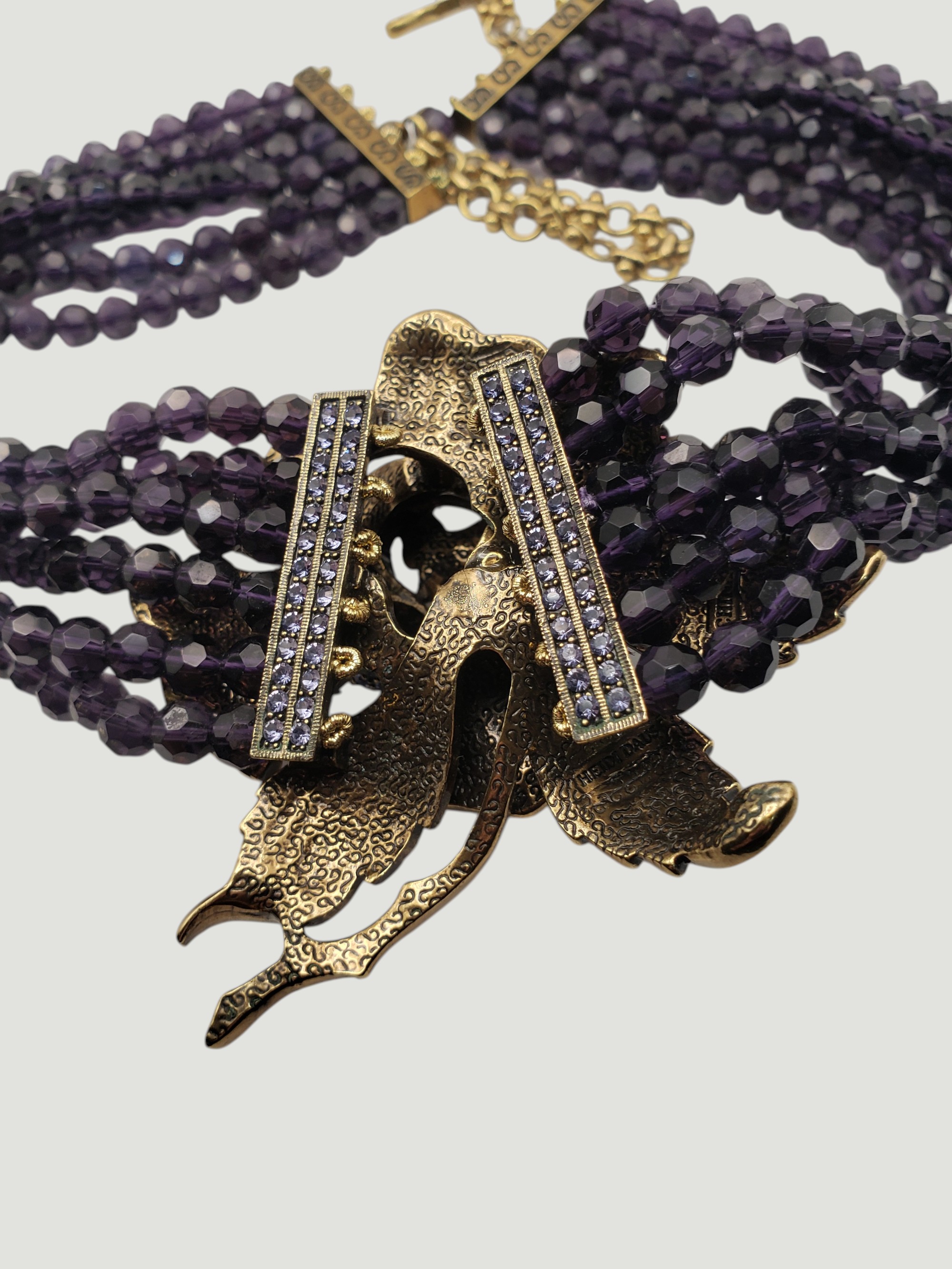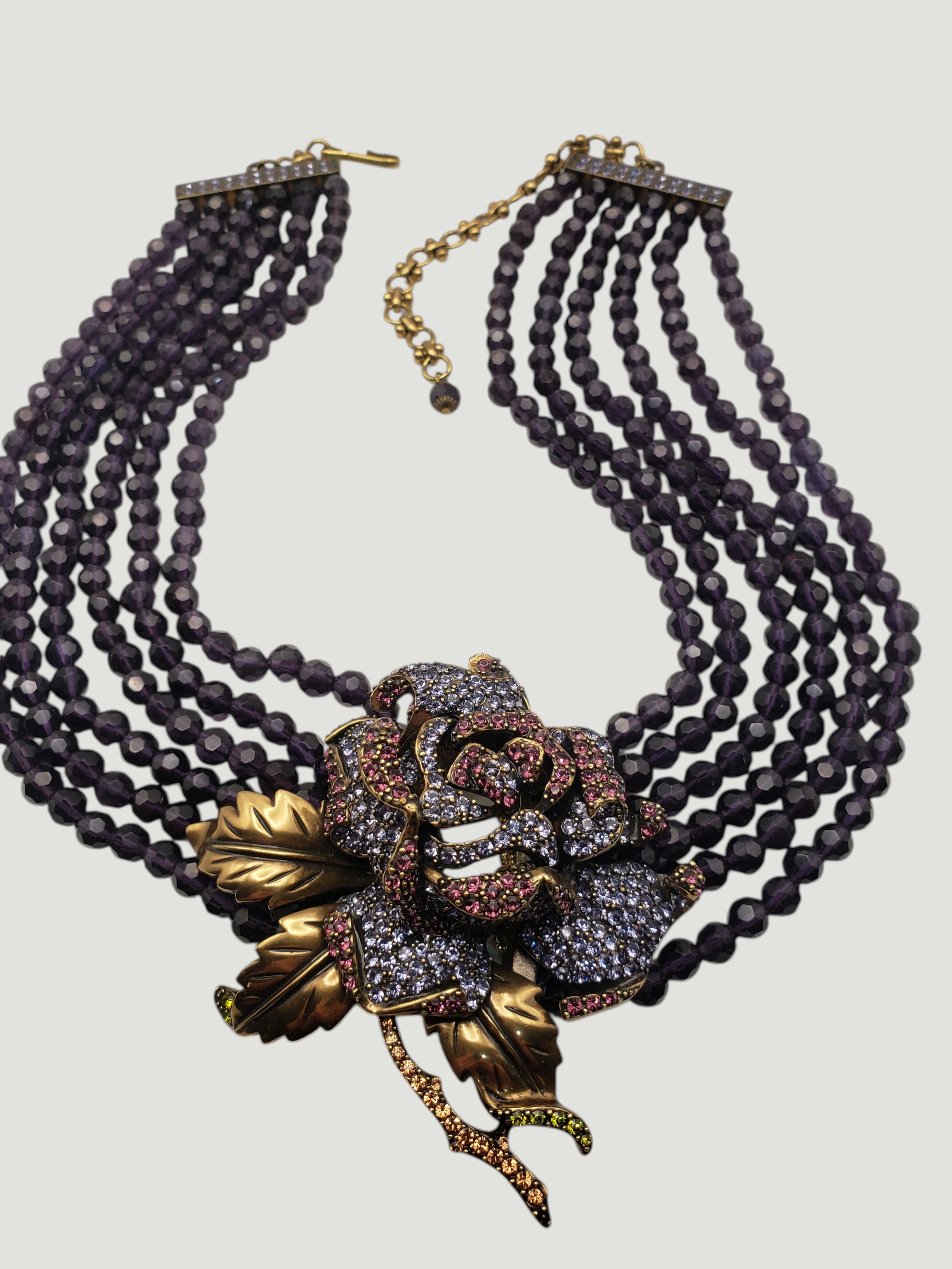 Outstanding Large Deep Heidi Daus Deep Purple Crystal Collar Necklace. Unbelievable colors and great quality. Large rose centerpiece is a rainbow of bright blue purple rhinestones. It is suspended by six strands of deep purple faceted crystals. The metal is of a dark antique bronze. The ends are adorned by small blue stones. Pictures just do not do it justice! Measures about 20″ long, the centerpiece is 3″ by 3″. Unsigned, but easily recognized by collectors as “Heidi Daus”. Excellent condition.