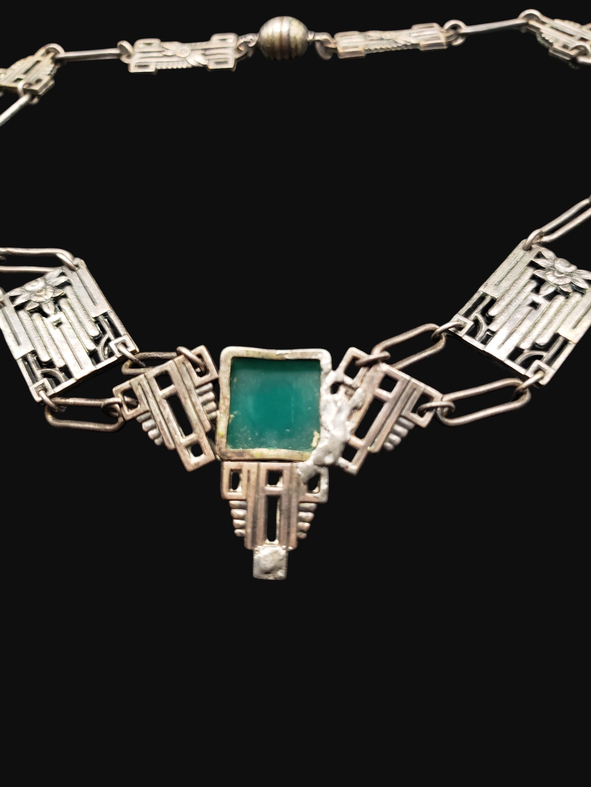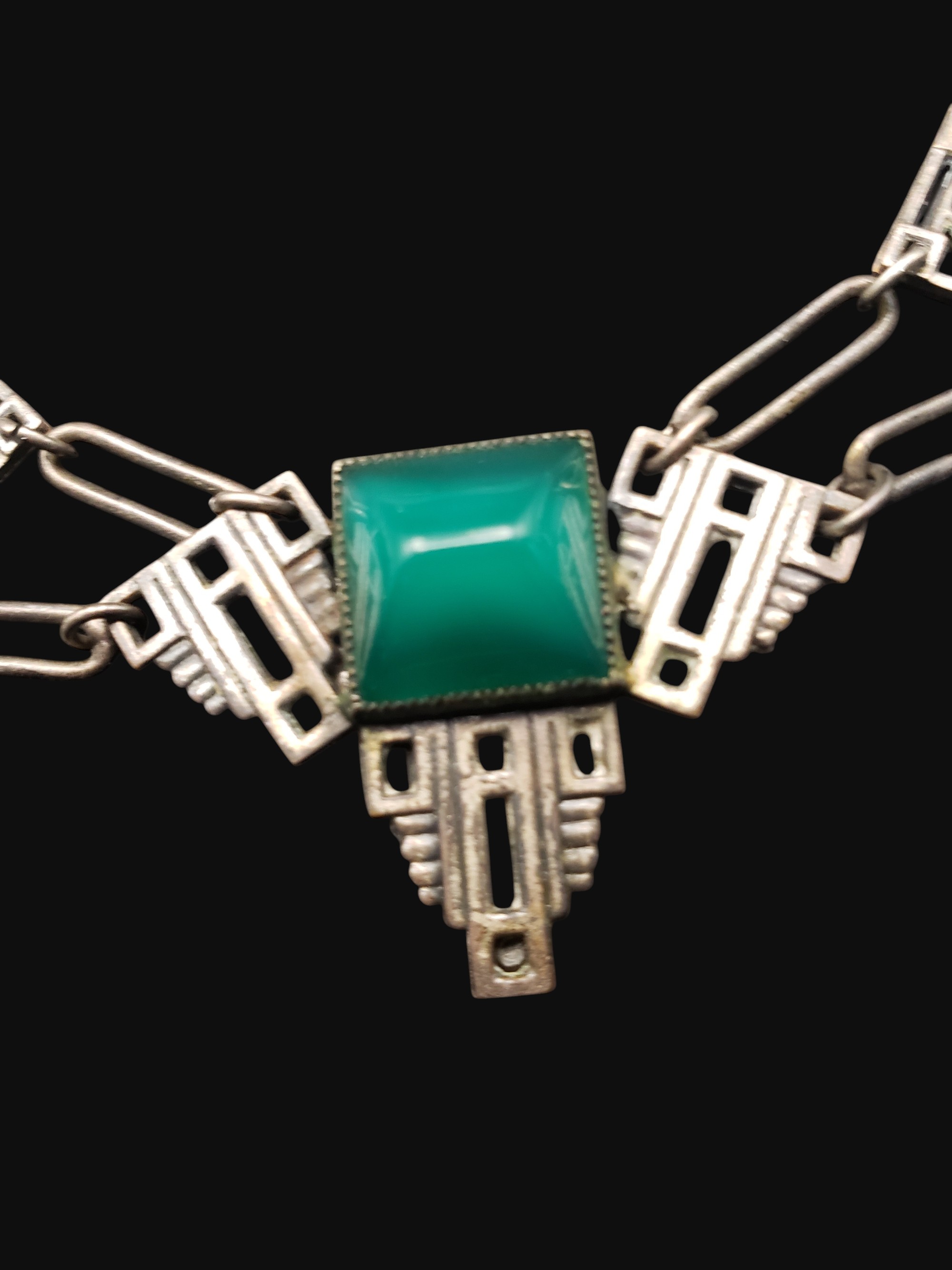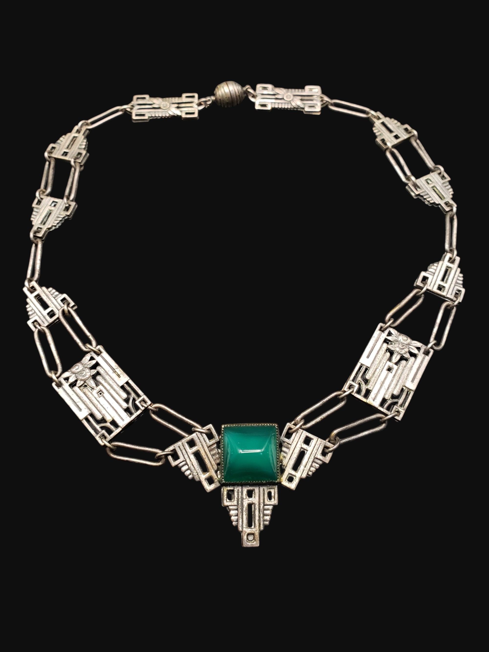 Marvelous French Louis Rousselet Art Deco style necklace. Ornate Art Deco style silver tone setting with a large square cut faux chrysoprase cabochon in the center. Typical French round screw in clasp. Necklace measures 16″ long, the center is 1.5″ by 1 1/8″ wide. Unsigned. There is a a sign of repair in the center on the back (check pictures) – solder, it does not effect the front at all and necklace is wearable and very pretty. Otherwise excellent condition.