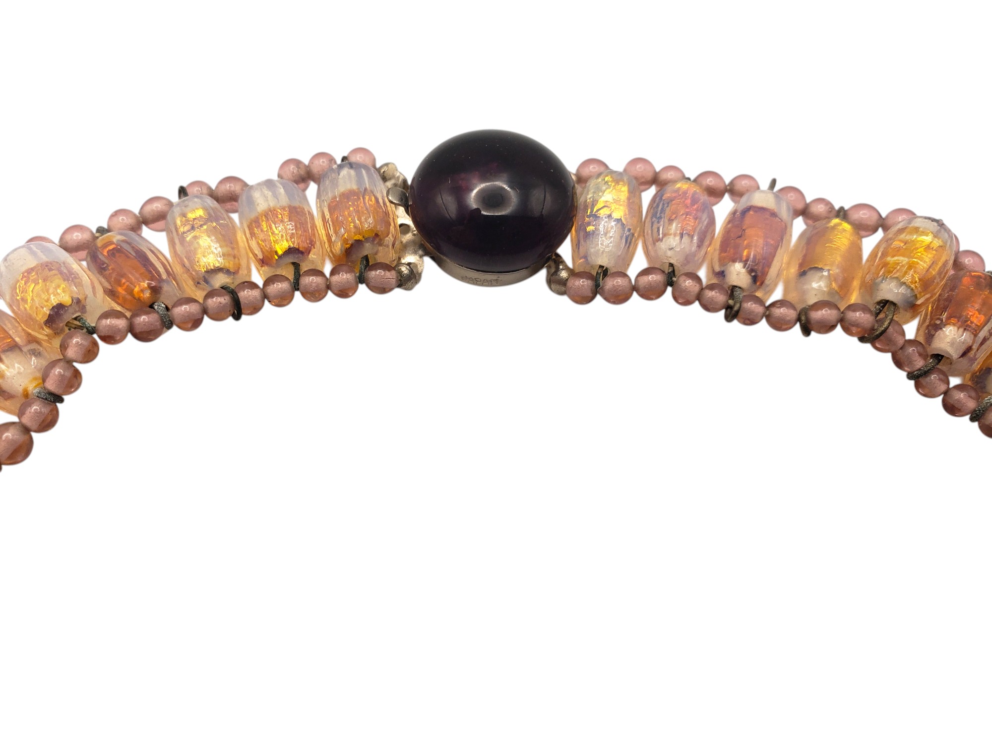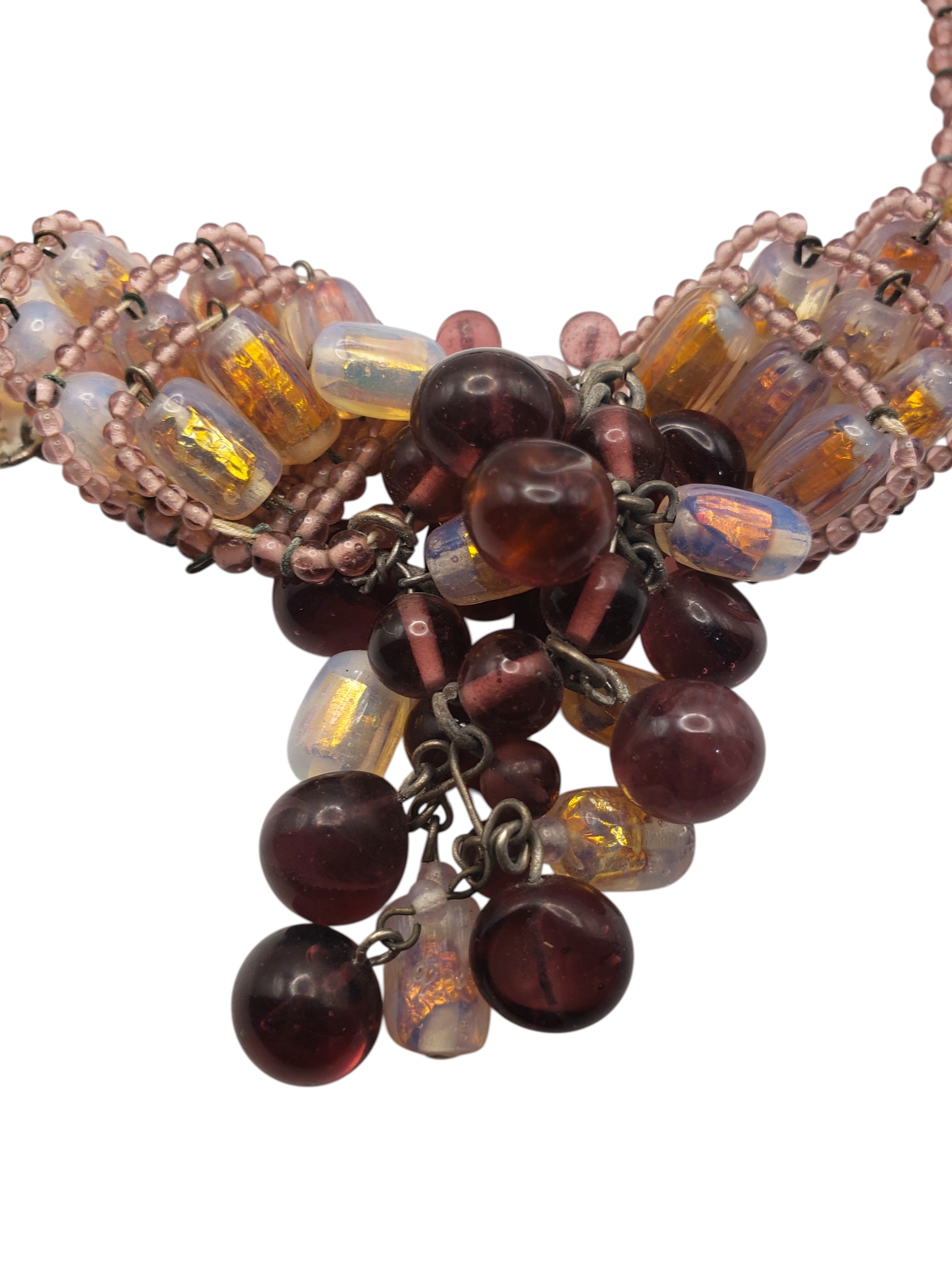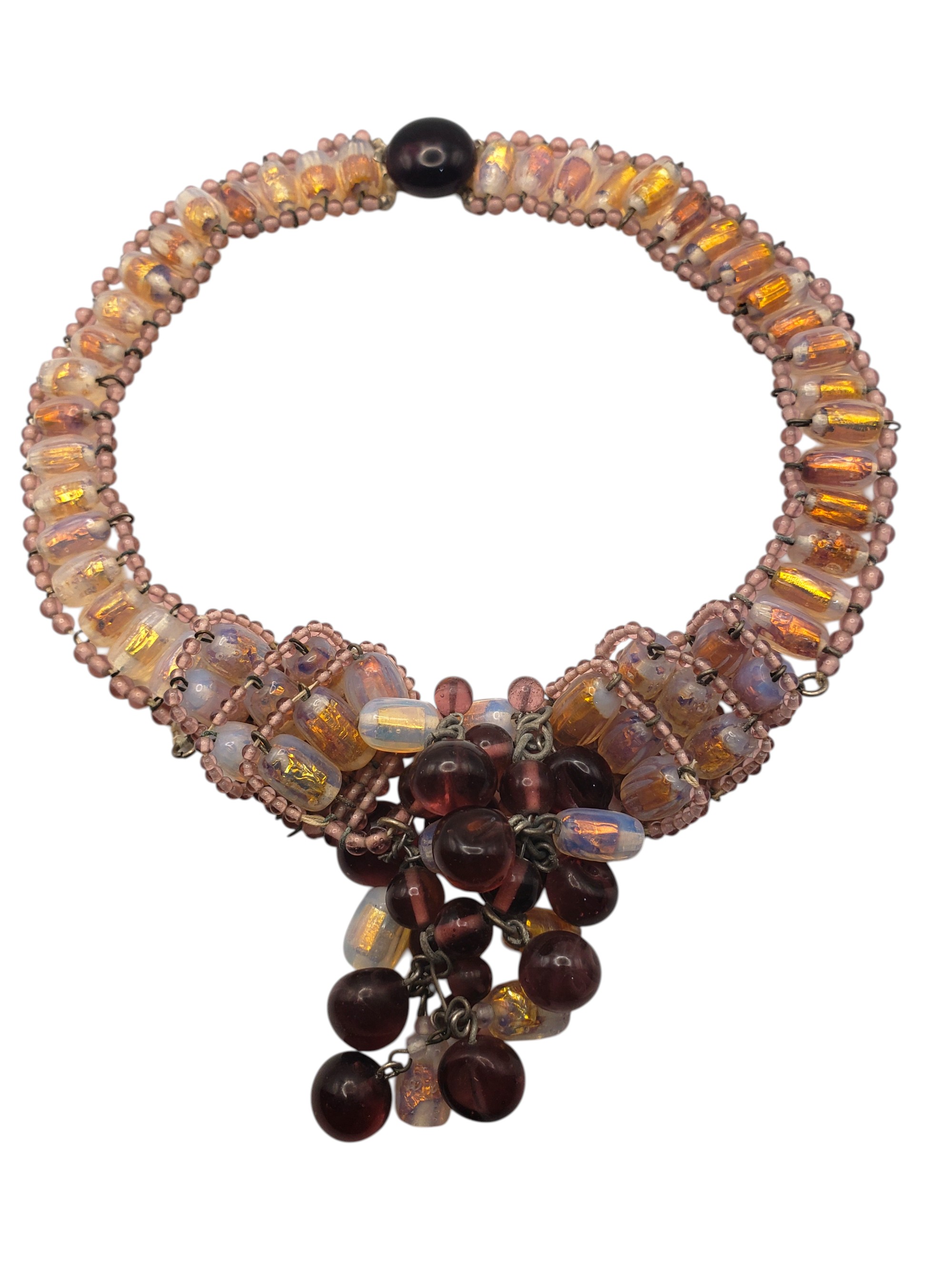 Gorgeous Beaded Bib Necklace in the best traditions of French jewelry designer Louis Rousselet. Gorgeous beads all connected by wires. The beads include light and deep purple, and golden foiled Venetian art glass. Center is fabulous cluster of those beads. The push in clasp is decorated by a large purple cabochon. It is not French and not Louis Rousselet, but it is as beautiful and well made. Necklace measures 14″ long and 5/8″ wide, te center is bib part is 3.5″ by 2.5″. Excellent condition.