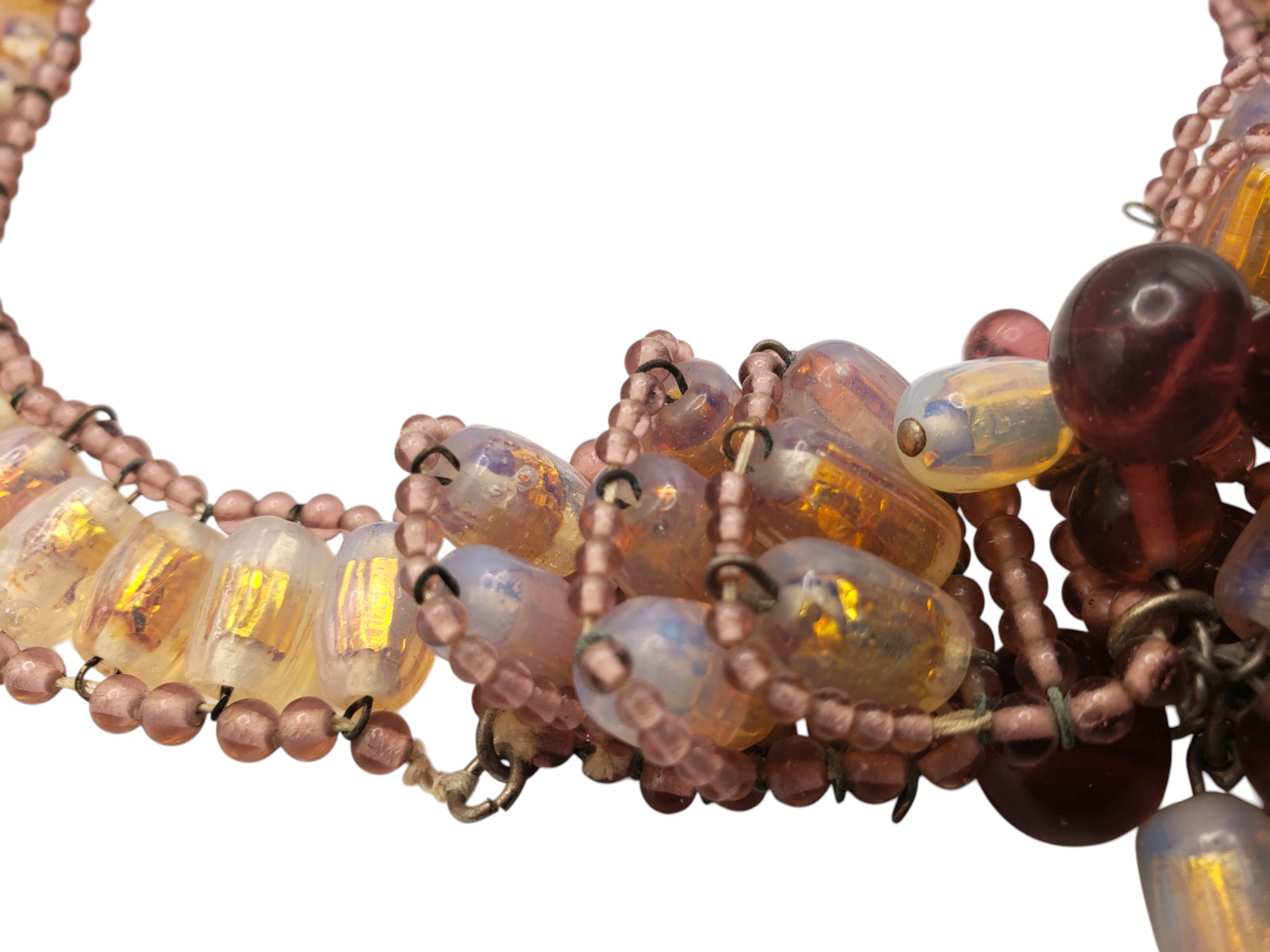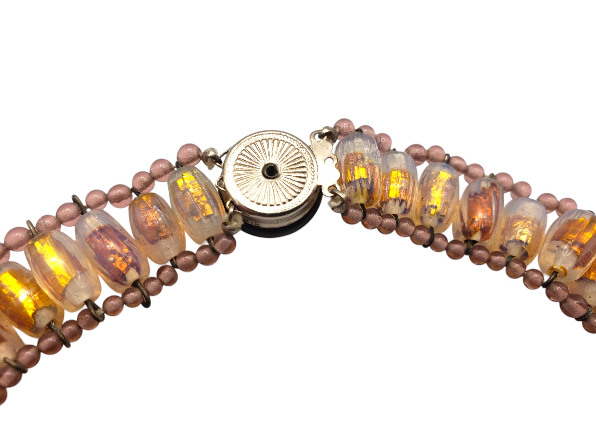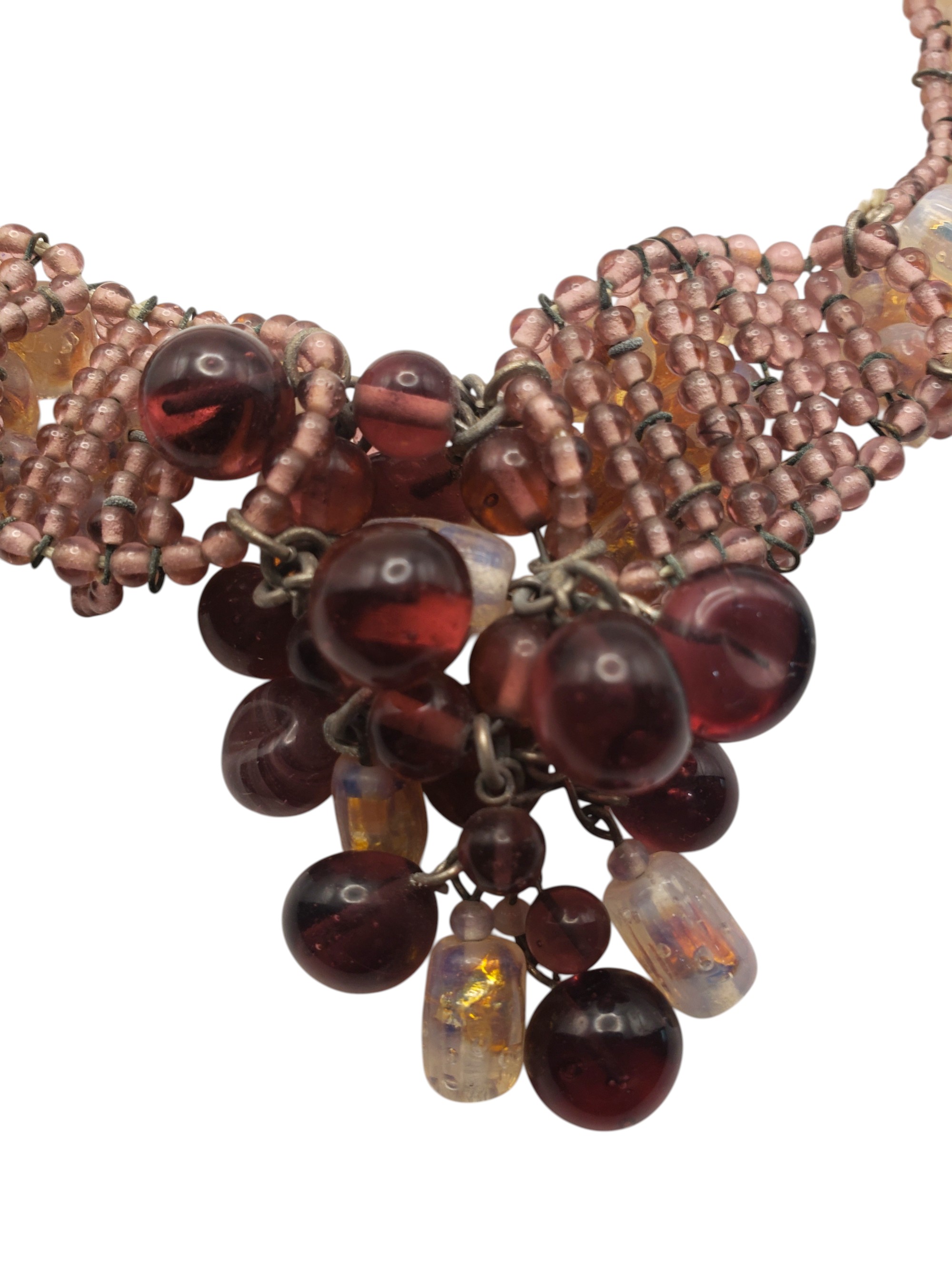 Gorgeous Beaded Bib Necklace in the best traditions of French jewelry designer Louis Rousselet. Gorgeous beads all connected by wires. The beads include light and deep purple, and golden foiled Venetian art glass. Center is fabulous cluster of those beads. The push in clasp is decorated by a large purple cabochon. It is not French and not Louis Rousselet, but it is as beautiful and well made. Necklace measures 14″ long and 5/8″ wide, te center is bib part is 3.5″ by 2.5″. Excellent condition.