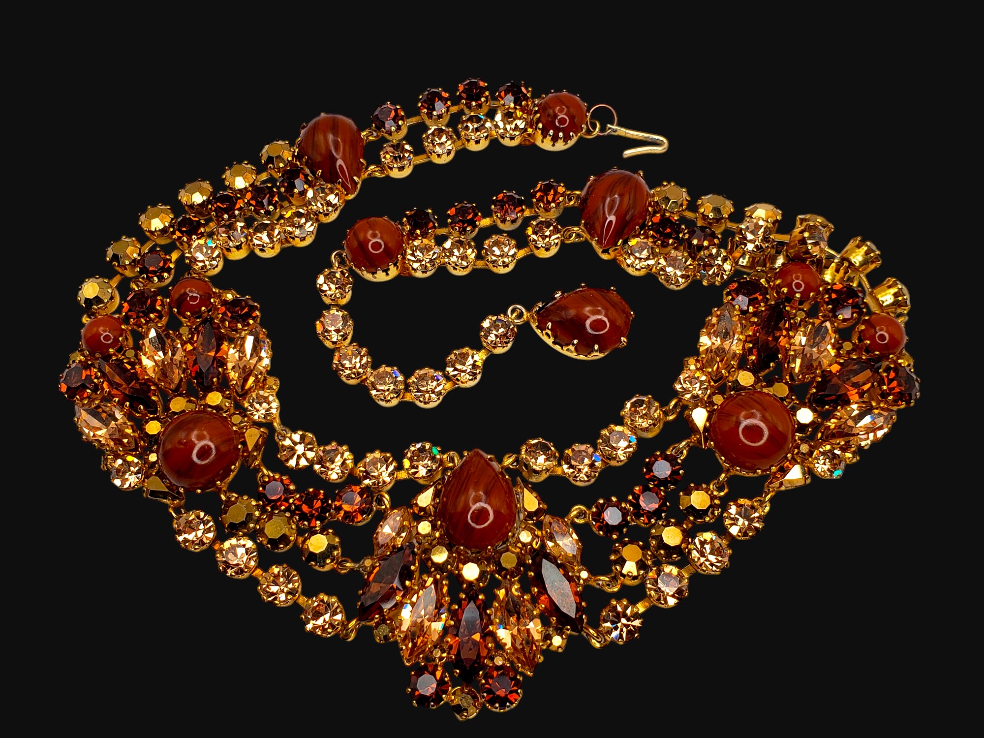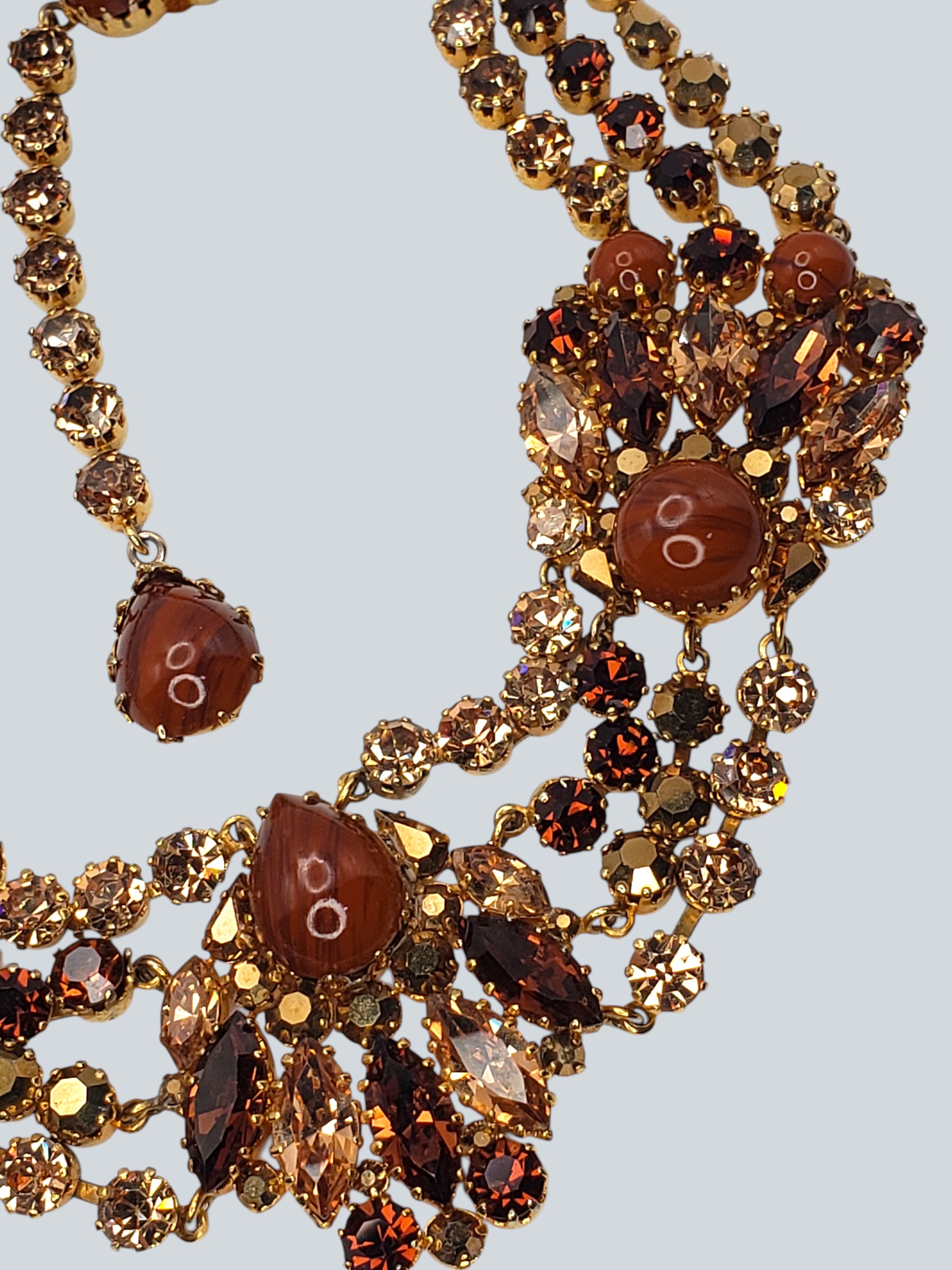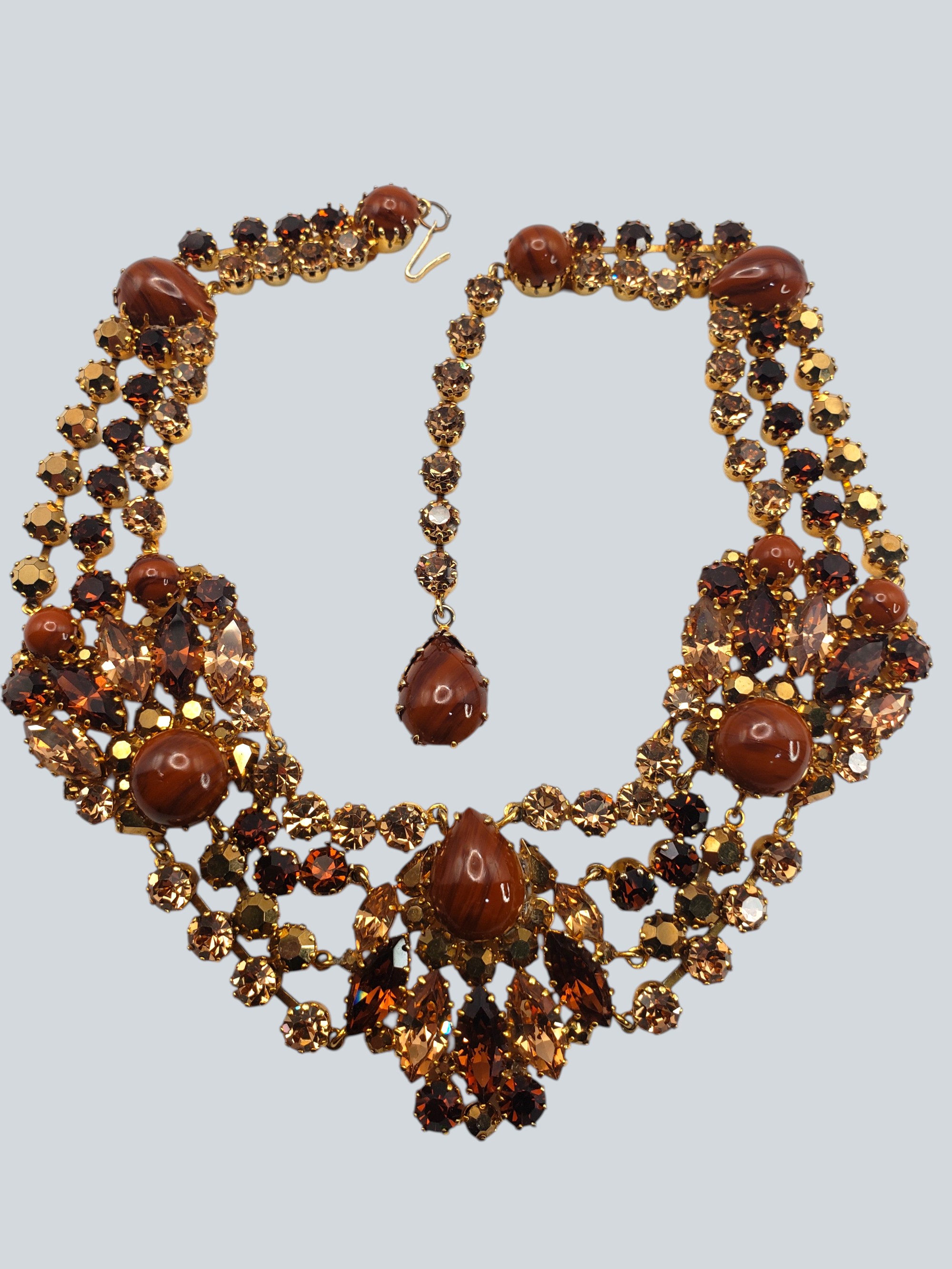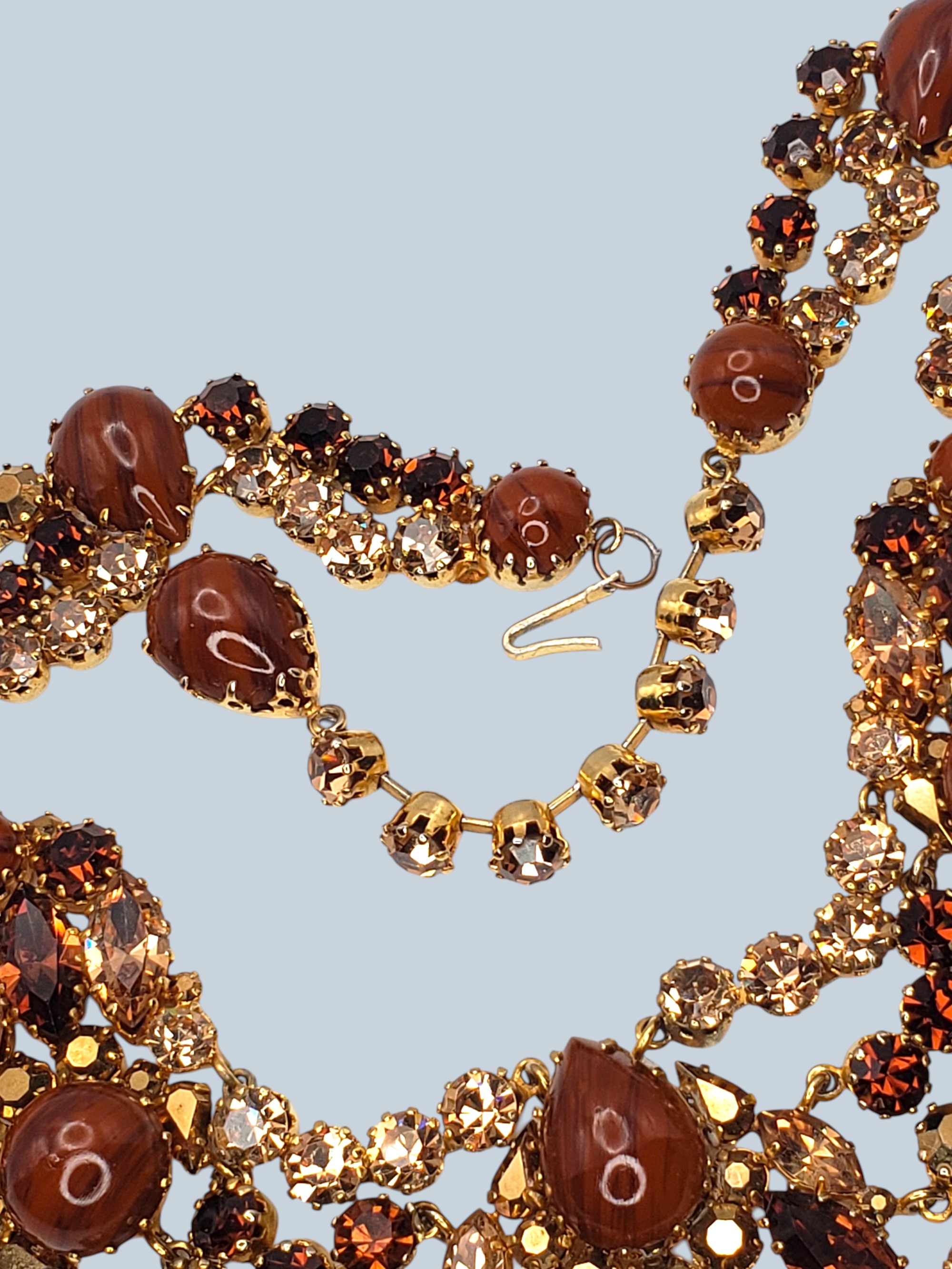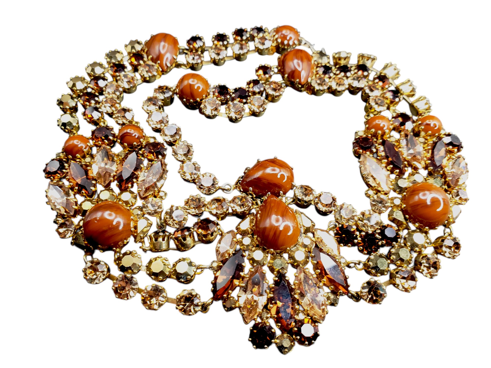 Incredible Austrian AUSTRIA Rhinestone Collar Necklace. The colors are spectacular! Gold tone setting with amber, topaz, golden rhinestones and large caramel colored cabochons. Very well made. Unsigned, but by construction and quality it is attributed to Austrian jewelry. Measurers 17.5″ long and 1.75″ wide. Excellent condition.