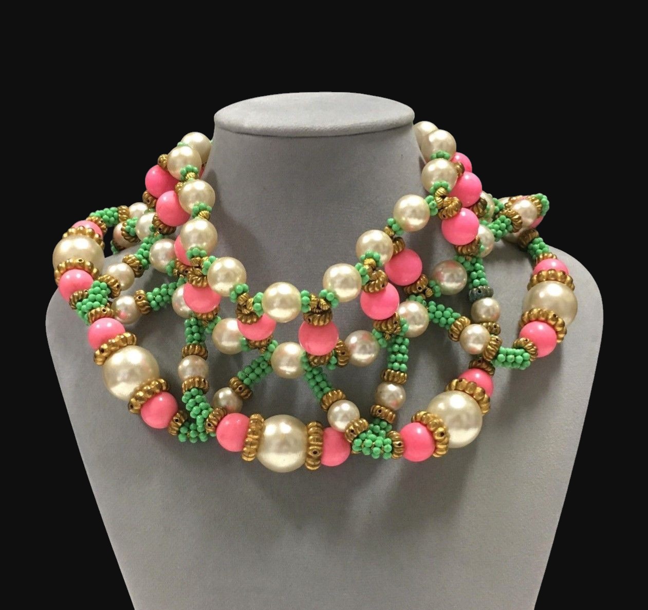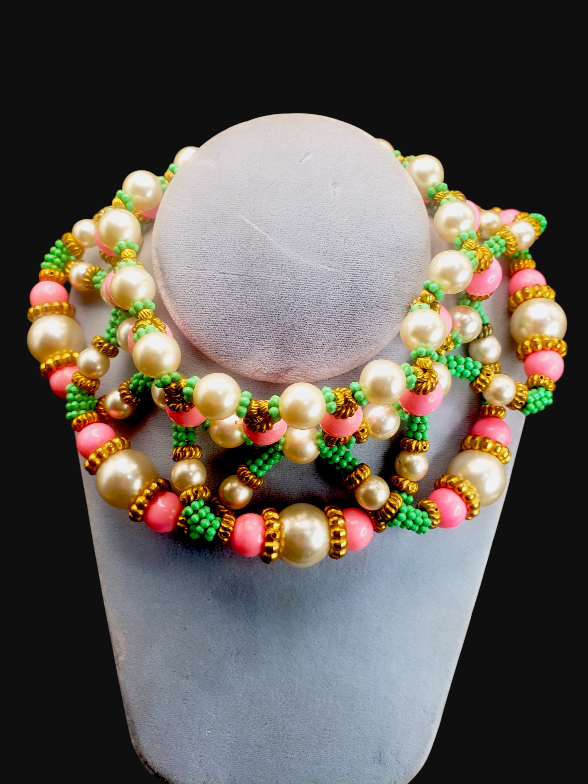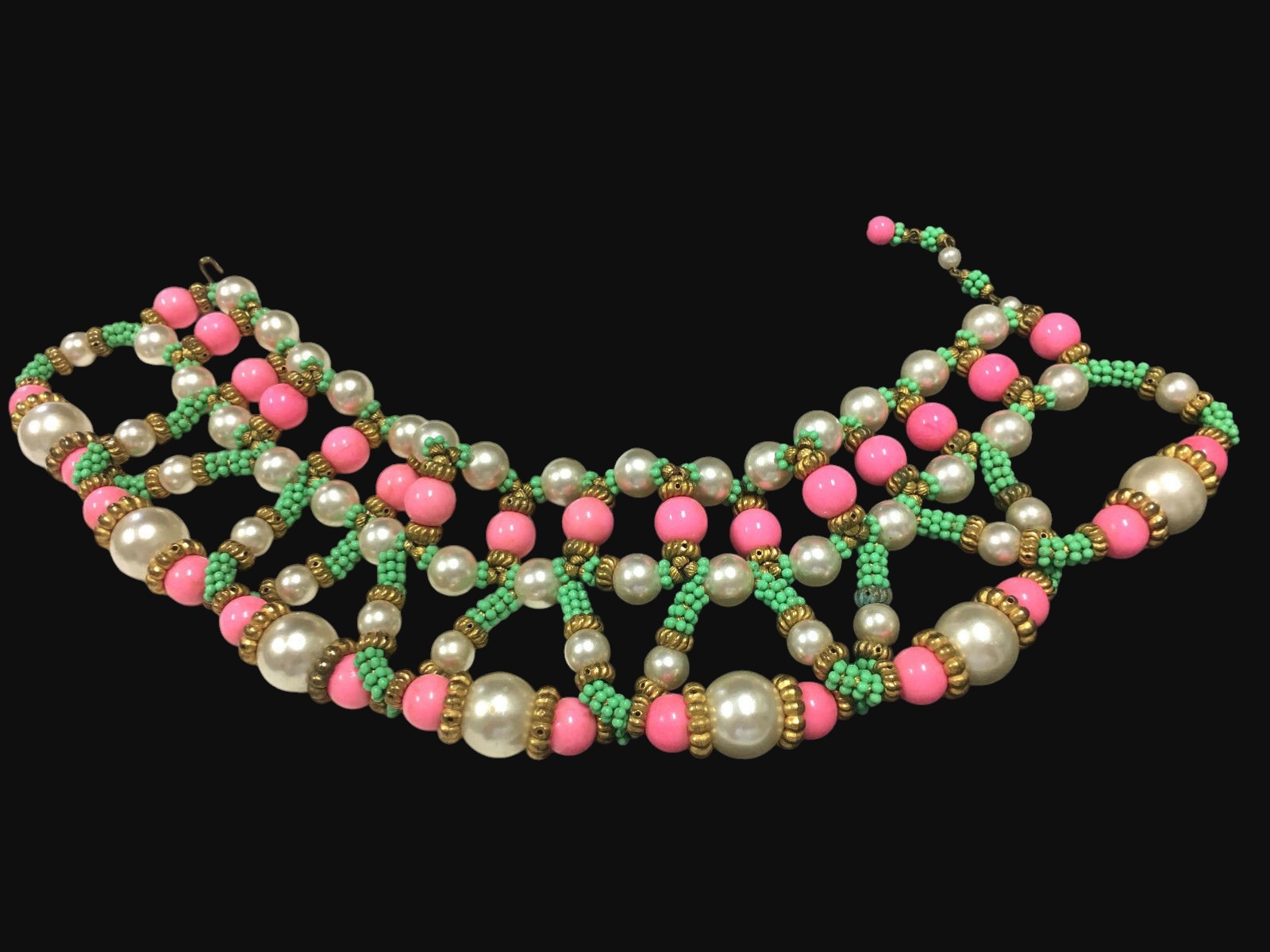 HUGE William DeLillo Egyptian Revival Collar Necklace. Intricate beading of large pearls, green faux turquoise, and bright pink all separated by golden spacers. Measures approximately 15.5″ long and 3″ wide. Unsigned, but I have seen one that was signed “DeLillo”. Excellent condition.