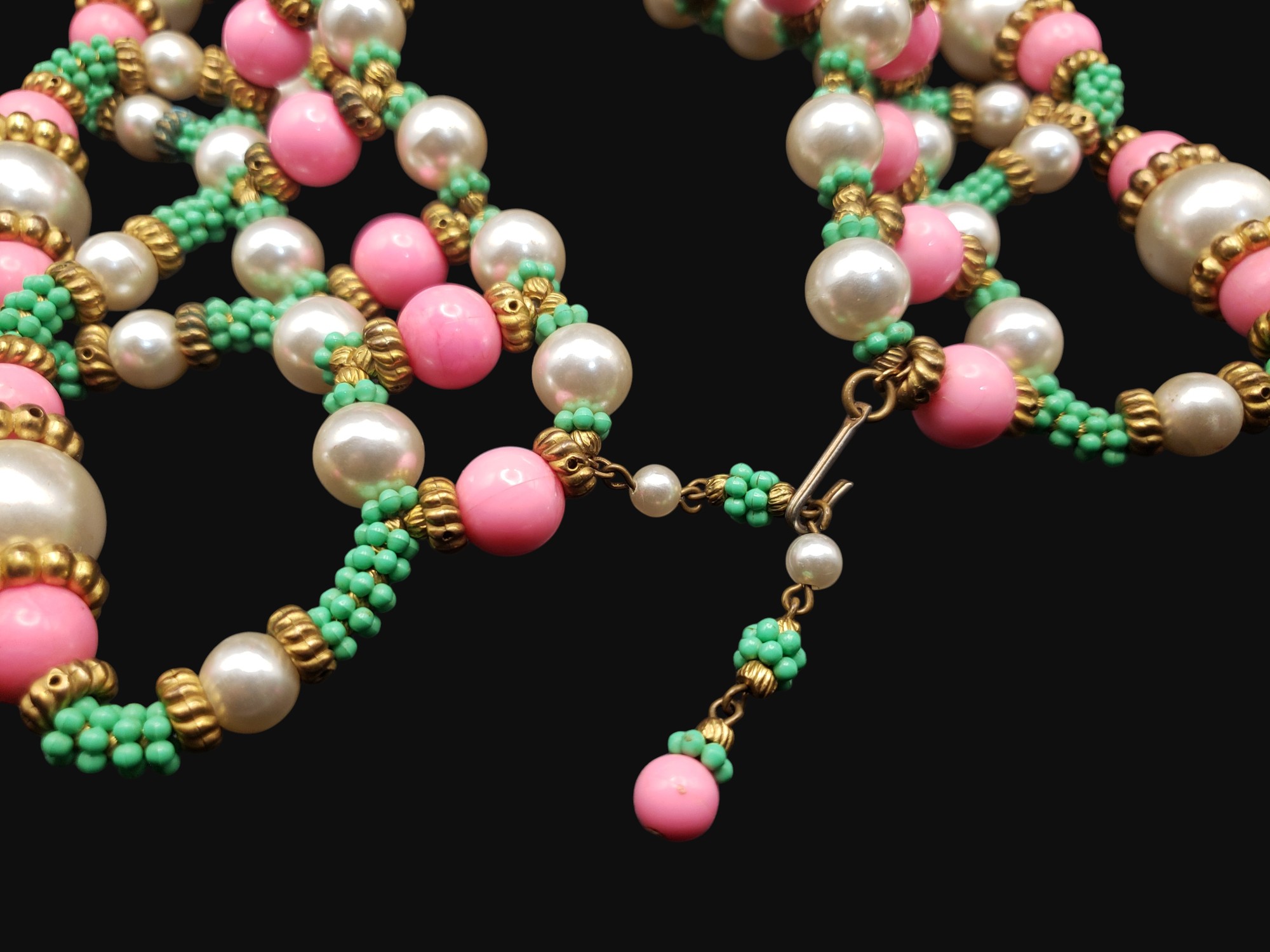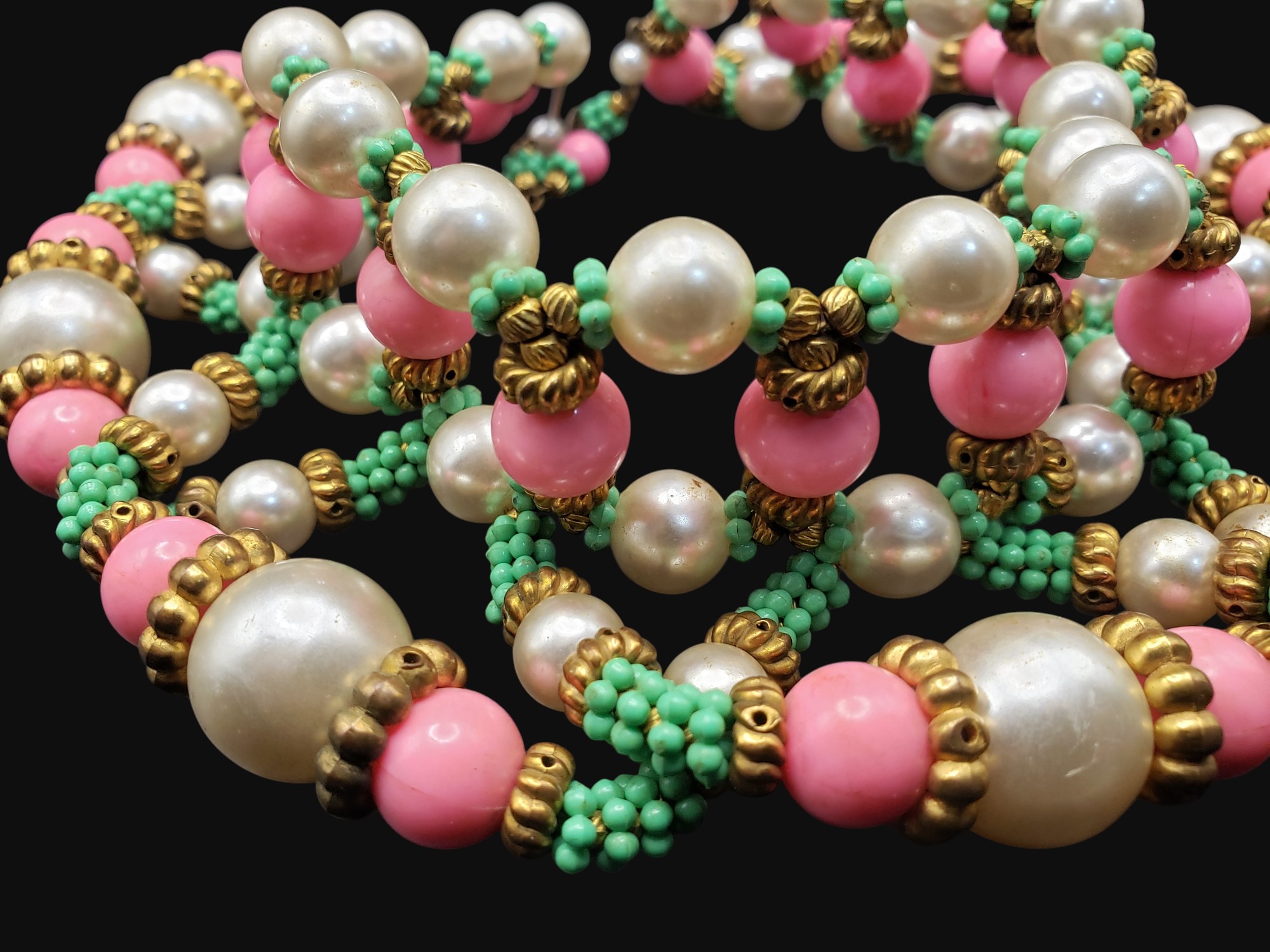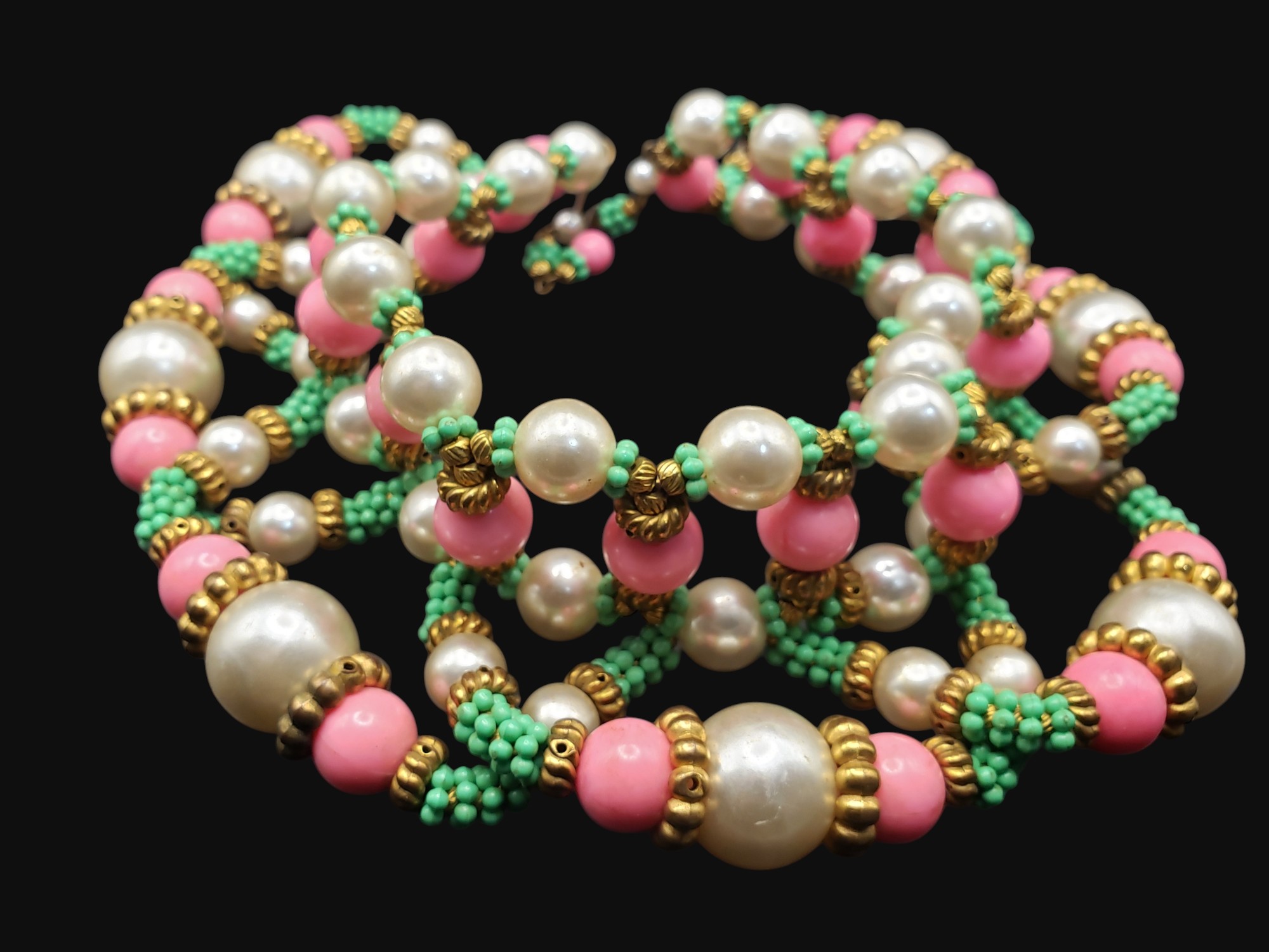 HUGE William DeLillo Egyptian Revival Collar Necklace. Intricate beading of large pearls, green faux turquoise, and bright pink all separated by golden spacers. Measures approximately 15.5″ long and 3″ wide. Unsigned, but I have seen one that was signed “DeLillo”. Excellent condition.