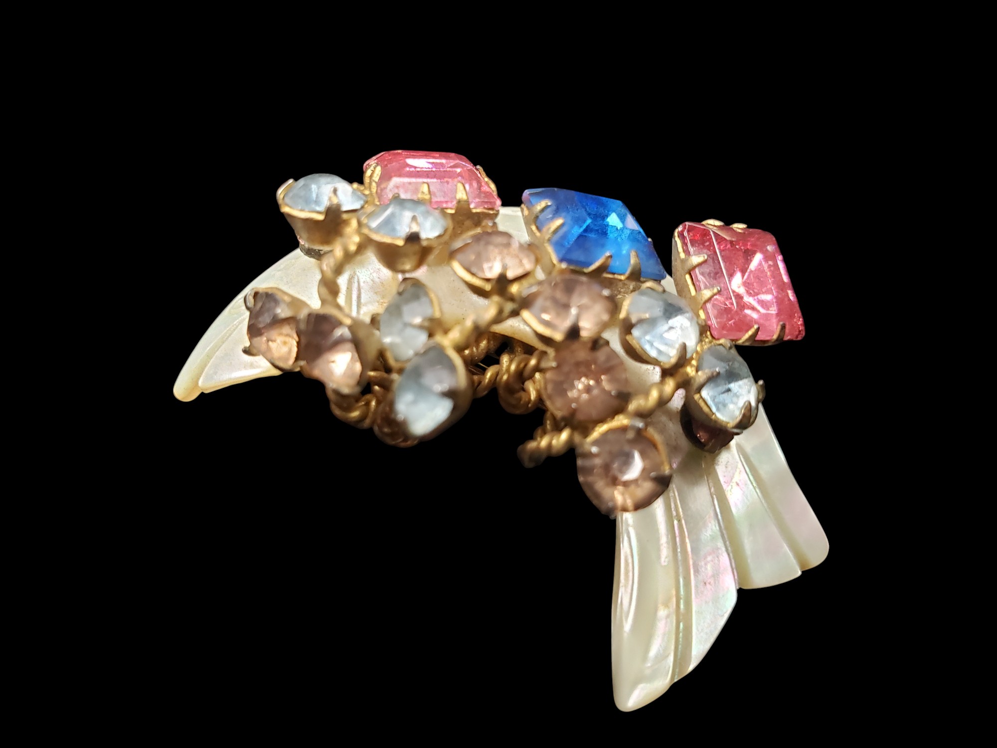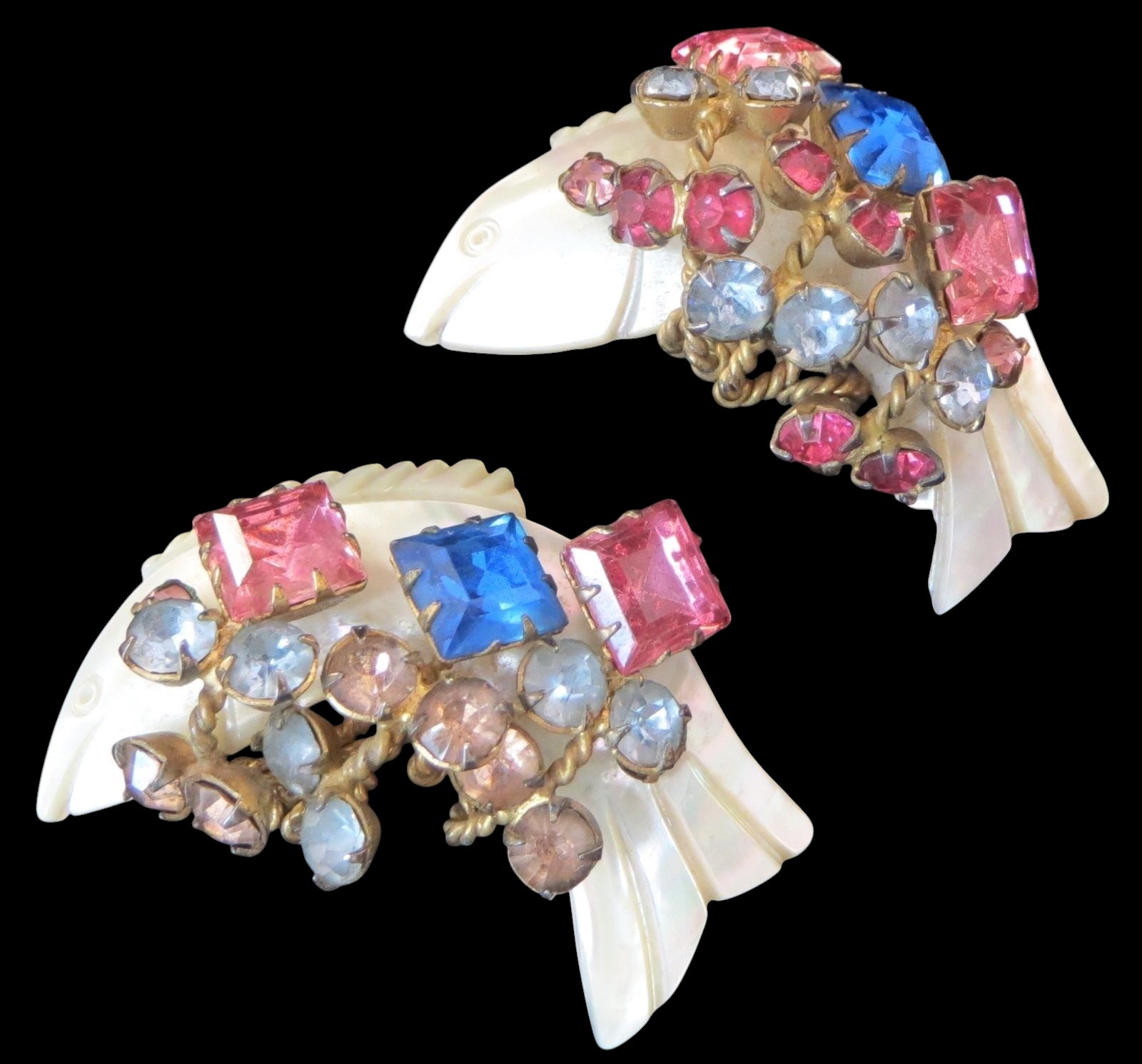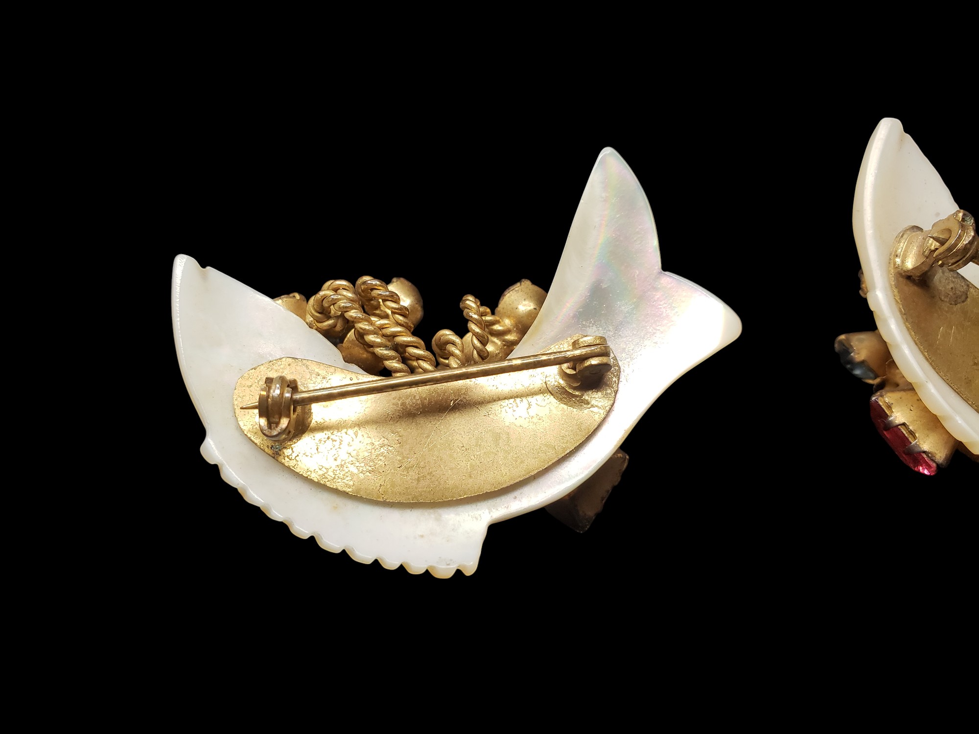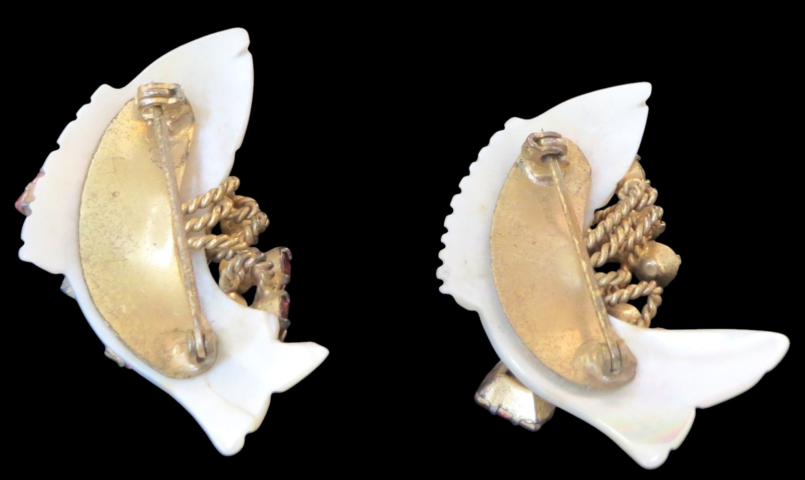 Fabulous RARE Pair of Italian Fish Brooches. I’m positive it is work of Luciana di Roma, famous Italian costume jewelry designer. Gold tone setting with large Mother-of-Pearl fishes adorned by multi-colored rhinestones on twisted wires. STUNNING and UNIQUE BEAUTIES! Each measures almost 2″ by 1″. Unsigned. Excellent condition