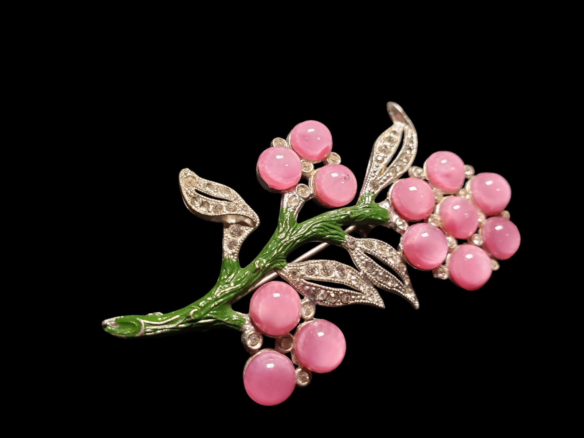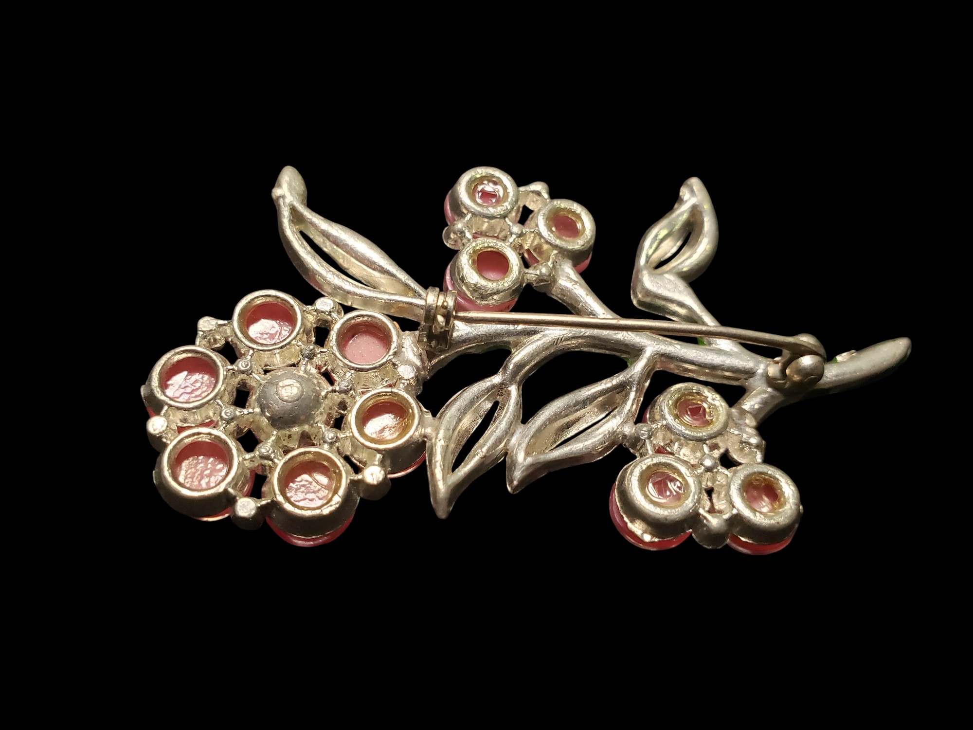 Fabulous Pot Metal Rhinestone Pave brooch with Pink Cabochons. Measures 2 5/8″ by 1.25″. Unsigned. Excellent condition.