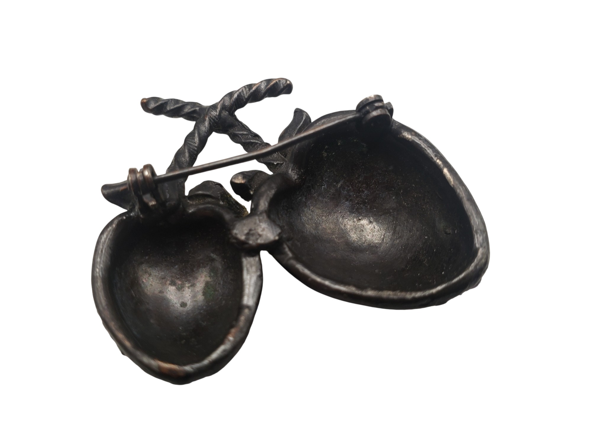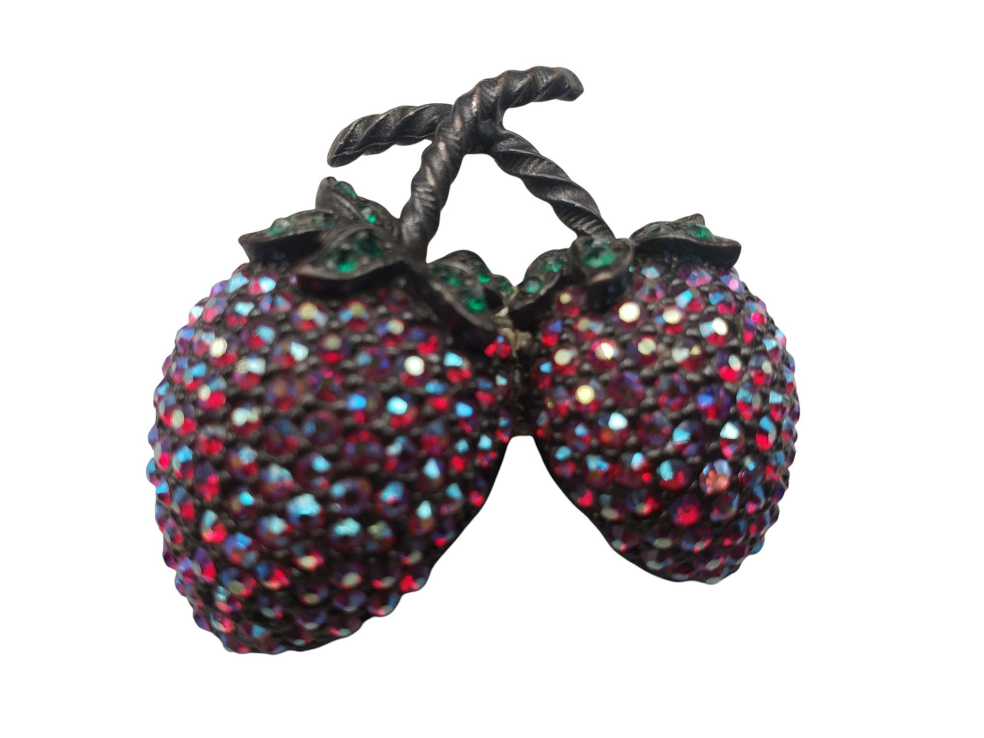 Beautiful double Weiss strawberry pin. Black japanned setting completely covered with bright red Aurora Borealis stones. Leaves are adorned by green sparklies. Pin measures 1 5/8″ by 1 3/4″. Unsigned. Excellent condition.