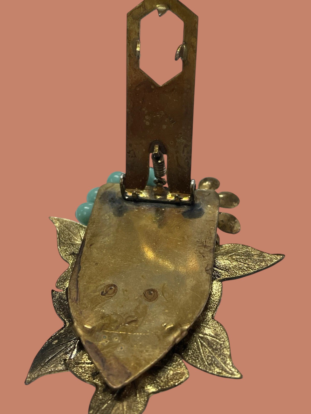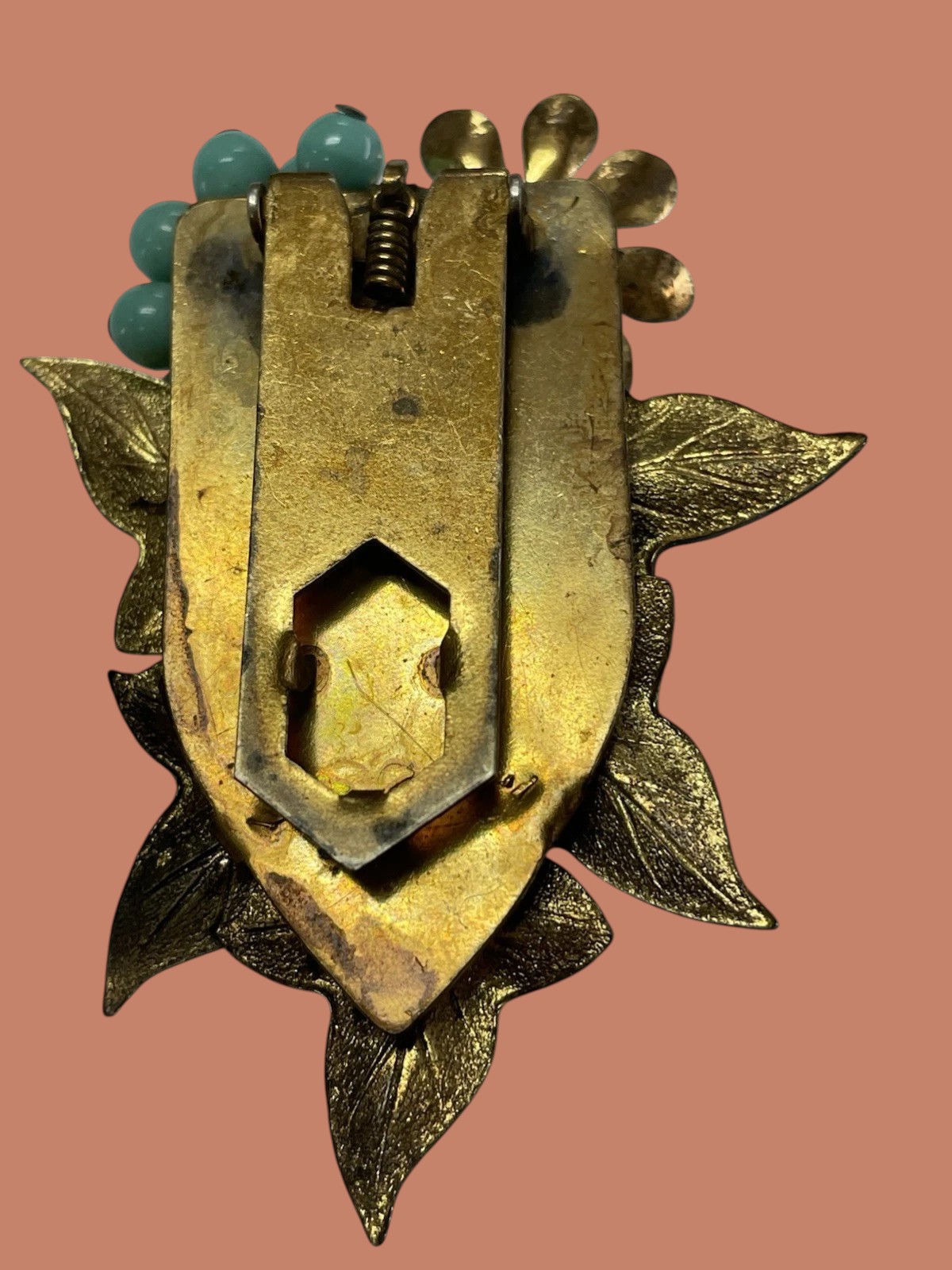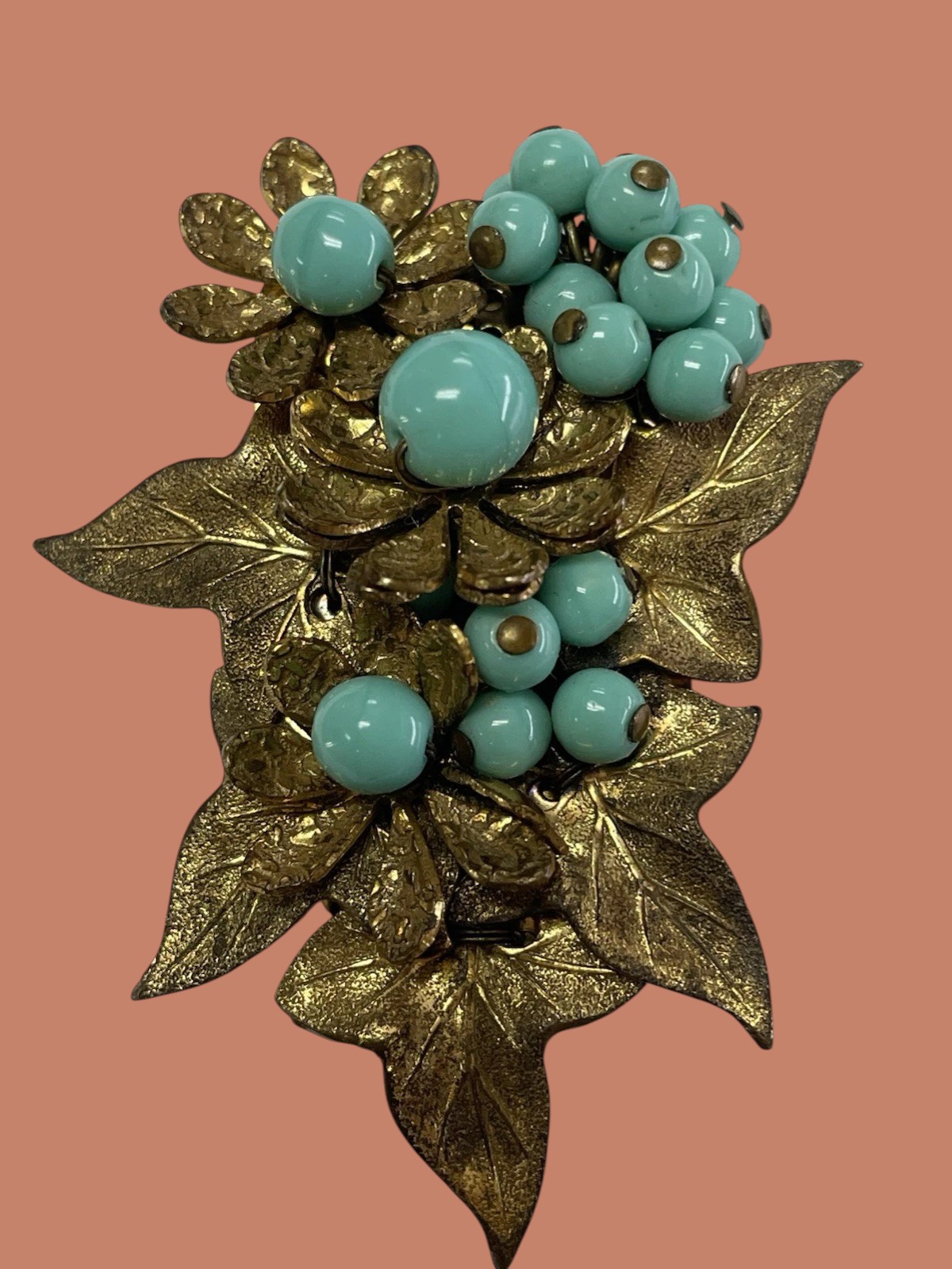 Fabulous early unsigned Miriam Haskell dress clip. Detailed brass leaves and flowers are adorned by faux turquoise glass beads all wired onto the perforated brass setting. The perforated back is covered by a brass cover which is unusual for Haskell pieces. Measures 2.5″; by 1.75″. Excellent condition.