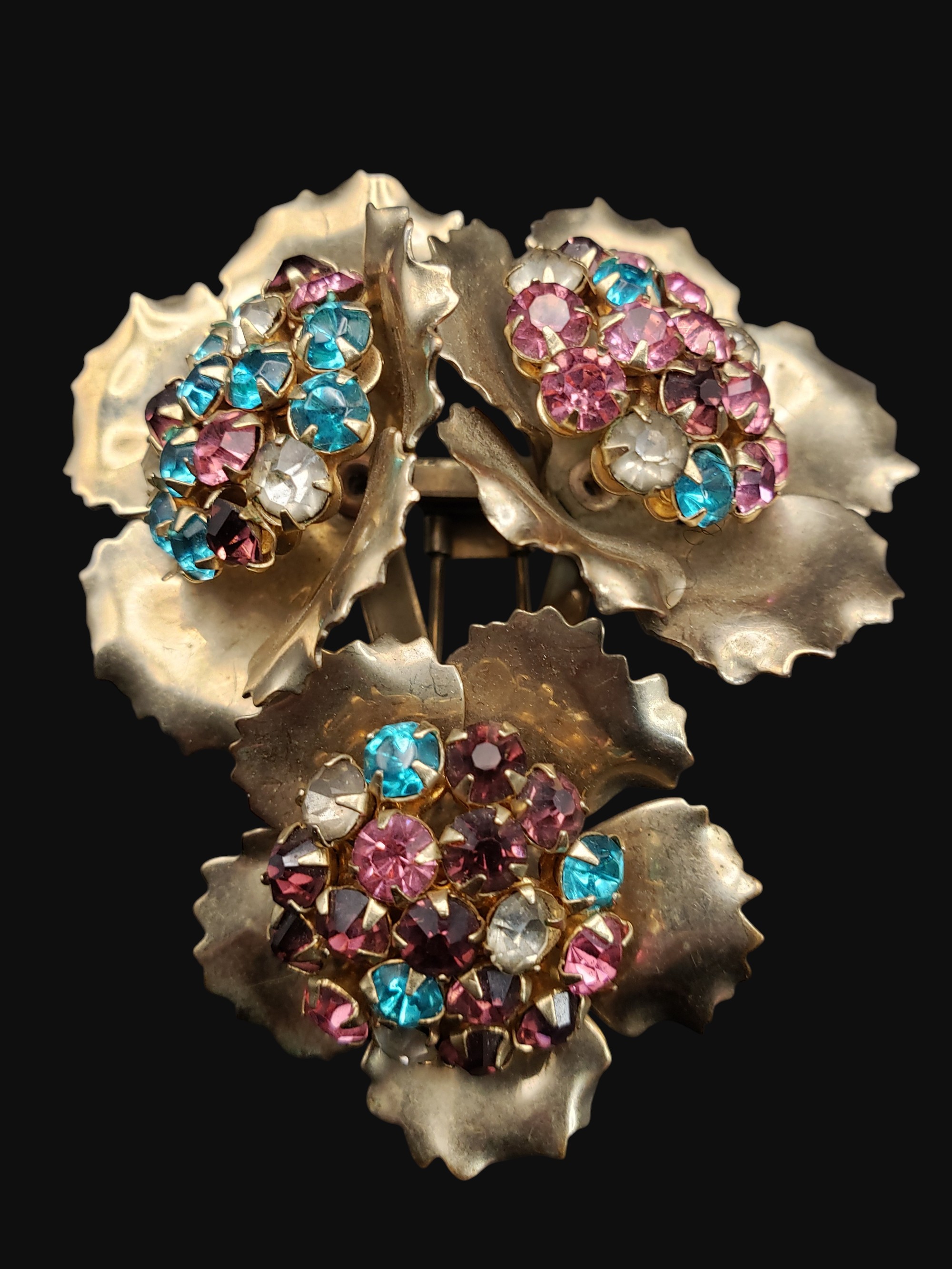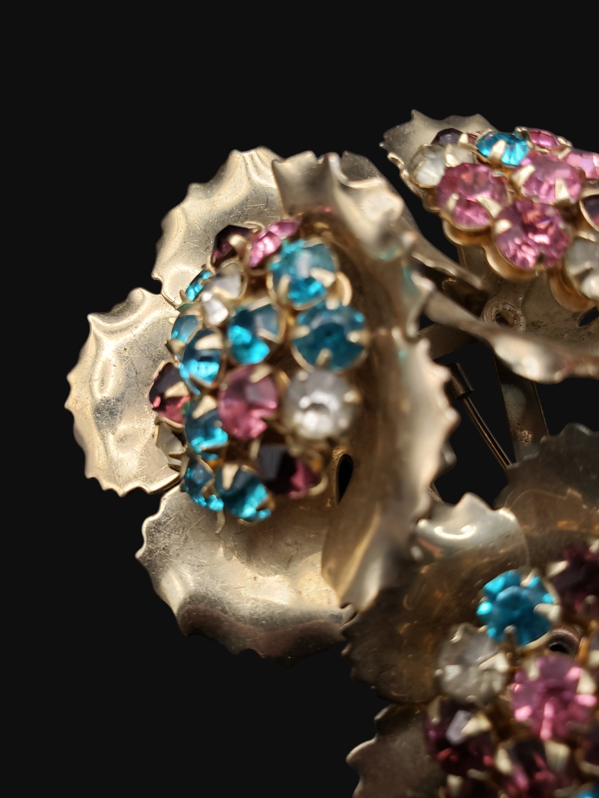 Beautiful and Unusual Rhinestone Fur Clip / Pendant. Golden setting with three clusters of colorful rhinestones in pink, purple, aqua and clear. It is a fur clip, but also has two bails so that it can be used as a pendant. I have never seen this design before. Measures 2 5/8″ by 2.5″. Unsigned. Excellent condition.