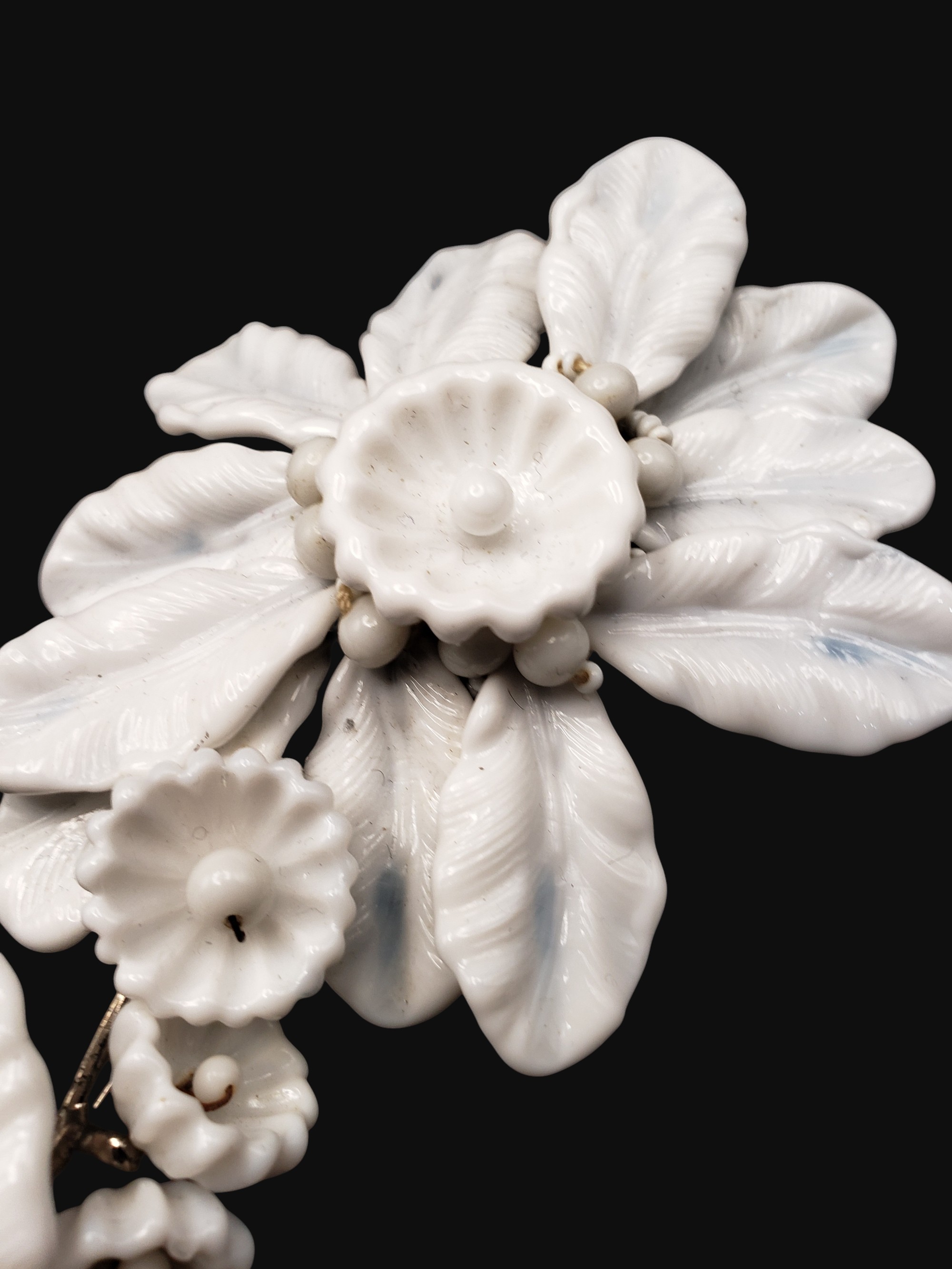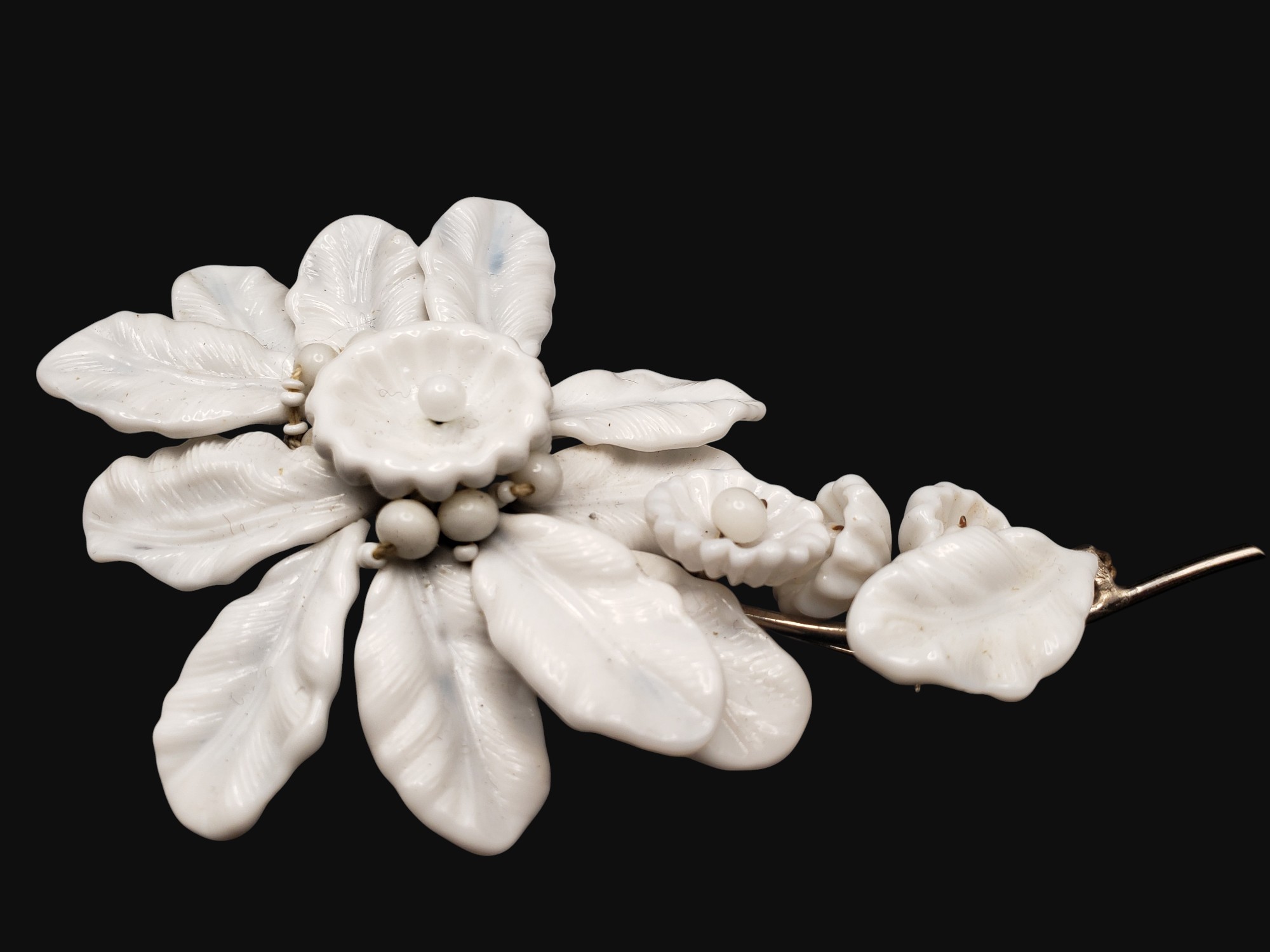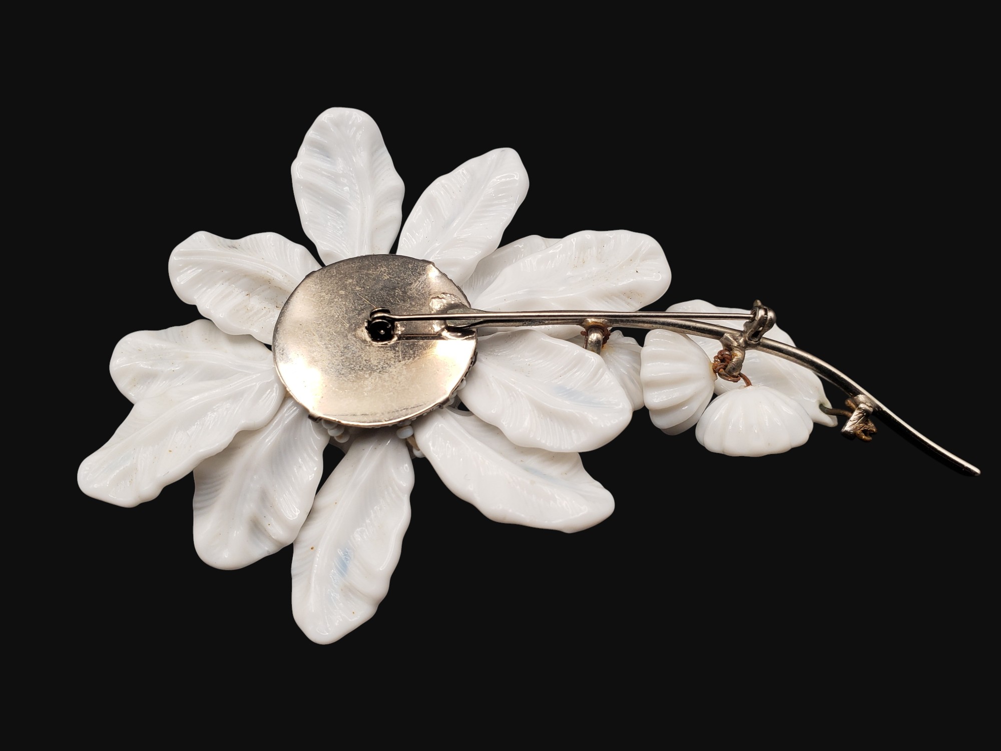 AMAZING and HUGE Miriam Haskell Milk Glass Flower Brooch. The Large flower has perforated backing with silver tone cover. The brooch measure about 5.25″ by 3.25″. It’s a rare find and is coveted by collectors everywhere. Excellent condition.