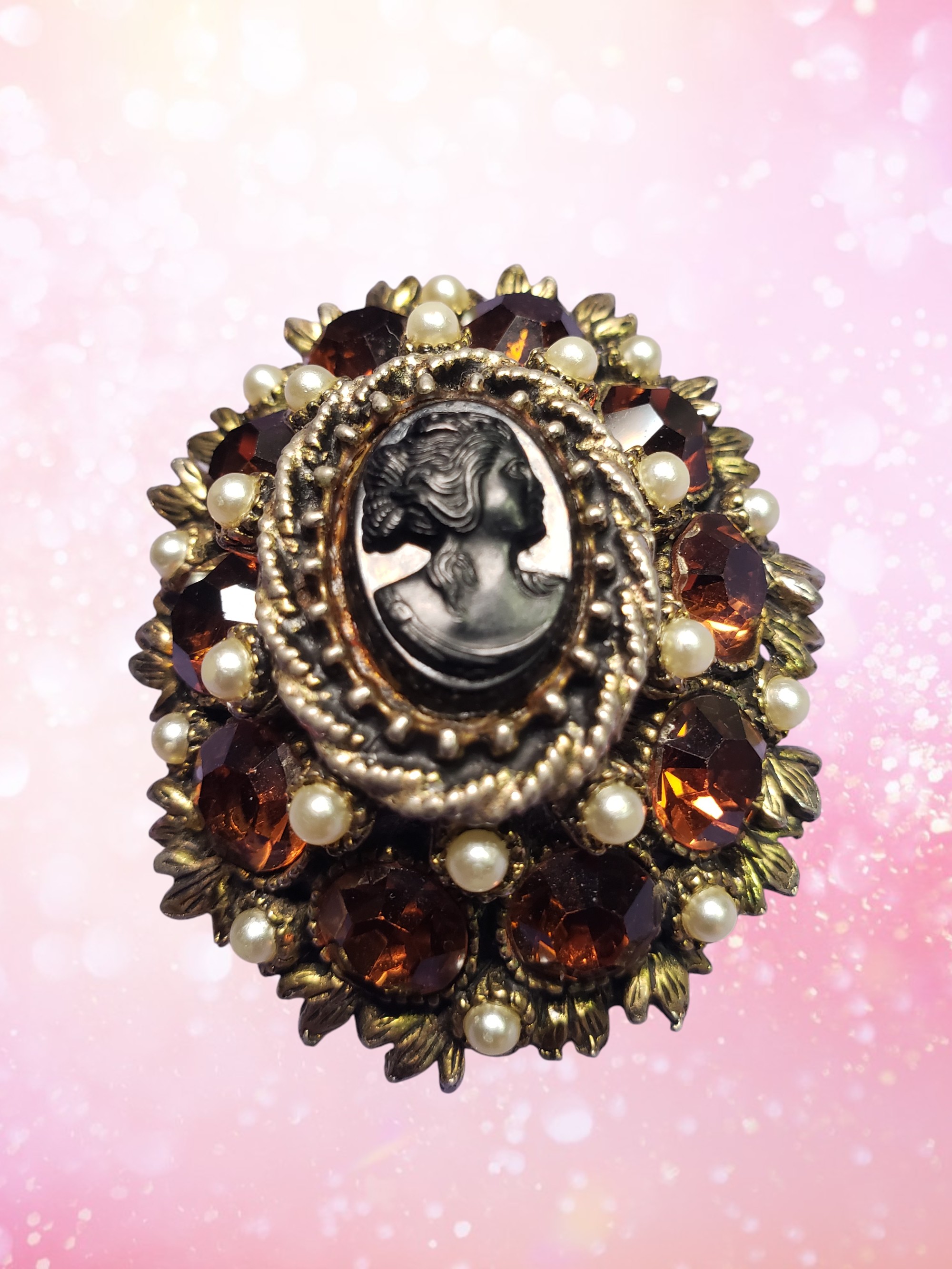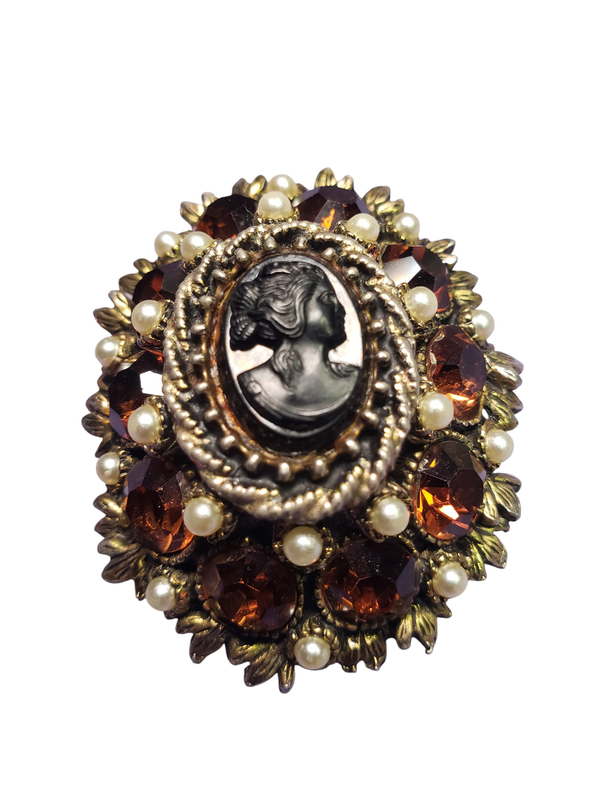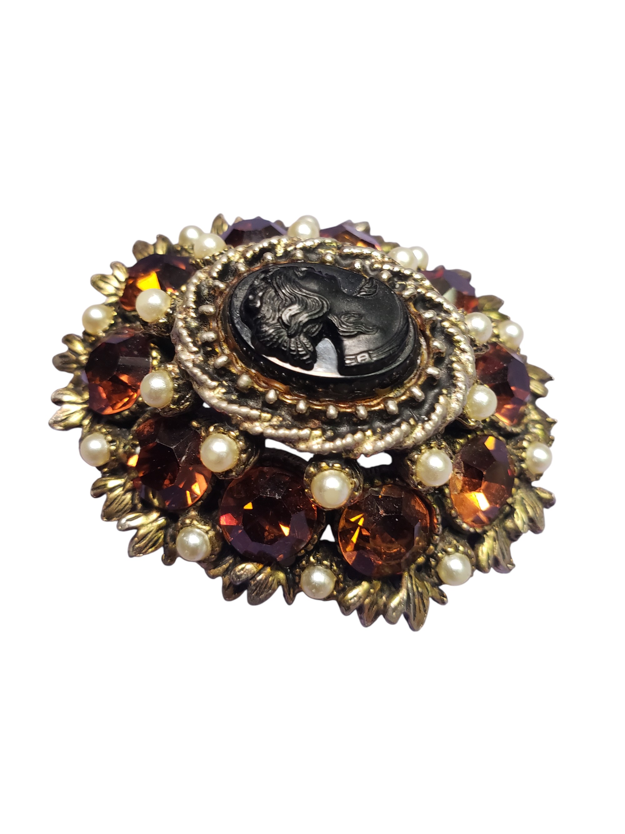 Absolutely gorgeous HAR cameo pin. Set in antiqued gold tone textured finish large deep topaz headlight stones highlighted by seed pearls. The center holds a black oval cameo. Measures 2″ by 1 5/8″, and is 3/4″ high. Signed on the back “HAR” with a copyright symbol. Excellent condition.