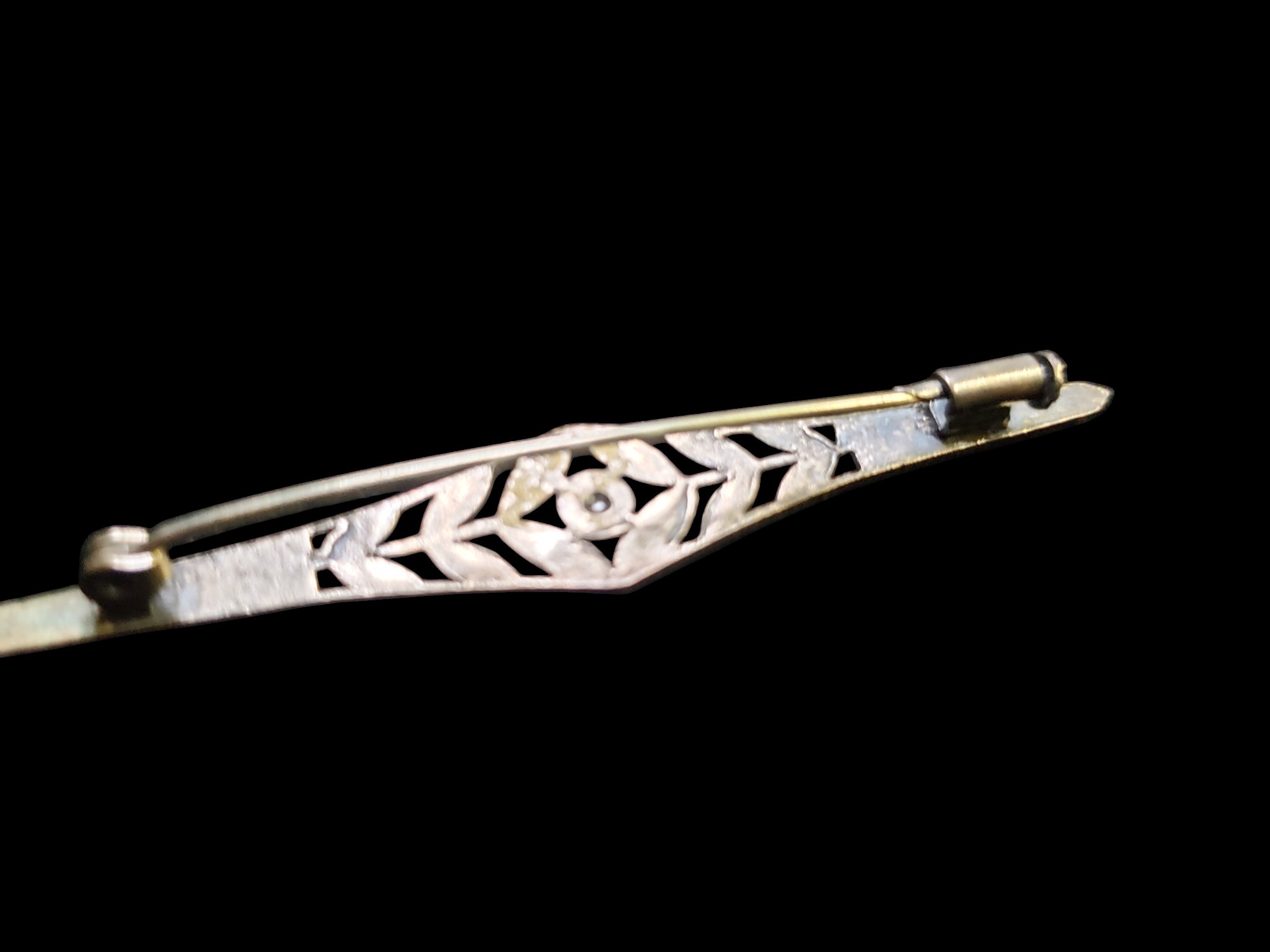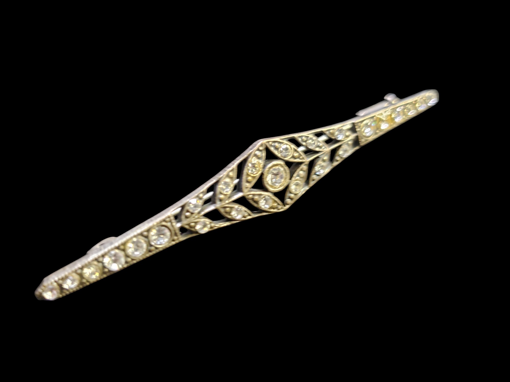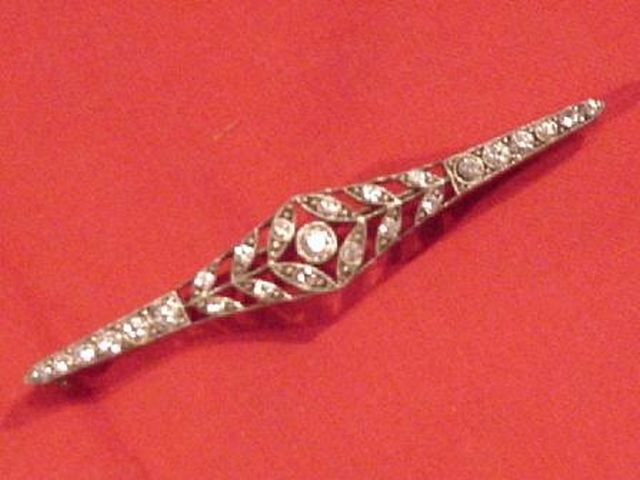Beautiful French paste bar pin. Silver tone setting with clear rhinestones. Typical trombone clasp. Very classy. Measures 2.75″ by about 0.5″. Excellent condition.