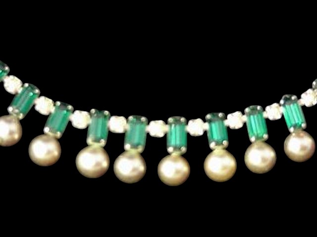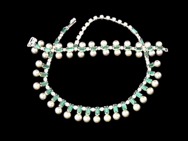 Gorgeous and elegant rhinestone and faux pearls demi parure. It’s very well made and Oh! so beautiful and classy! Necklace has tiny seed pearls at the neck line with green rhinestone baguettes and large faux pearls. Rhodium plated setting. Necklace measures 15″ long and 5/8″ wide. Matching bracelet is 6.5″ long and 3/4″ wide. Pictures do not do it justice. Unfortunately unsigned, but should be. Excellent condition.
