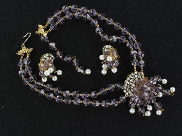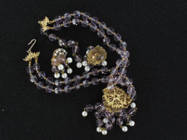 Fantastic faux amethyst crystal necklace and clip on earrings set. Though unsigned, it is attributed to work of Robert. Fabulous centerpiece is suspended on two strands of gorgeous lavender crystals with a delicate golden spacers. The golden filigree centerpiece is adorned by clear rhinestone montees and dripping strands of crystals ending with droplets of faux pearls. It is so charming and feminine! And so hard to find! Necklace measures 16.25″, the center is 2.5″ by 1.25″. Matching earrings are 0.75″ by 1.25″. Excellent condition.