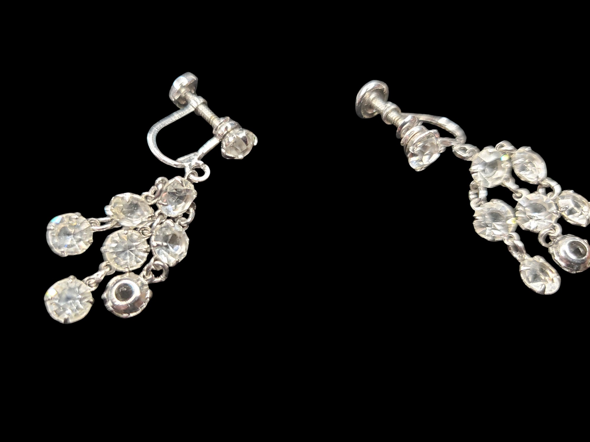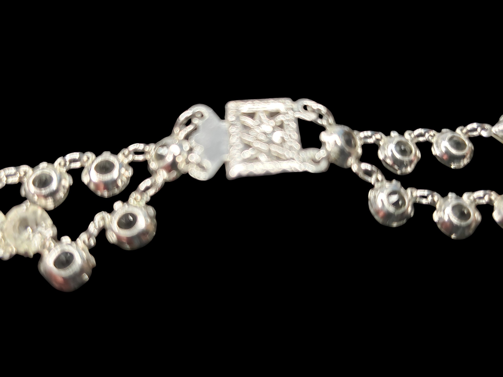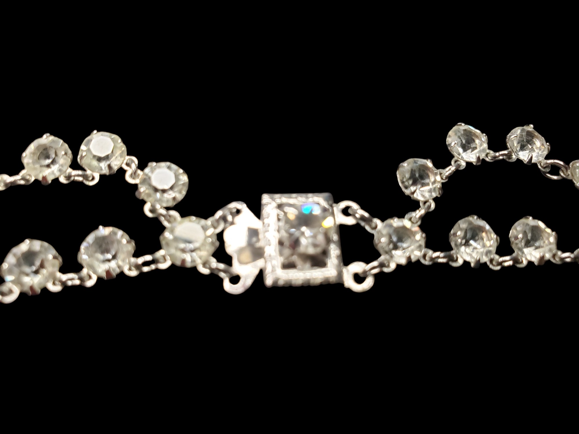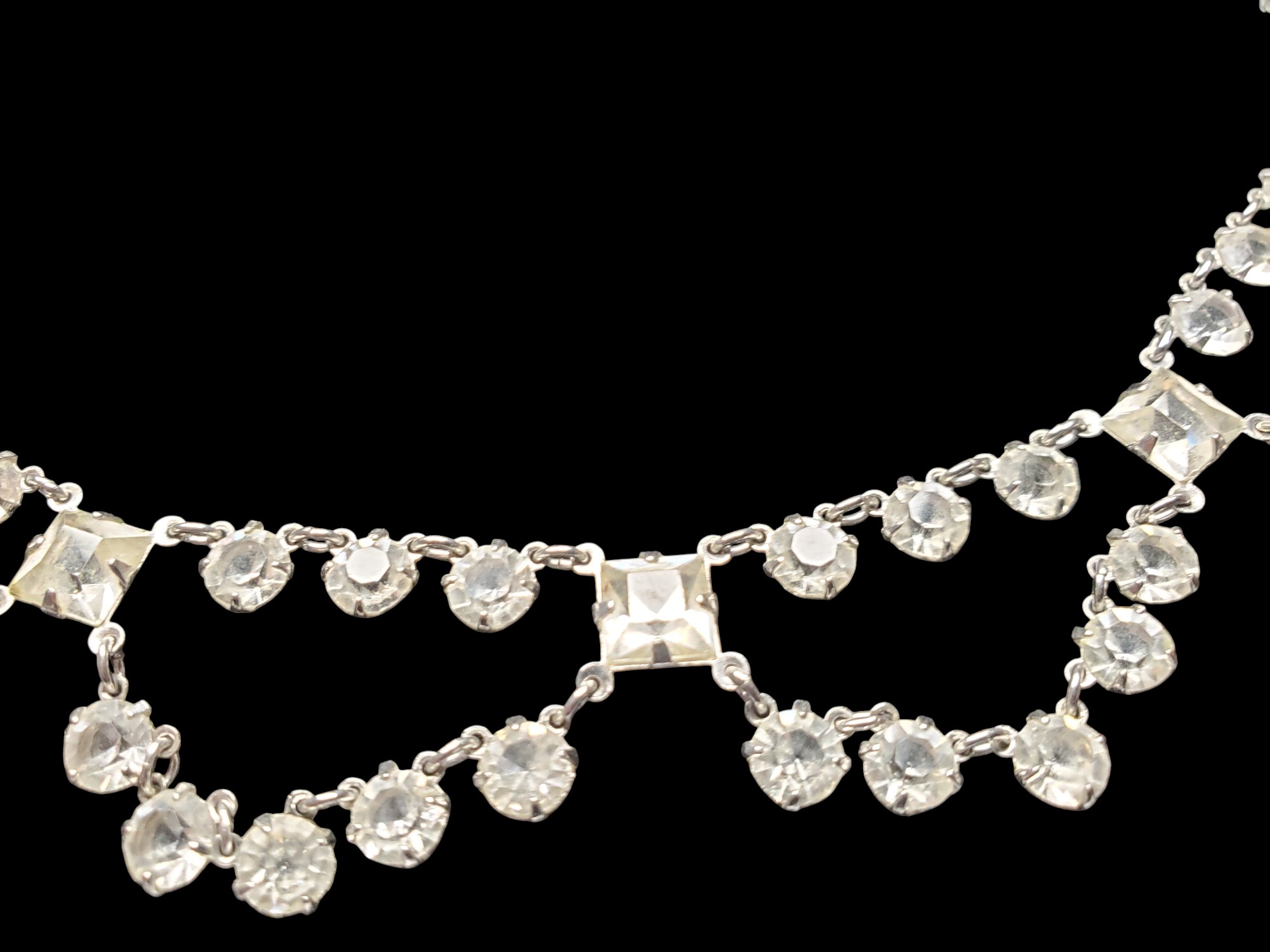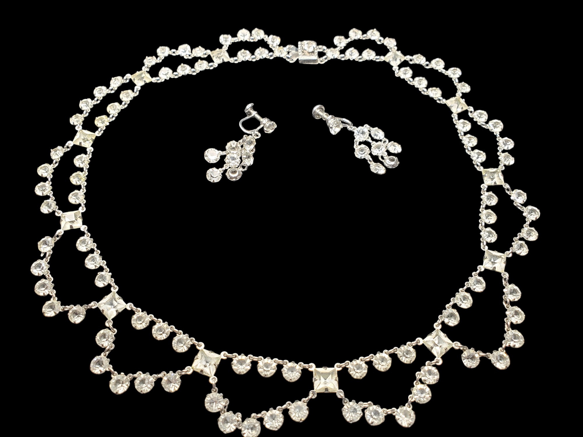 Beautiful Classy Art Deco Collar Necklace / Earrings Set. Crystal clear unfoiled stones are set in silver tone metal. It’s good for any age and any special occasion. Always in style. The necklace measures 15.75″ long and 1″ wide in the center. The lovely dangling screw on earrings are about 1.25″ long and 1/2″ wide. Excellent condition.