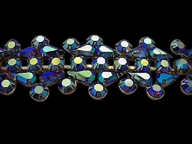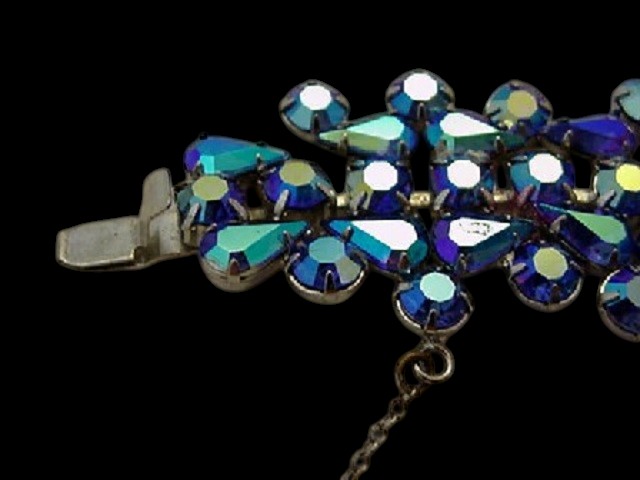 Gorgeous blue Aurora Borealis stones bracelet. Sherman style, but unsigned. Silver tone setting. Has a safety chain. Measures 7.5″ long and about 1.25″ wide. Excellent condition.