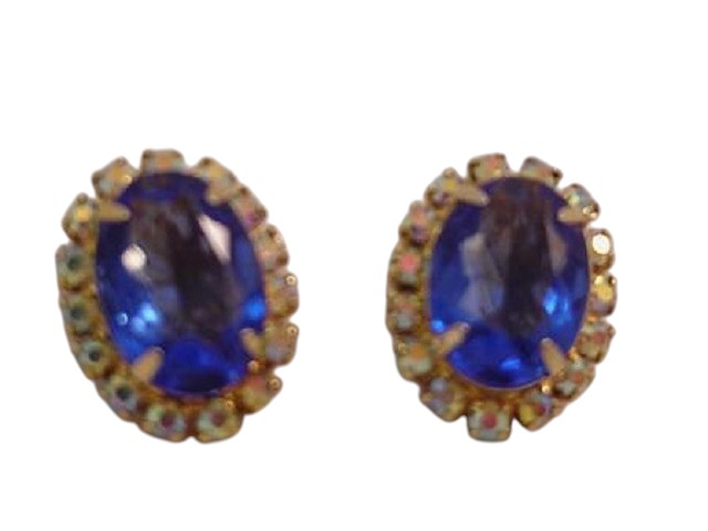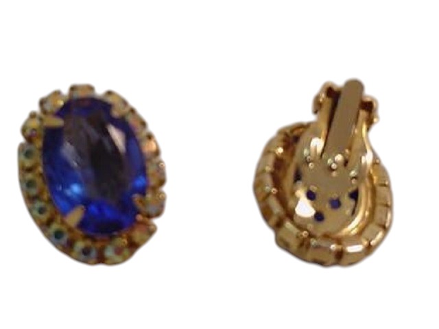 Beautiful rhinestone clip on earrings. Large faux sapphires in the center are surrounded by yellow Aurora Borealis chatons. Gold tone setting. Measure about 1″ by 3/4″. Excellent condition.