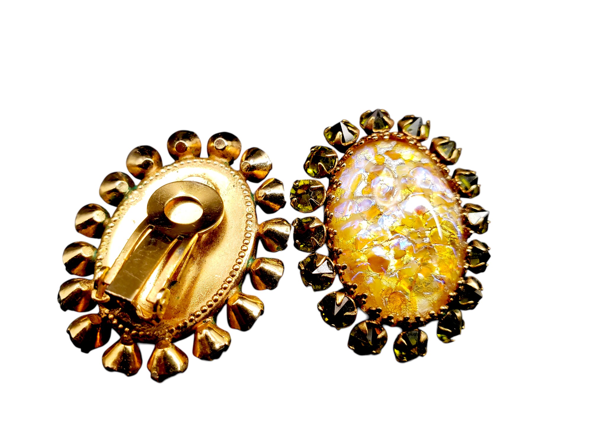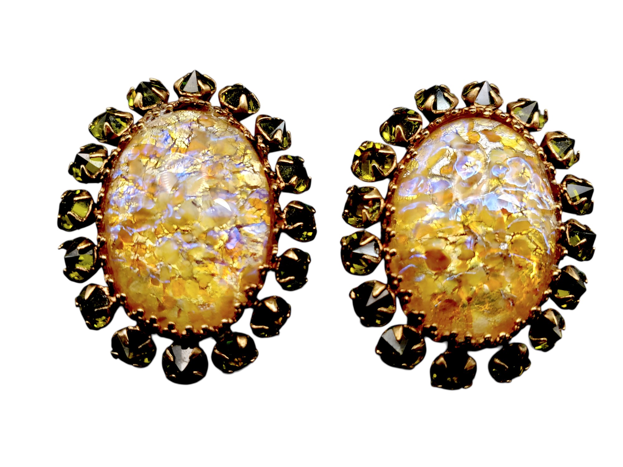 Gorgeous unsigned Schreiner Foiled Confetti Cabochons clip on earrings. Center foiled confetti huge (1″ by 0.75″) cabochons are surrounded by by olivine inverted stones. Gold tone setting. Measure 1.25″ by 1″. Unsigned. Excellent condition.