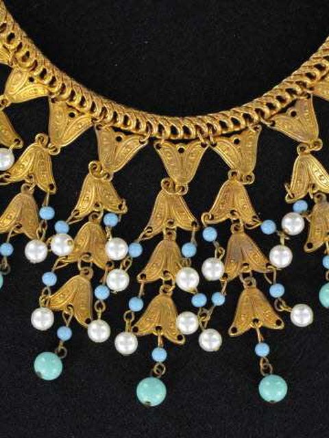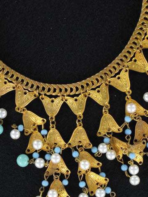Marvelous Bib Necklace with Blue Glass Charms. Golden setting with faux pearls and baby blue glass charms. Measures approximately 16″ long and 3.5″ wide in the center. Excellent condition.