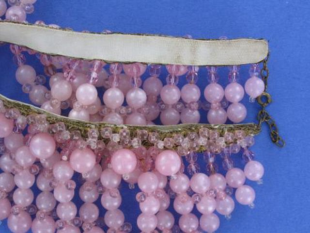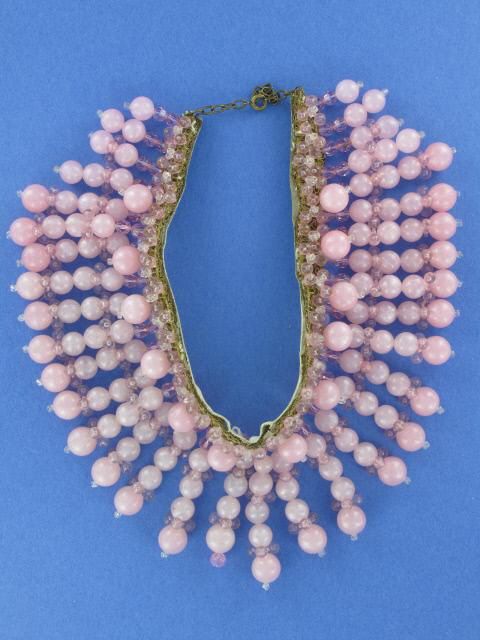 Stunning collar necklace. This necklace is not signed but has the quality in design detail and construction as a piece by Leni Kuborn-Grothe. It is made of pink plastic lucite beads and small pink crystals suspended from golden ribbon. White leather backing. truly unique piece! Measures 15″ long and 2 3/8″ wide. Excellent condition.