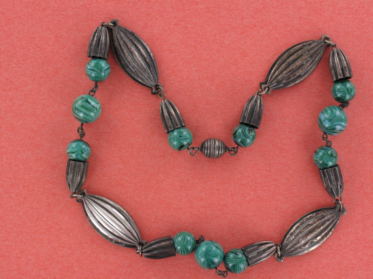 Fabulous French Art Deco style necklace. Unsigned, but easily recognized as beautiful work of the French designer Louis Rousellet. Gorgeous malachite glass beads and metal pieces create this stylish jewelry. Typical French round screw in clasp. Measures 17.5″ long. Excellent condition.