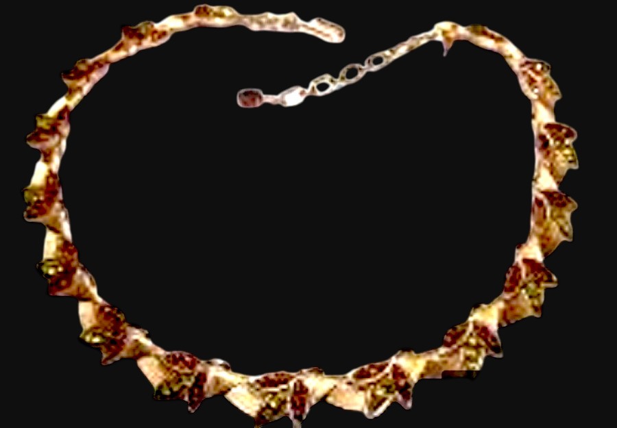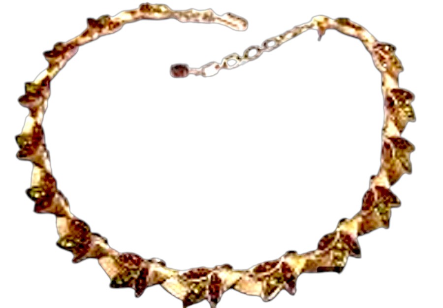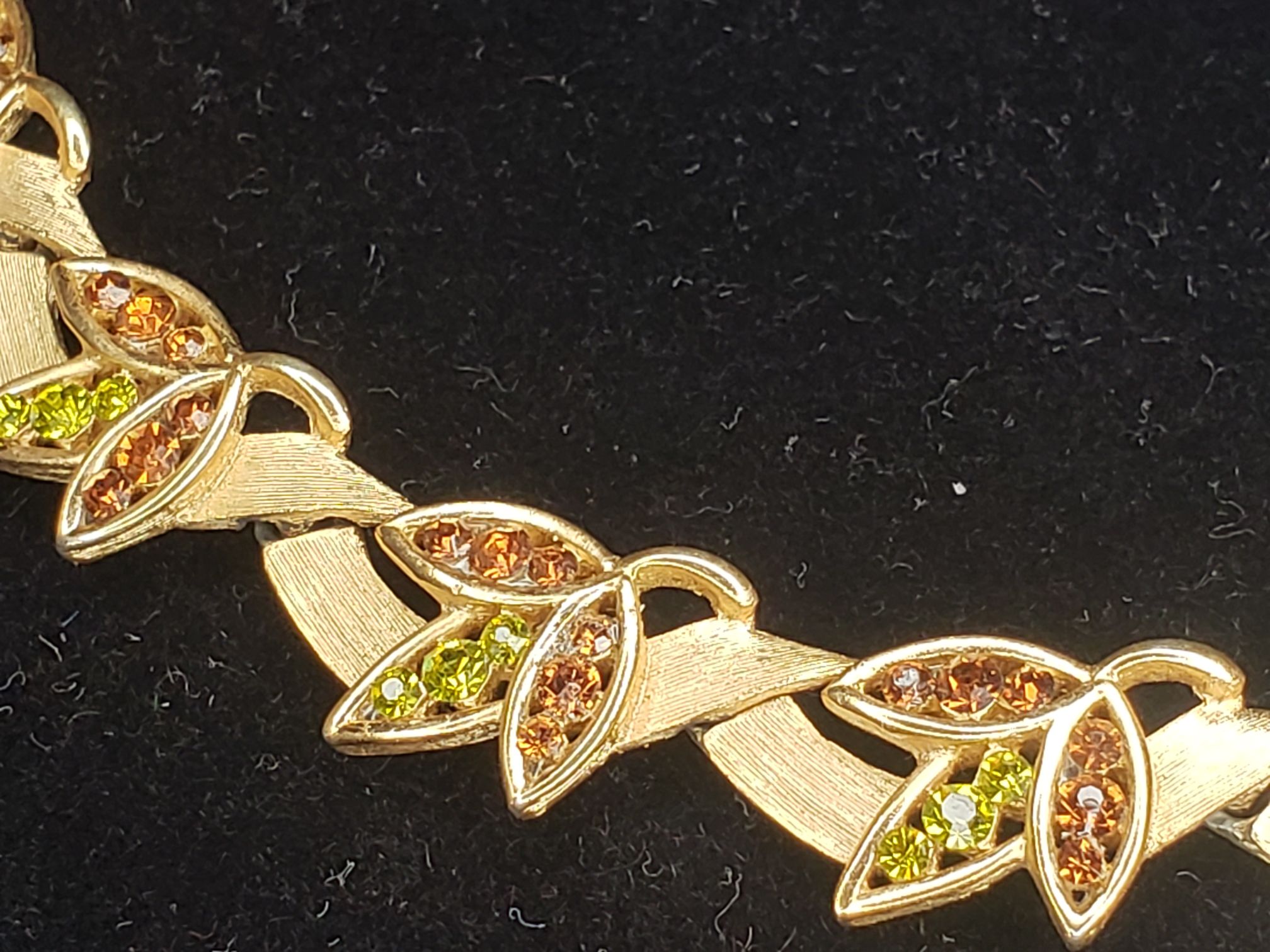 Crown Trifari Rhinestone Collar Necklace. Brushed gold tone setting with root beer and peridot green colored rhinestones. Measures 15″ long and 0.5″ wide. Has a “T” hang tag and signed “Trifari” on the hook. Excellent, practically mint condition.