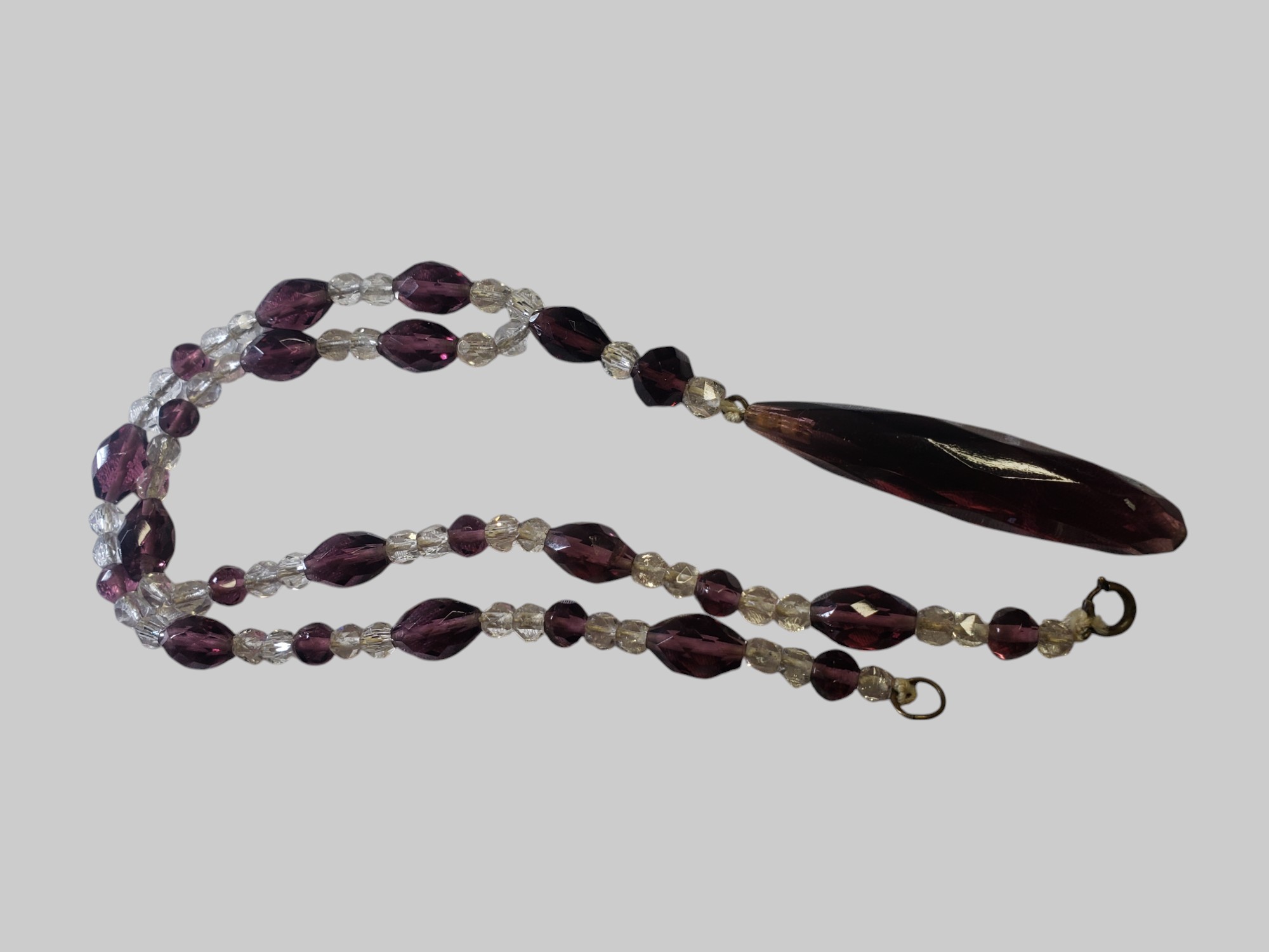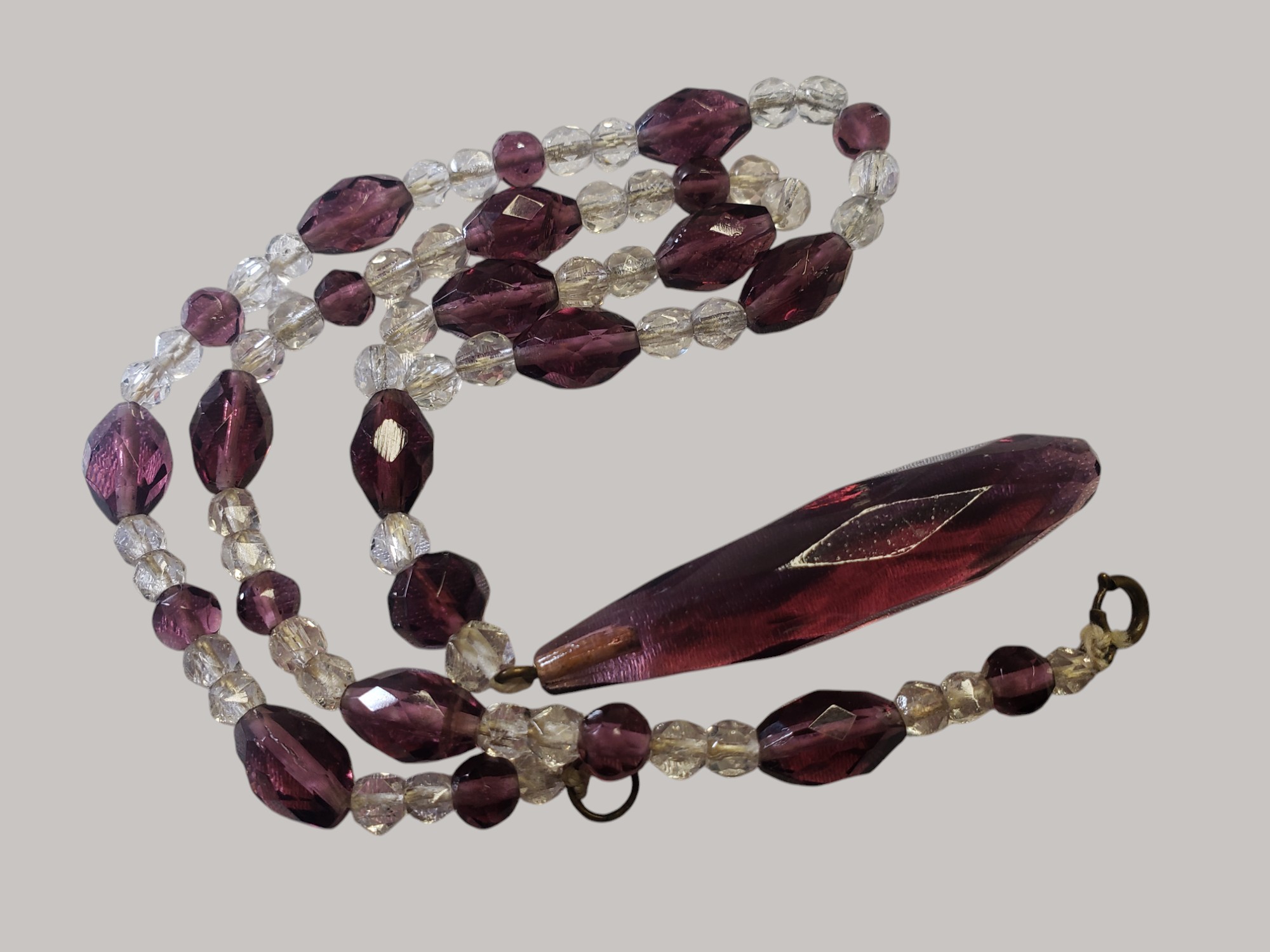 Lovely Czech Clear and Purple Crystals Pendant Necklace. Measures about 19″ long and pendant is about 4″ (just the big purple drop is 2.25″ long). Excellent condition.