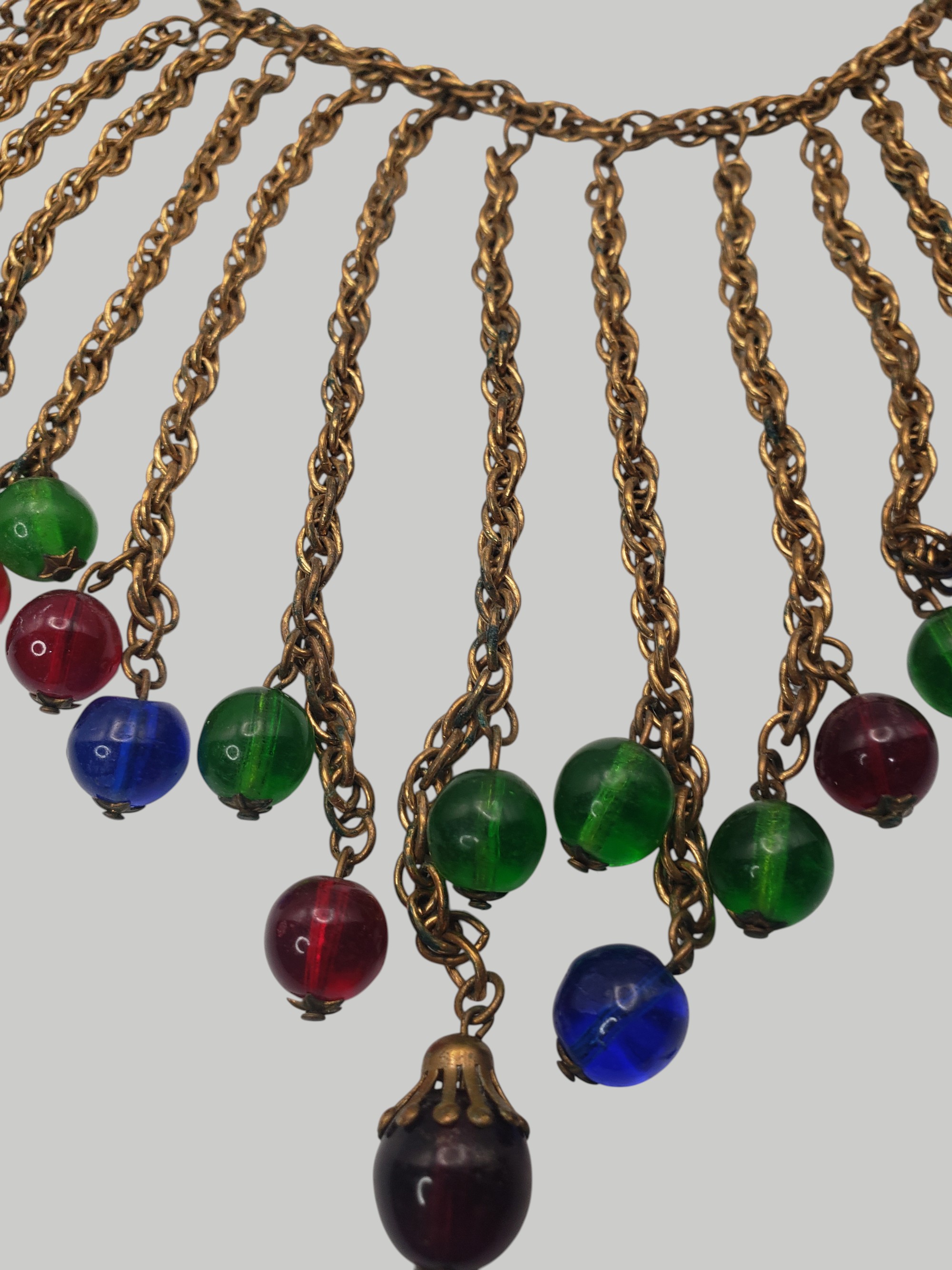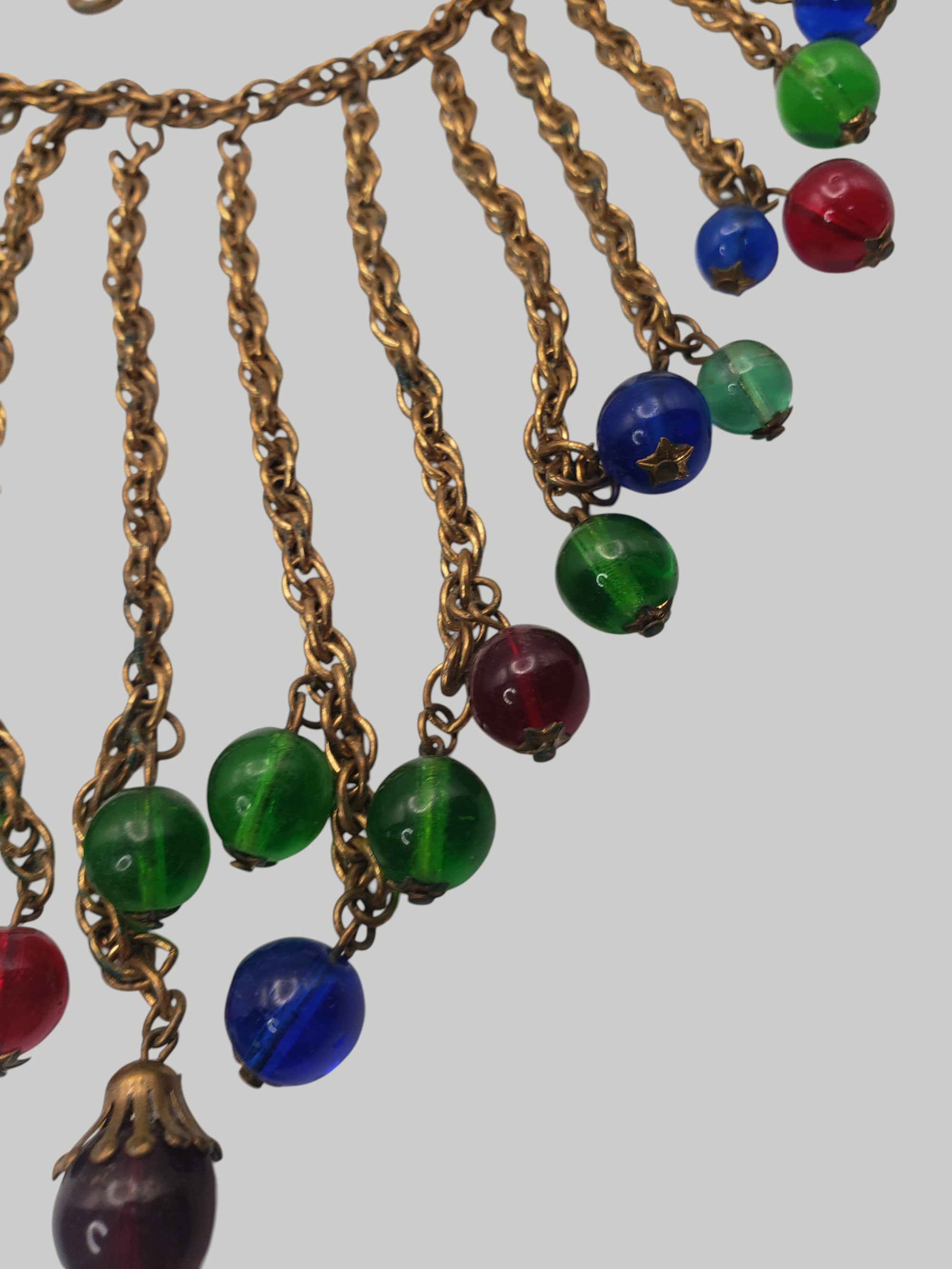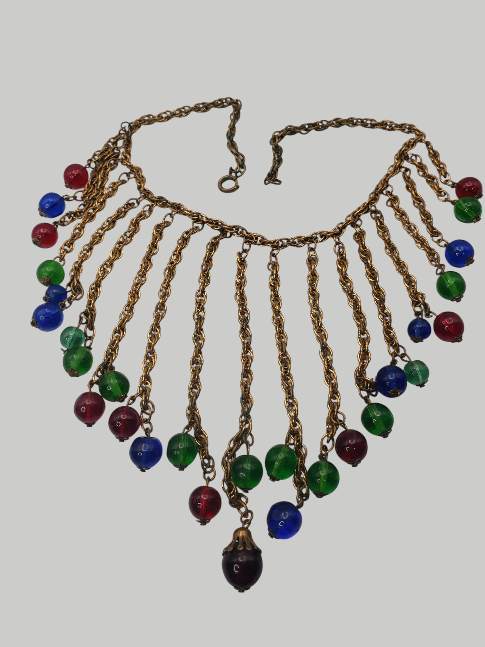 Fabulous Early Miriam Haskell Bib Necklace. Golden setting with colorful large glass beads. Measures 15″ long and 5″ wide in the center. Unsigned. Excellent condition.