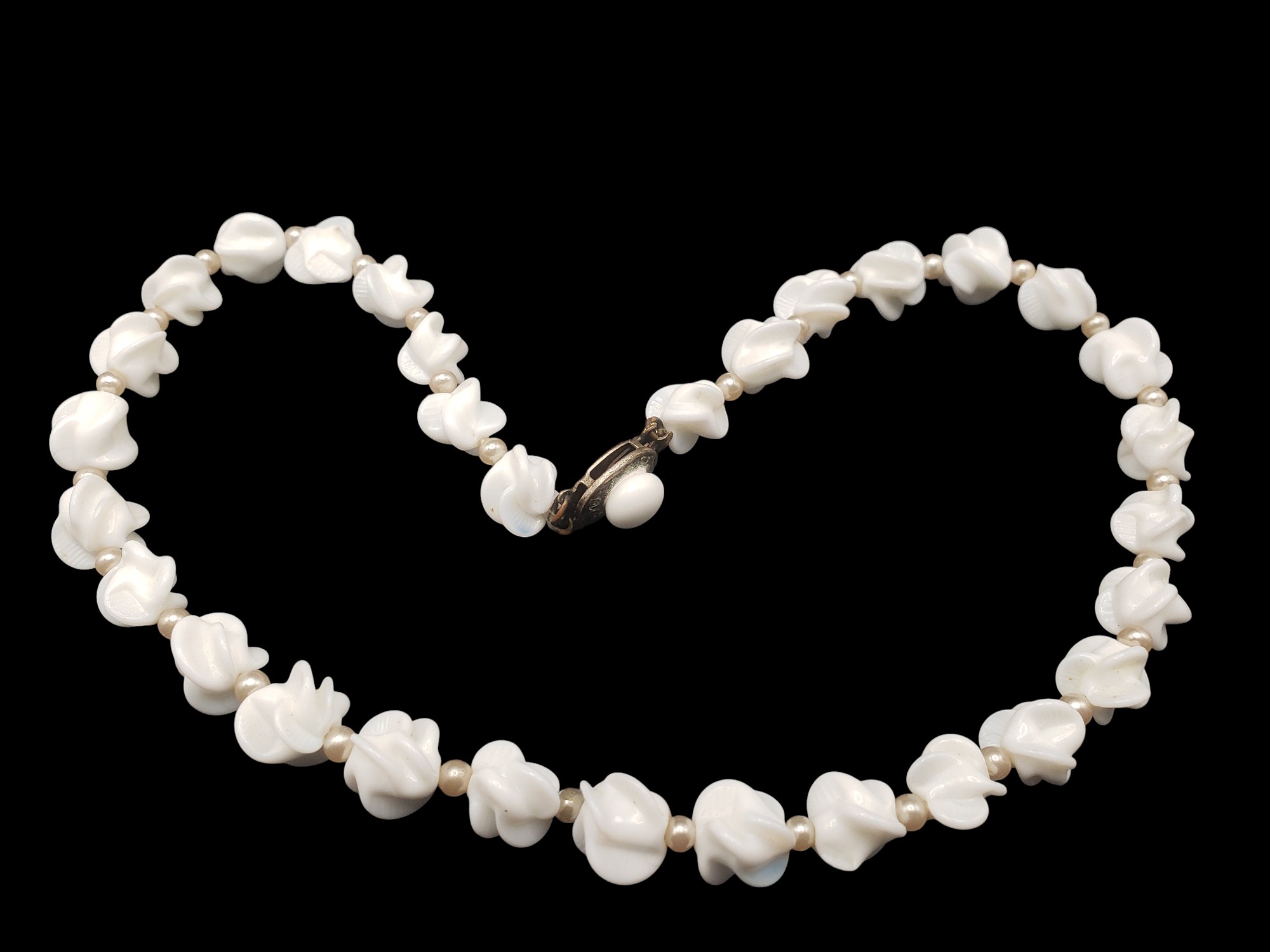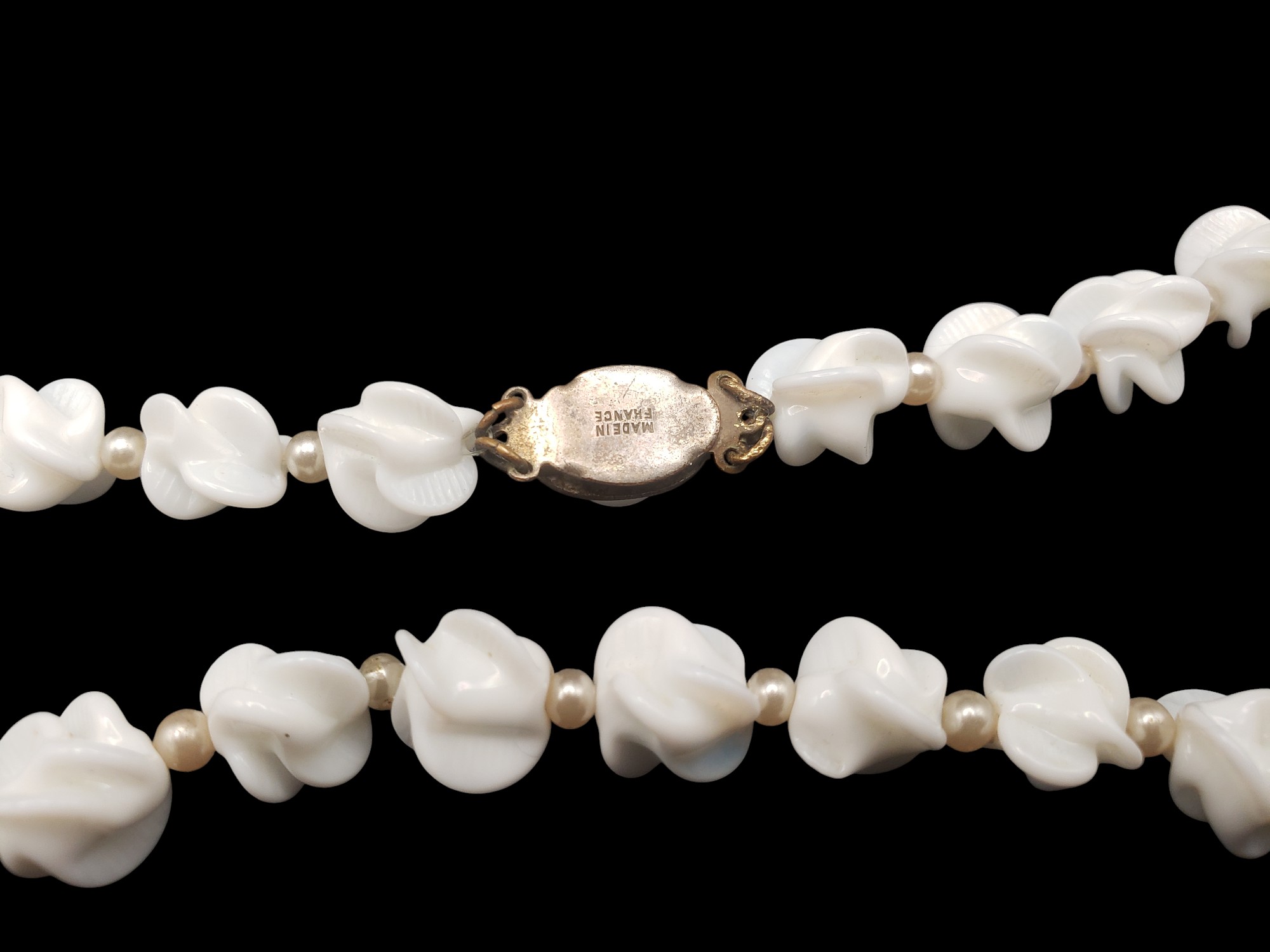 Lovely French Louis Rousselet milk glass necklace. Milk glass ruffled beads with the silver tone clasp also adorned by milk glass bead. Clasp is signed ” Made in France”. Necklace measures 16.25″ long. Excellent condition.