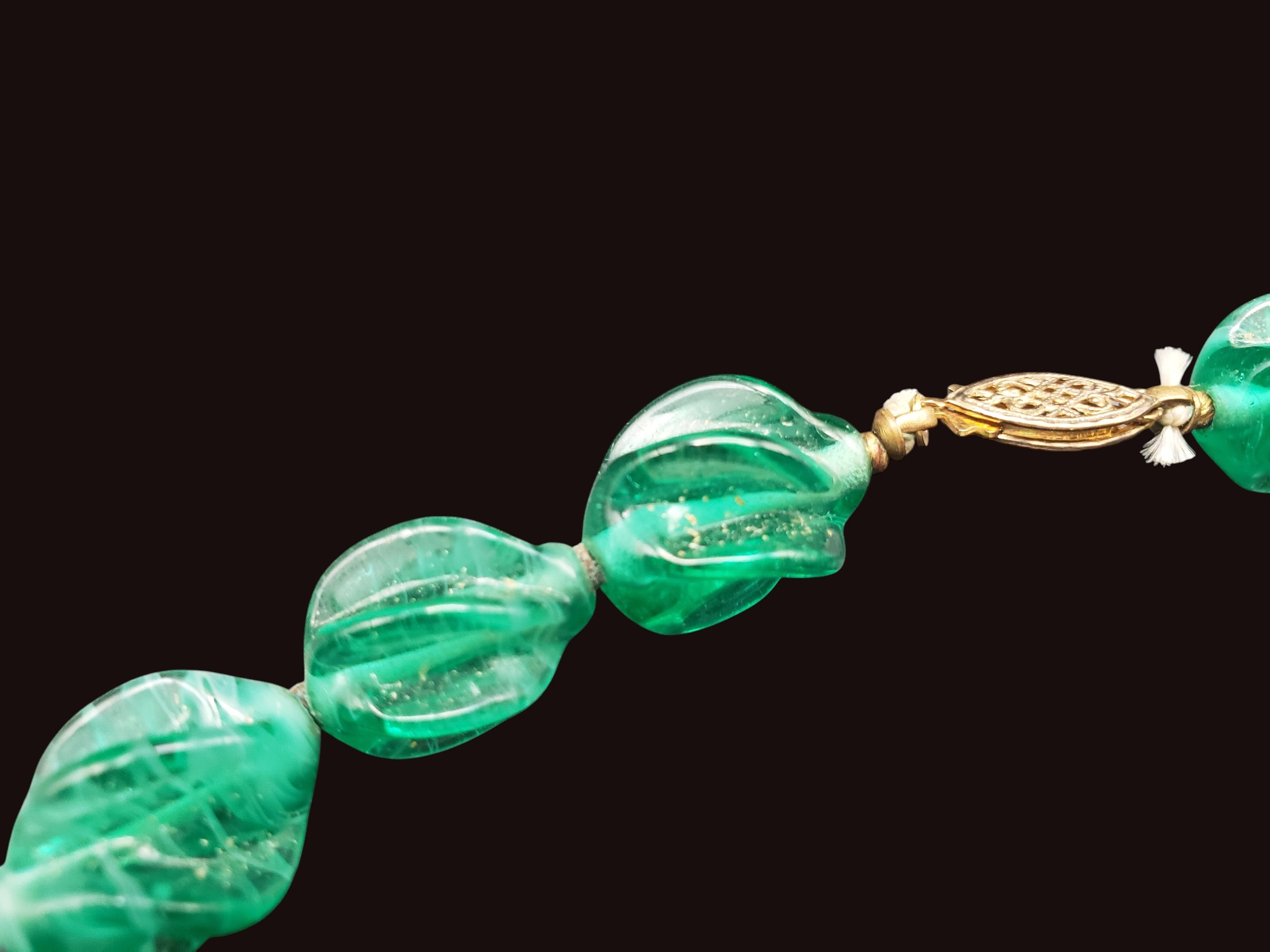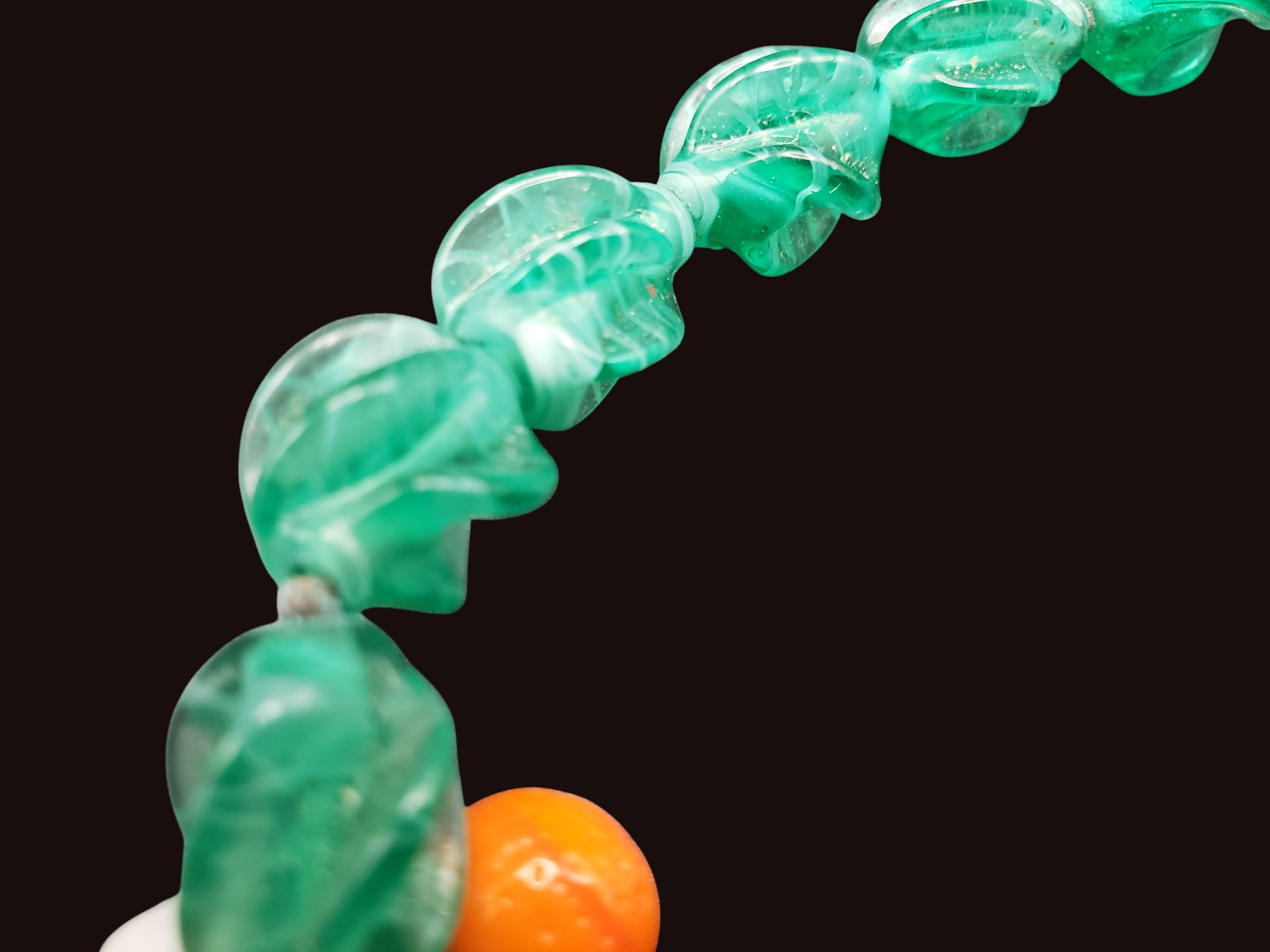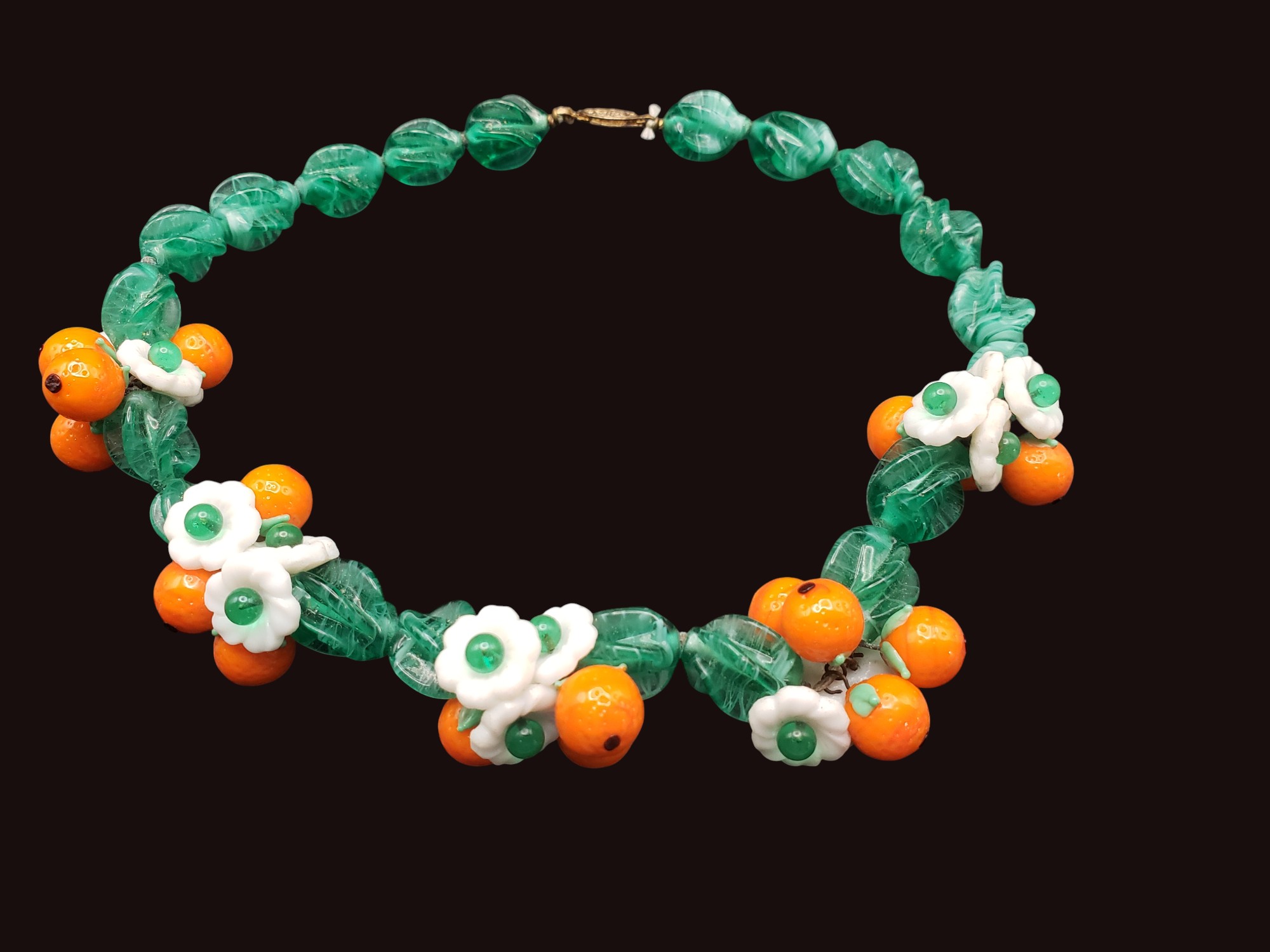 Superb Italian or possibly Frenchglass fruit necklace. Beautiful green with white stricks (flawed emerald) ruffled glass (this kind of glass was used by French designer Louis Rousselet) with bunches of bright colored oranges and small white flowers. Oranges look so real with tiny green leaves. The colors are unbelievable! Golden clasp. Measures 15″ long. Excellent condition.